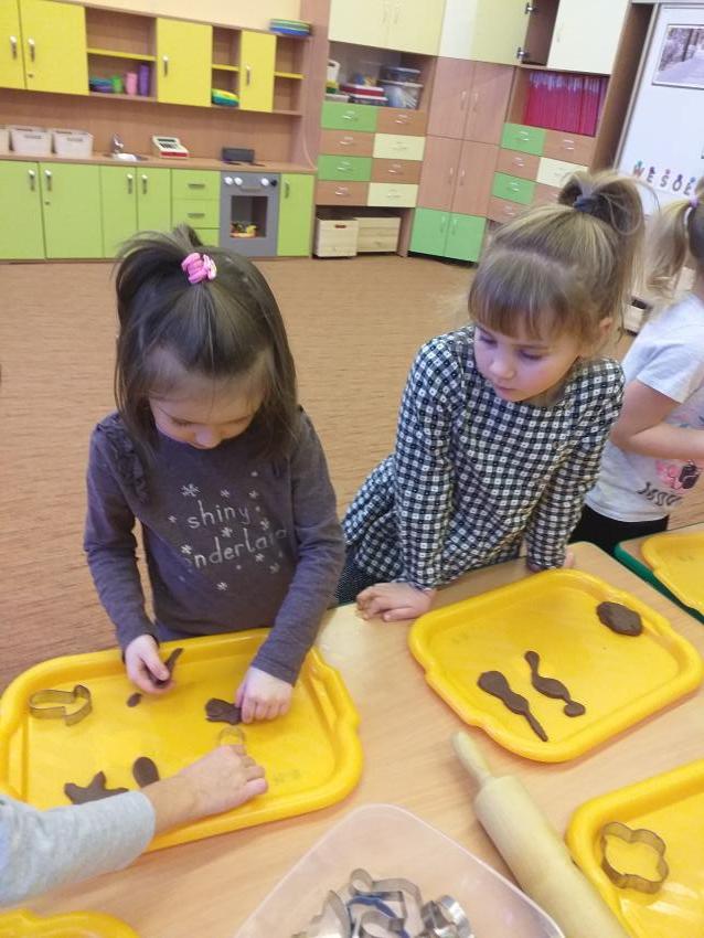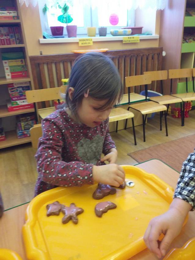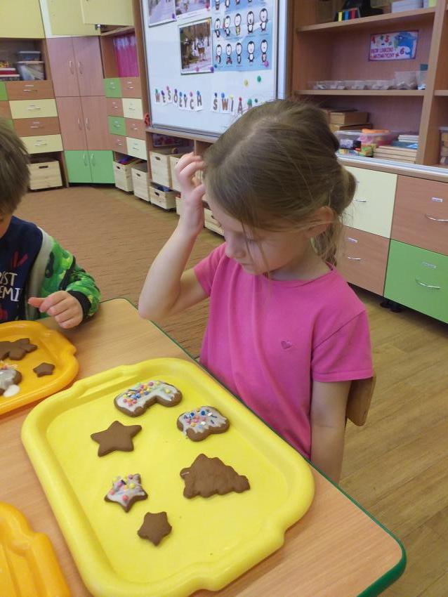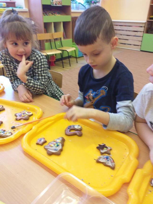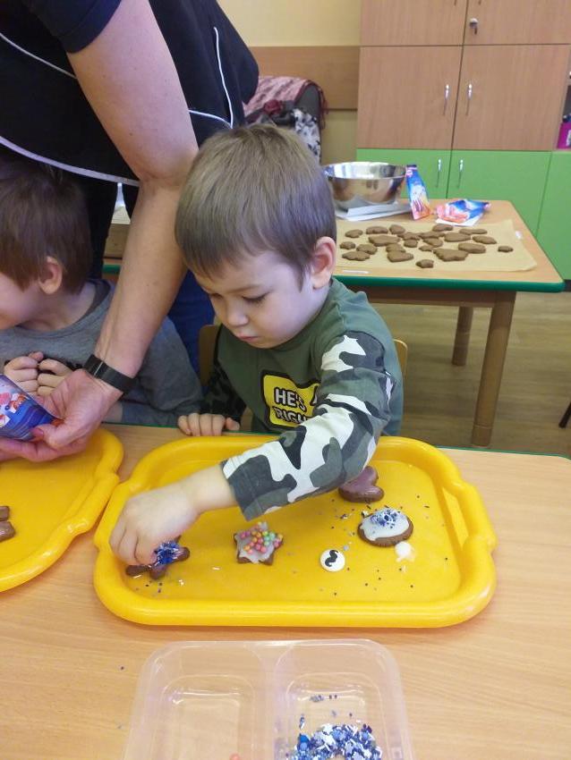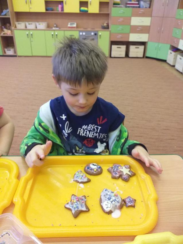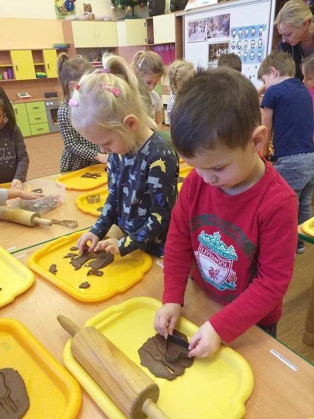 Kultywujemy  tradycje świąteczne poprzez poznanie sposobu przygotowania pierniczków światecznych. Samodzielnie wyrabiamy ciasto,  wałkujemy i wykrawamy pierniki, które wypiekane są w przedszkolnej kuchni. Upieczone pierniczki dekorujemy według własnego pomysłu lukrem i różnymi słodkimi dekoracjami.