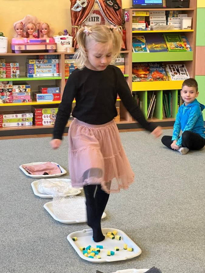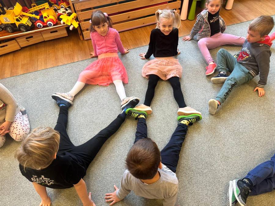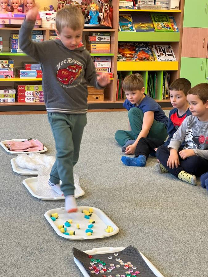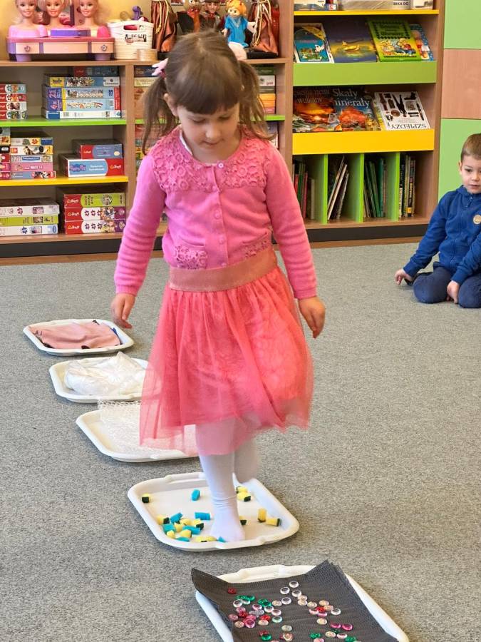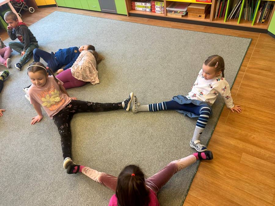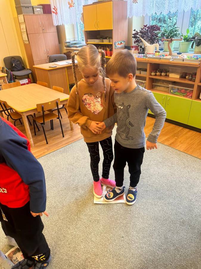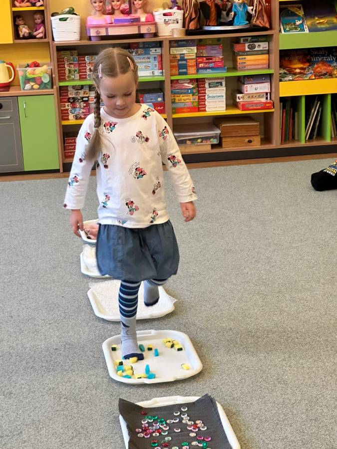 Podczas dzisiejszych zajęć poznaliśmy cyfrę 0. Dzieci w parach próbowały ułożyć się w poznaną cyfrę. Wykorzystaliśmy papierowe gazety do zabawy ruchowej. Ćwiczyliśmy także zmysł dotyku podczas spaceru na ścieżce sensorycznej