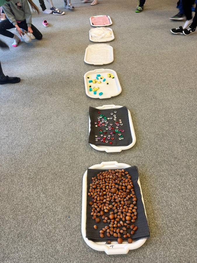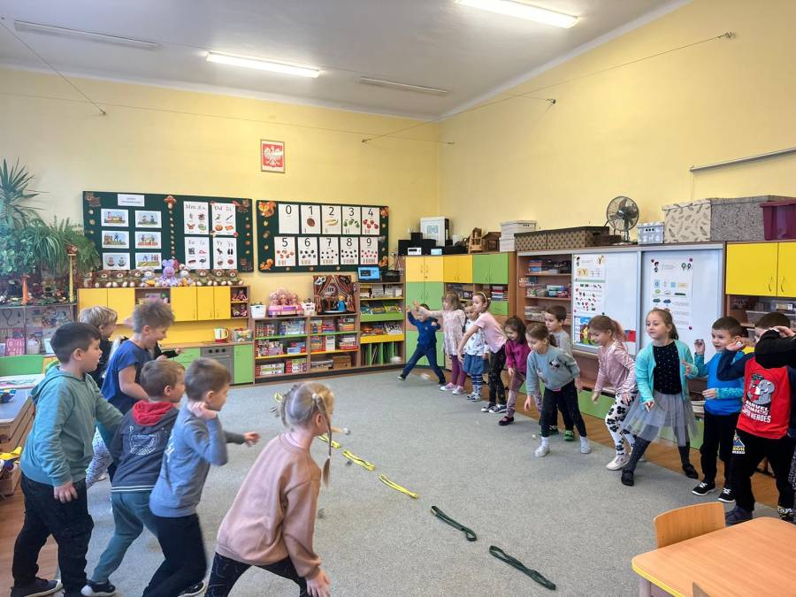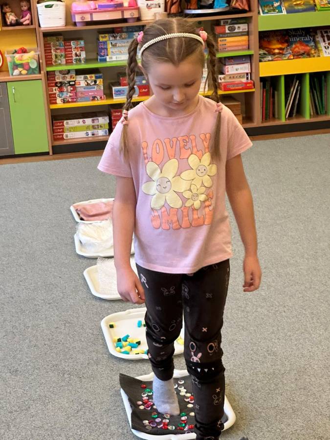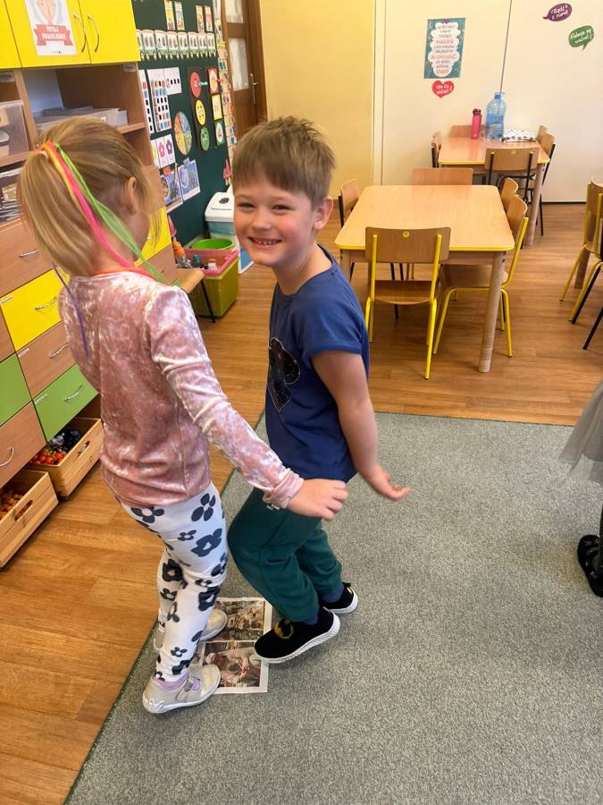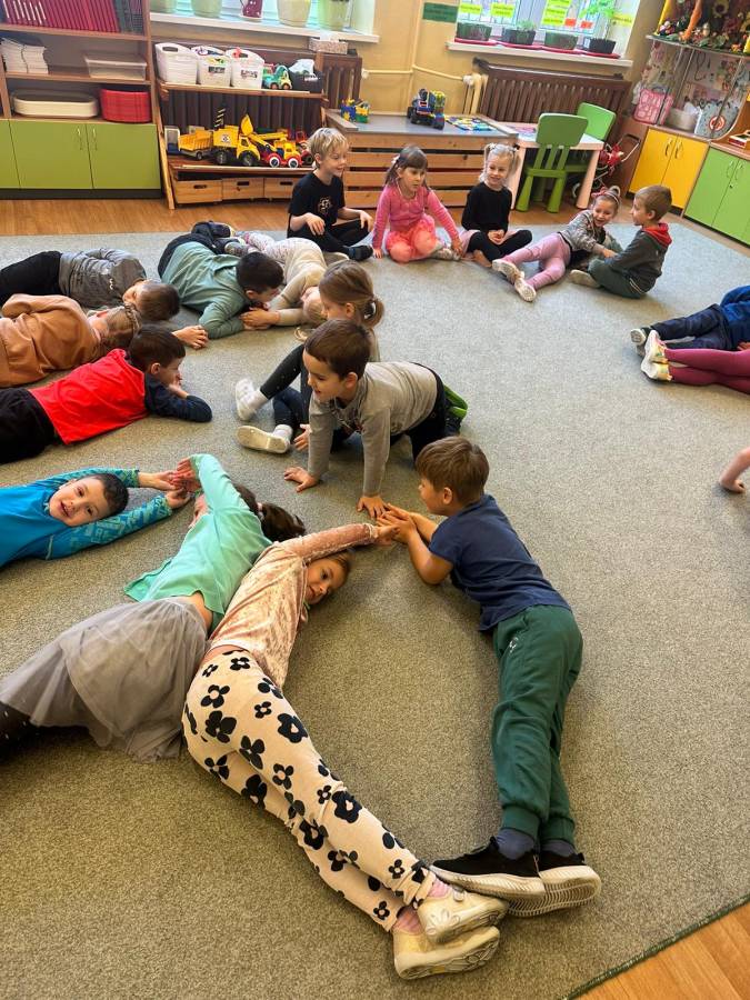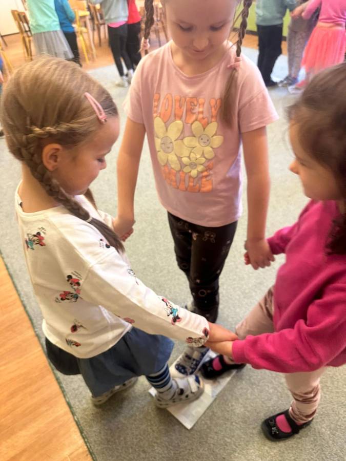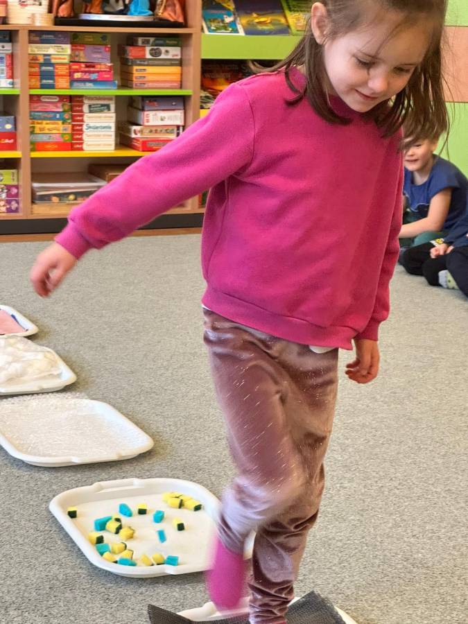 Podczas dzisiejszych zajęć poznaliśmy cyfrę 0. Dzieci w parach próbowały ułożyć się w poznaną cyfrę. Wykorzystaliśmy papierowe gazety do zabawy ruchowej. Ćwiczyliśmy także zmysł dotyku podczas spaceru na ścieżce sensorycznej