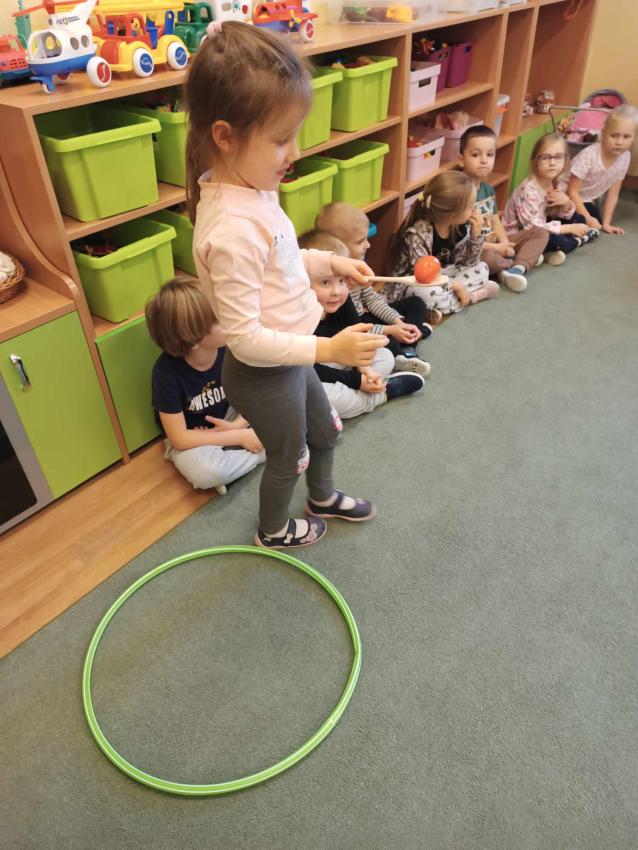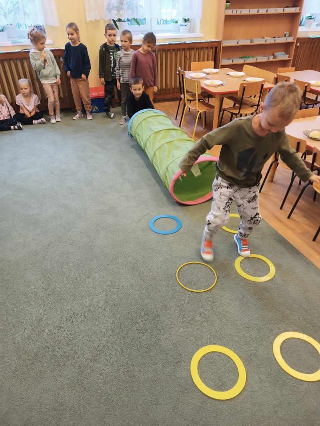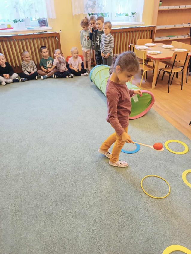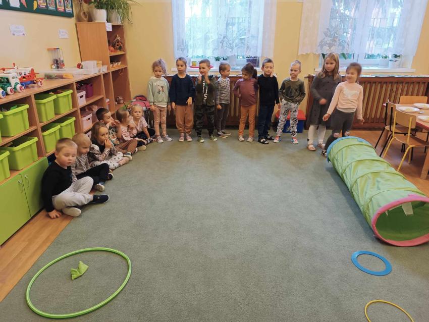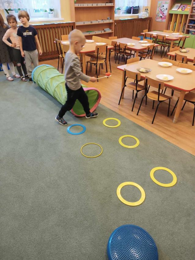 Deszcz ciągle padał?, ale Żabki nie traciły siły i energii do zabawy i postanowiły poćwiczyć przed obiadem. Przedszkolaki uczestniczyły w rozgrzewce, ćwiczeniach wzmacniających ogólną sprawność ruchową oraz pokonały tor przeszkód, wymagający wiele umiejętności i sprytu.