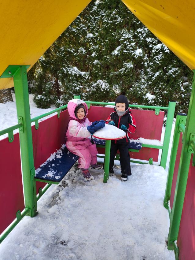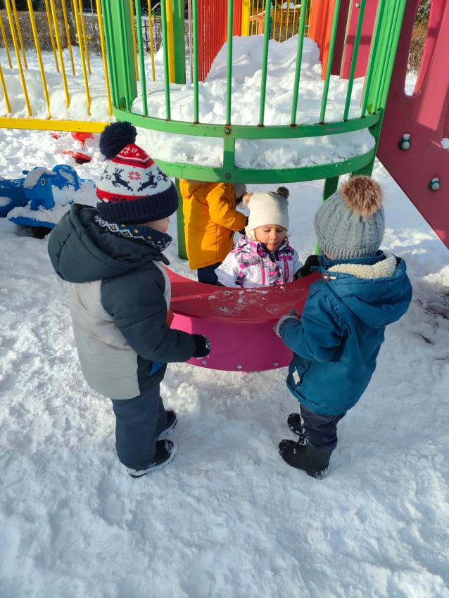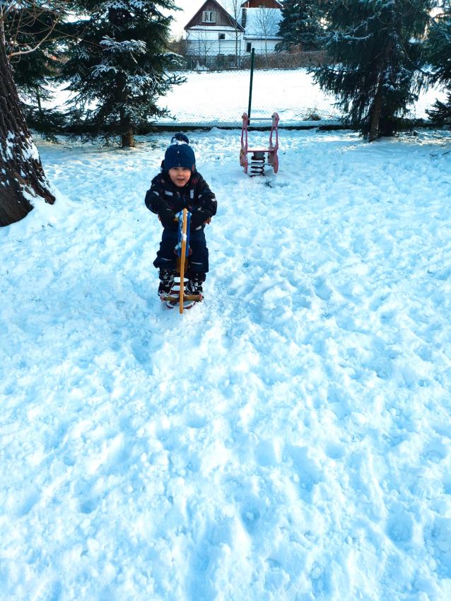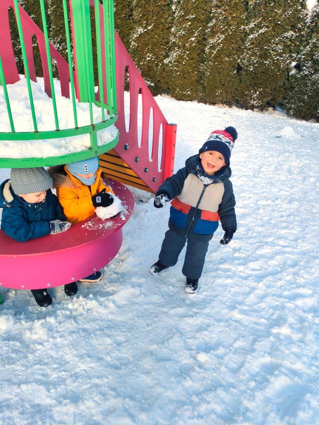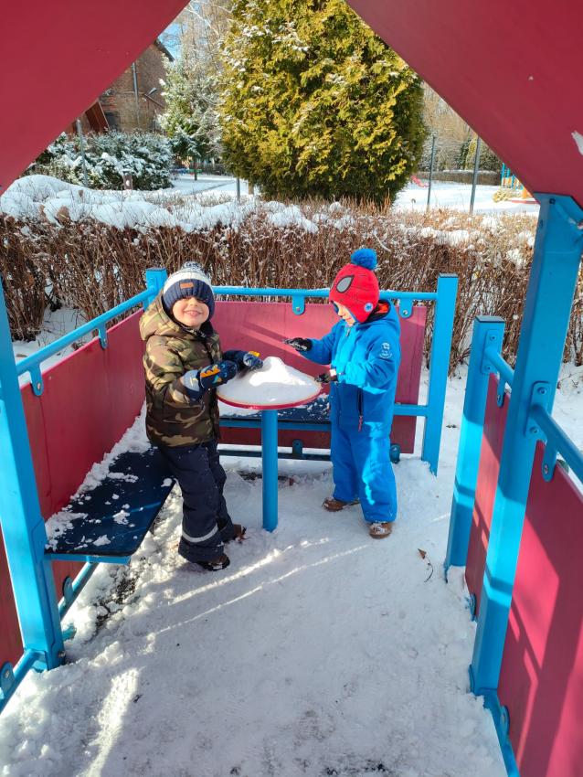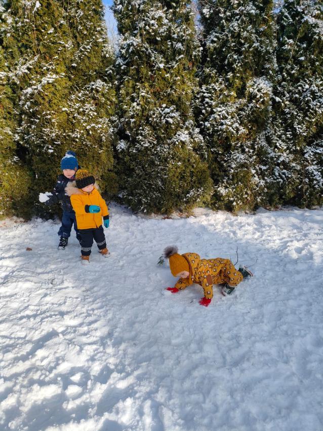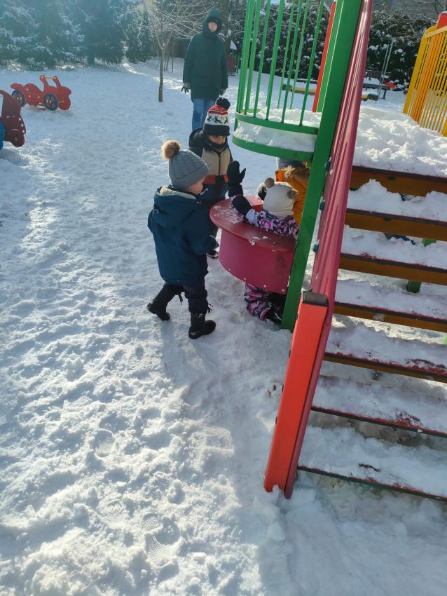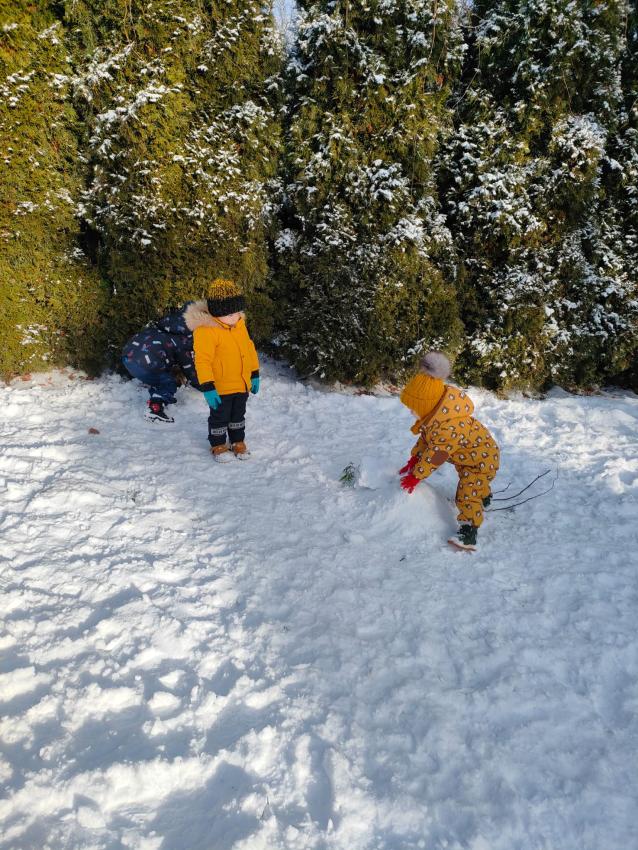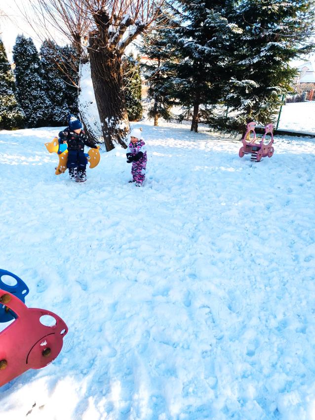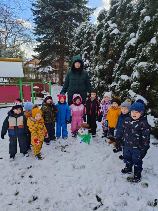 Jeśli pozwala na to temperatura i jakość powietrza staramy się organizować dzieciom zajęcia w ogrodzie. Wspólne lepienie bałwana to wspaniały sposób na integrowanie grupy wokół wspólnego celu oraz rozwijanie umiejętności współpracy.