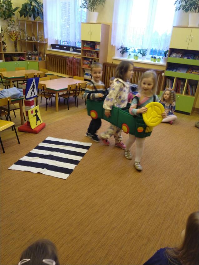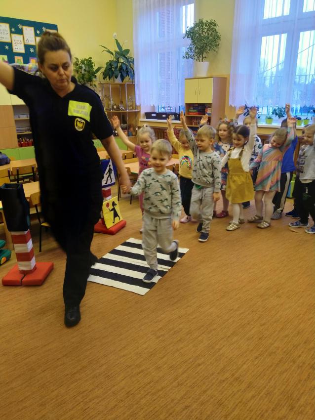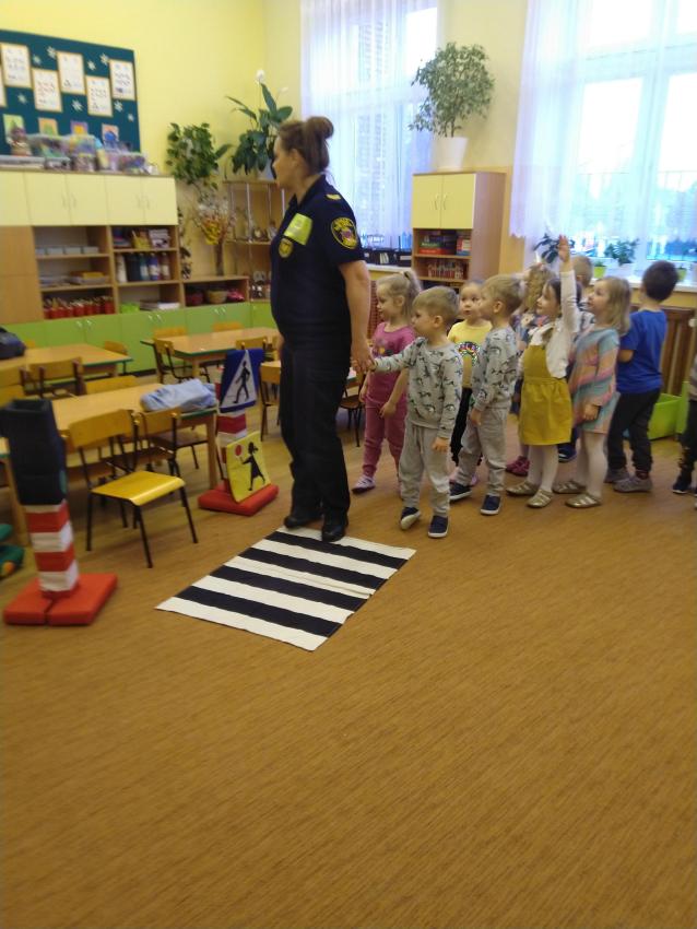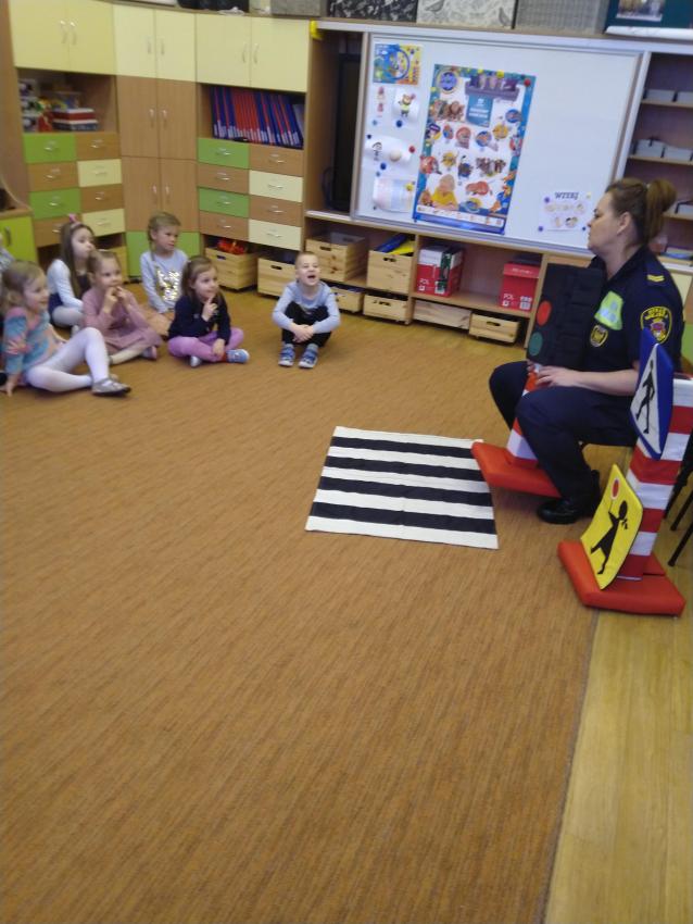 Dzieci z grupy Motylków podczas spotkania z Panią ze Straży Miejskiej uczyły się zasad bezpiecznego poruszania się w ruchy ulicznym.