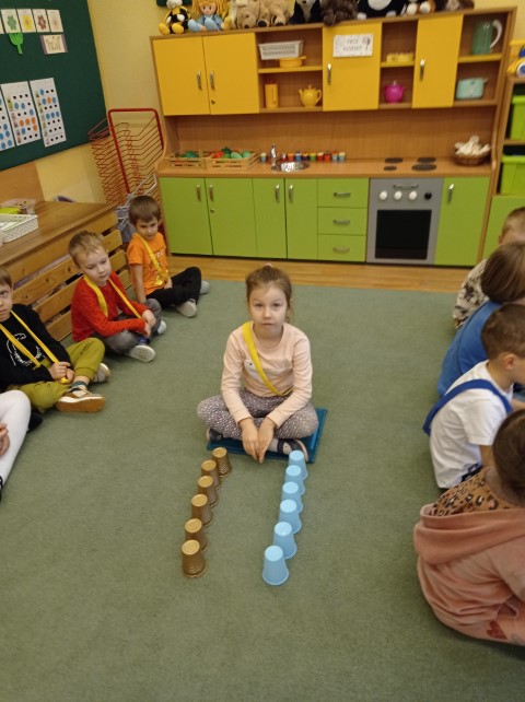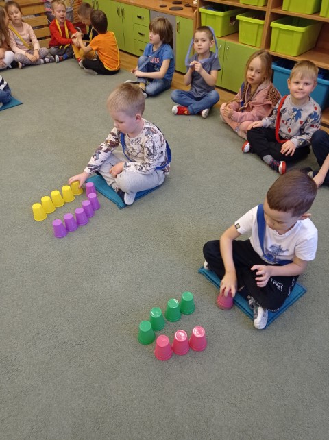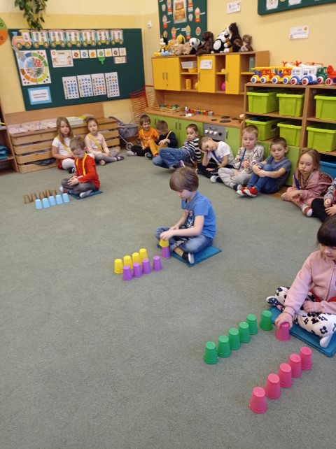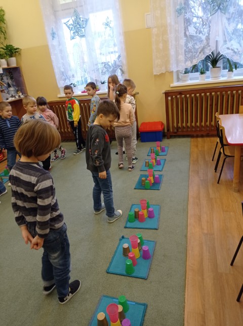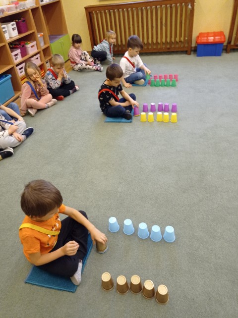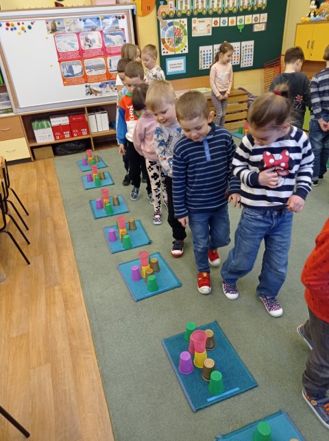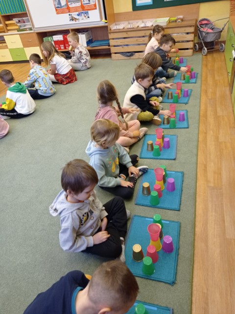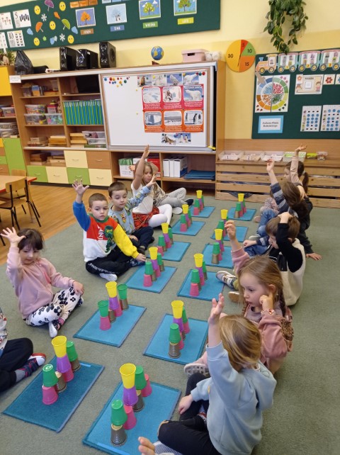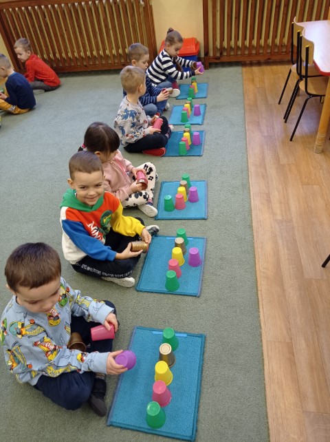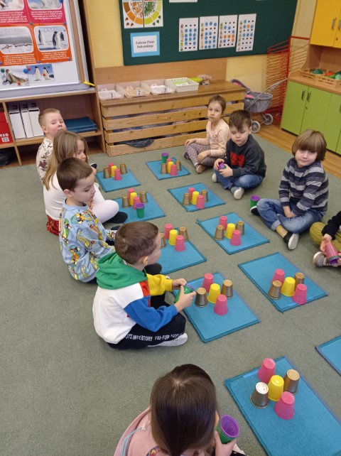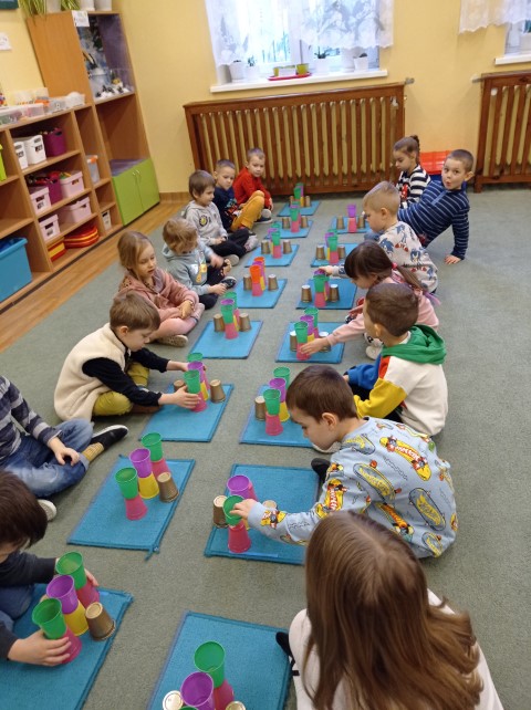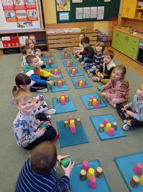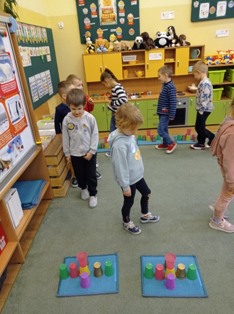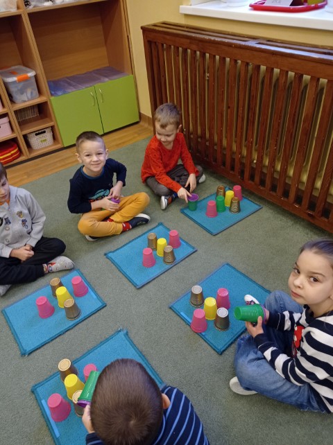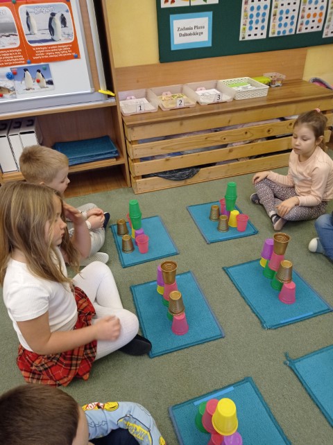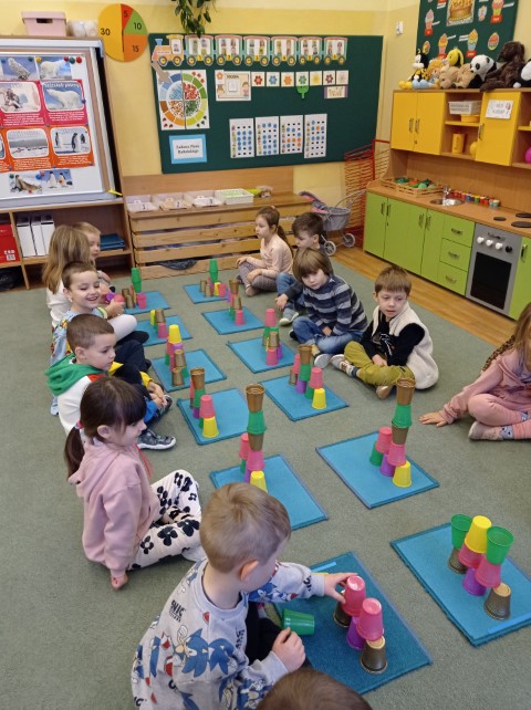 Dzieci podczas zabaw z kubeczkami wykonywały różne zadania: zgodnie z instrukcją nauczyciela, według wzoru podanego przez kolegę oraz wg kodu. Świetnie poradziły sobie również z zadaniami z przekraczaniem linii środka, które wymagały komunikacji między dwiema półkulami mózgowymi, świadomości ciała oraz koordynacji ręka- oko.