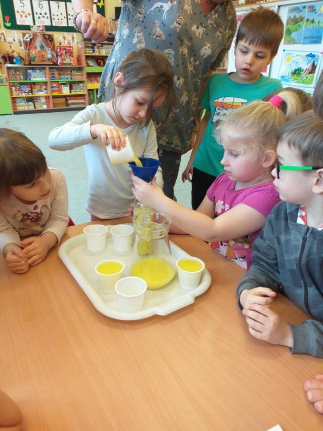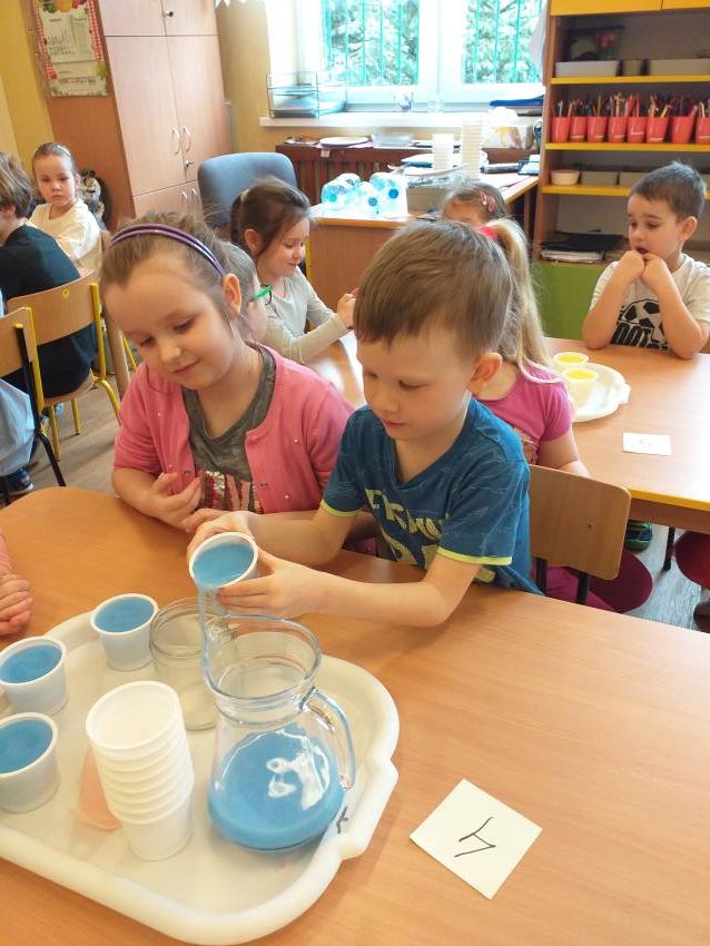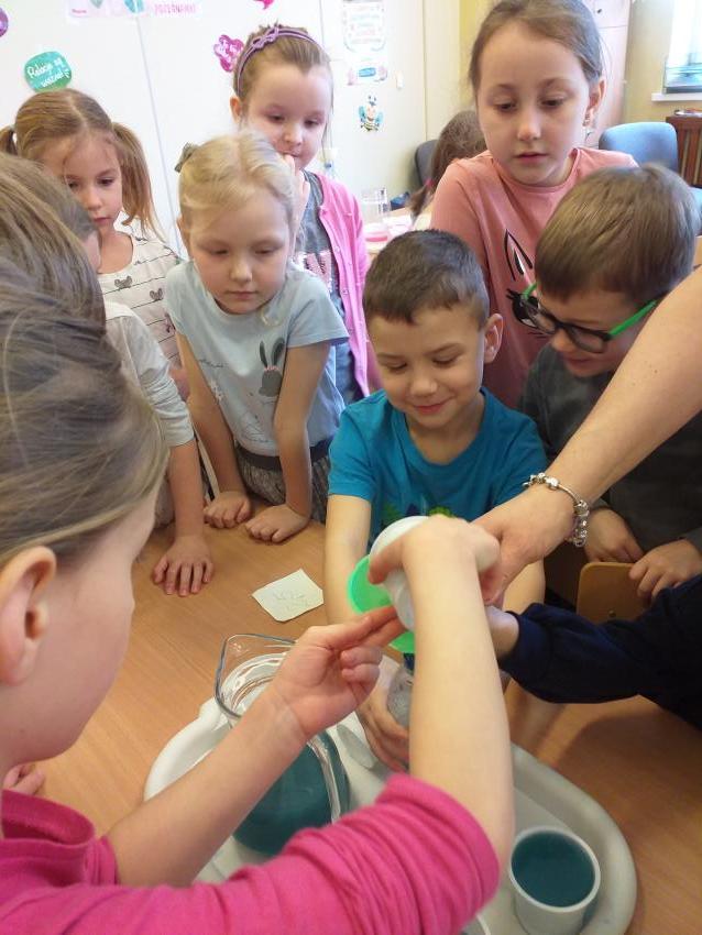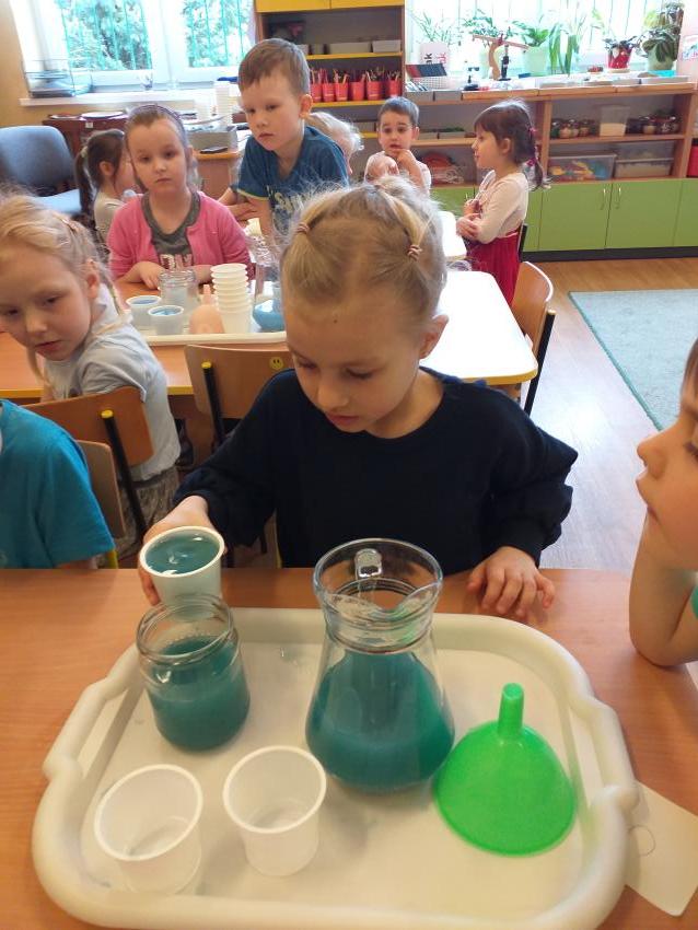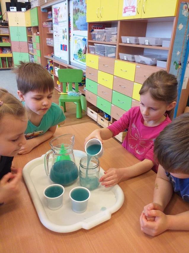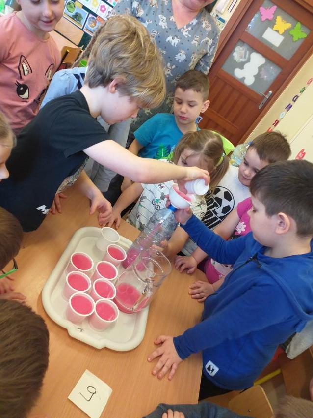 Dzieci w czasie zabawy badawczej szacowały, porównywały i mierzyły objętość wody. Zgodnie współpracowały w małych zespołach, najpierw szacowały ile kubków kolorowej wody zmieści się do słoika. Potem powtórzyły badanie i określały jaka ilość kubków wypełni platikową butelkę.  Przedszkolaki z wielką ciekawością sprawdzały rezultat doświadczenia. Każda drużyna wykonała zadanie na medal.