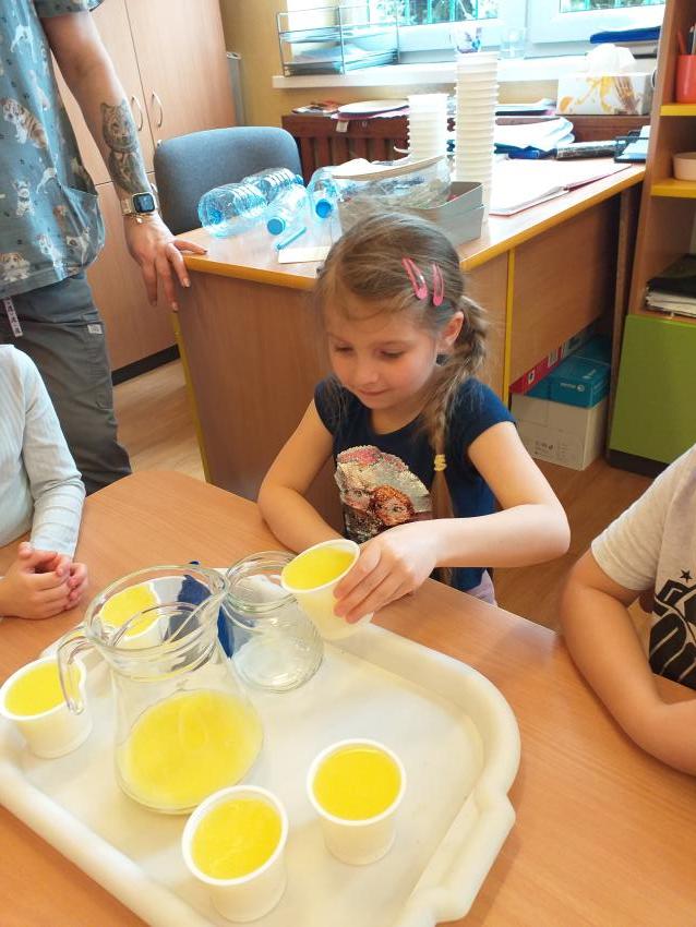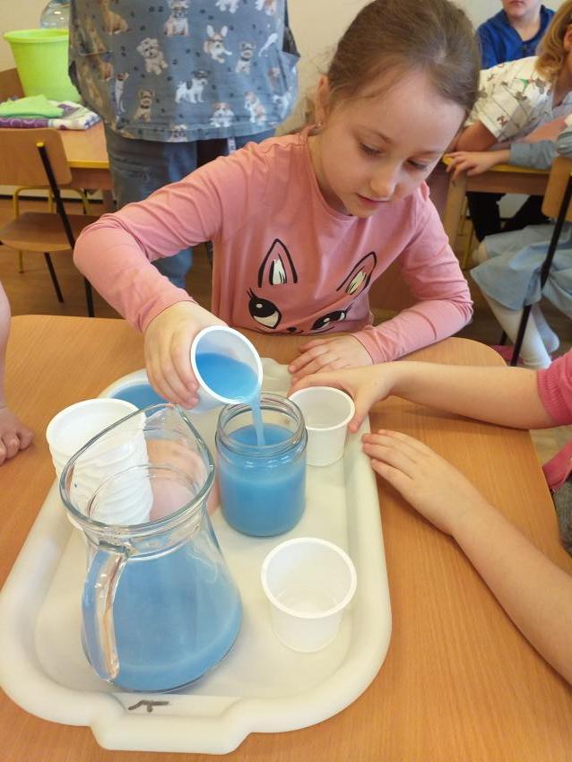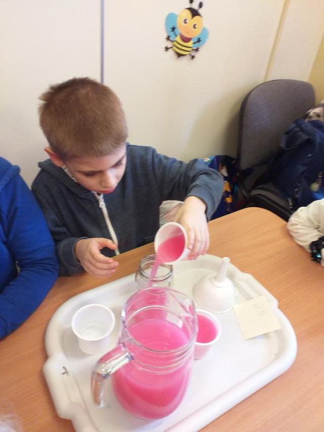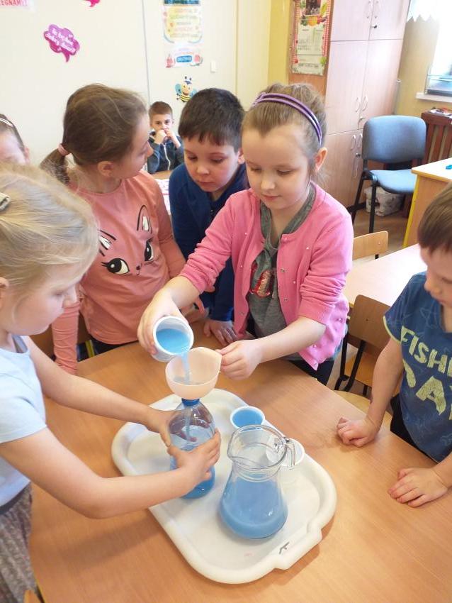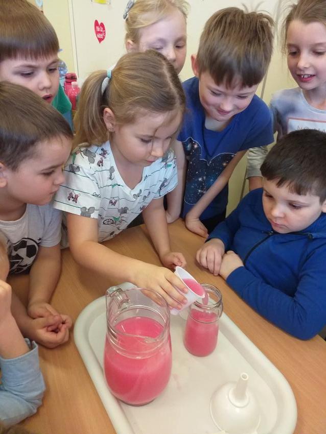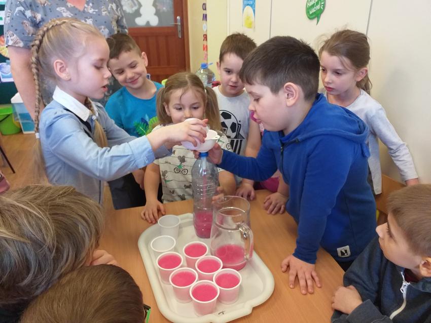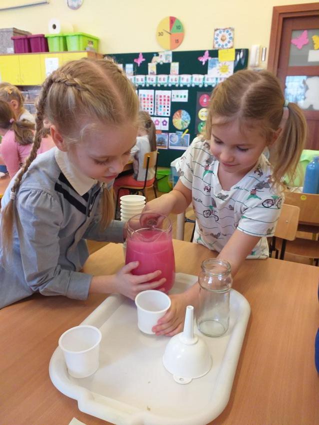 Dzieci w czasie zabawy badawczej szacowały, porównywały i mierzyły objętość wody. Zgodnie współpracowały w małych zespołach, najpierw szacowały ile kubków kolorowej wody zmieści się do słoika. Potem powtórzyły badanie i określały jaka ilość kubków wypełni platikową butelkę.  Przedszkolaki z wielką ciekawością sprawdzały rezultat doświadczenia. Każda drużyna wykonała zadanie na medal.