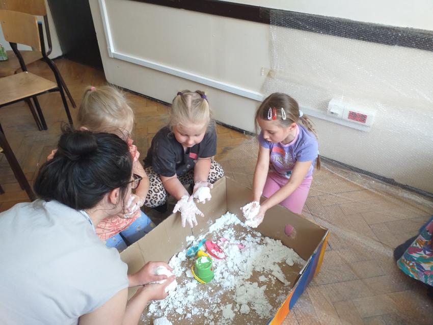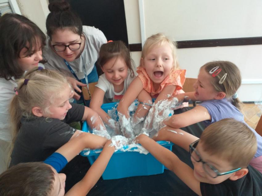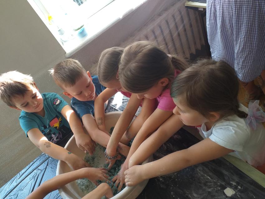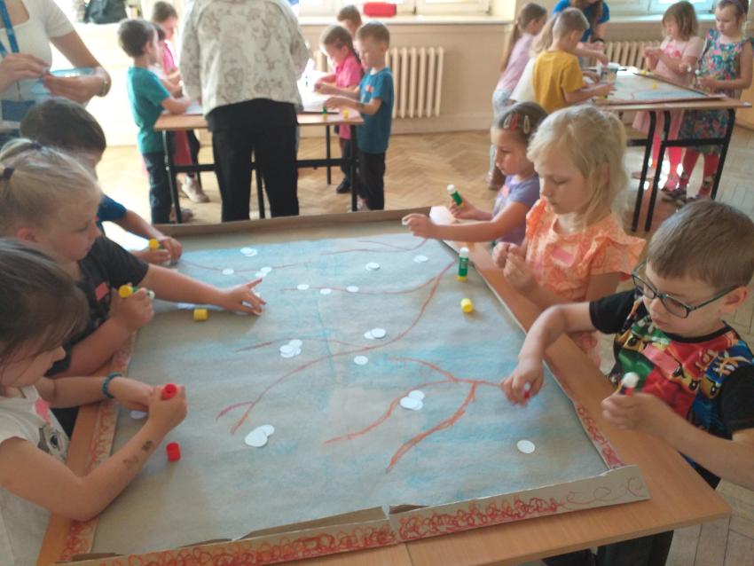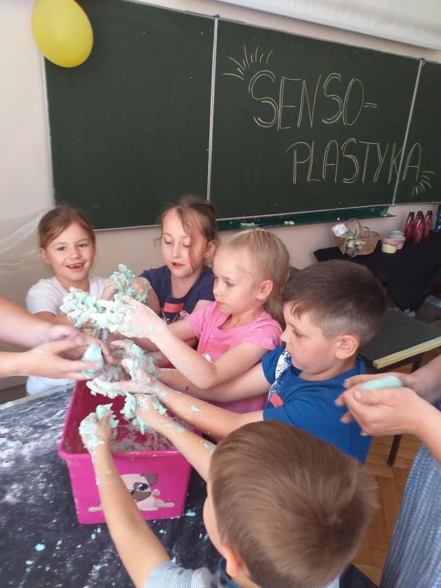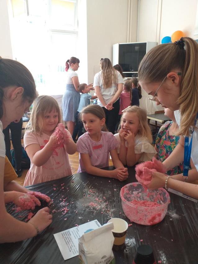 W ramach Festiwalu nauki dzieci brały czynny udział w wrsztatach przygotownych przez studentów Uniwersytetu Pedagogicznego. Zajęcia rozpoczęły się przywitaniem w auli wykładowej, w której ochoczo  zasiadły nasze   przedszkolaki. Przyszli pedagodzy przygotowali wiele ciekawych aktywności: malowanie z wykorzystaniem edukacji przez ruch wg D. Dziamskiej,  malowanie farbami na folii, zajęcia rozwijające percepcję słuchową oraz sensoplastyka, która okazała się największą atrakcją. Świtnie zorganizowane warsztaty pobudziły dzieci do aktywnego uczestnictwa, twórczego myślenia, rozwoju kreatywności oraz umiejetności współdziałania w grupie.  Na pewno wrócimy tu za rok.