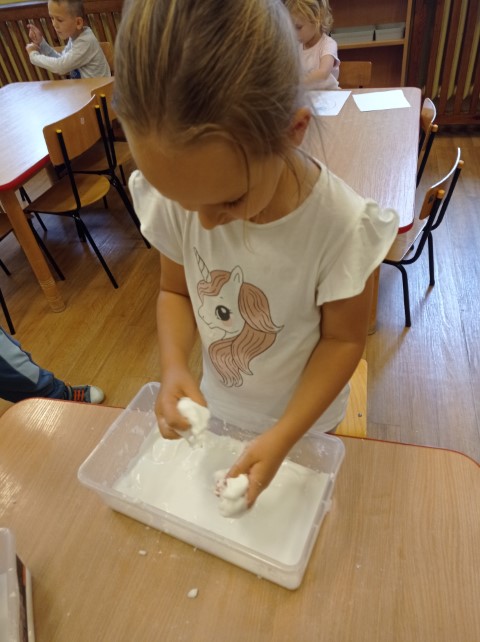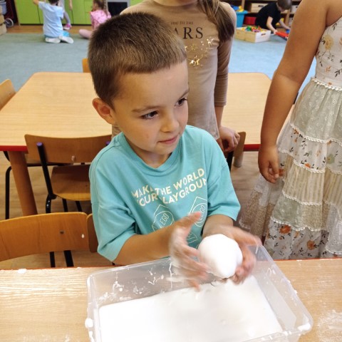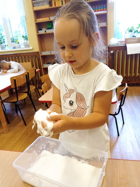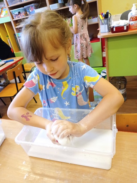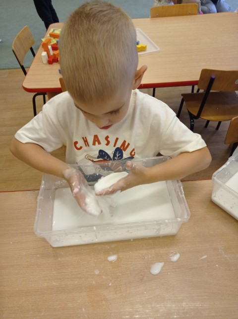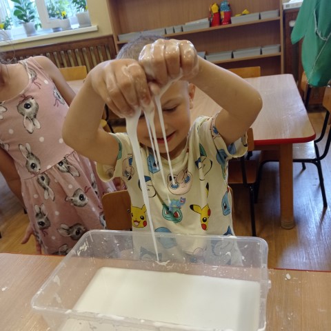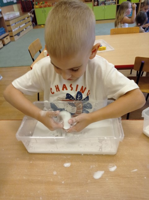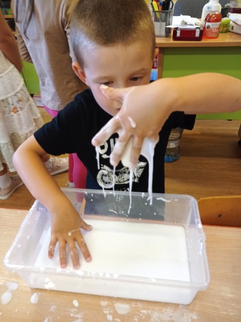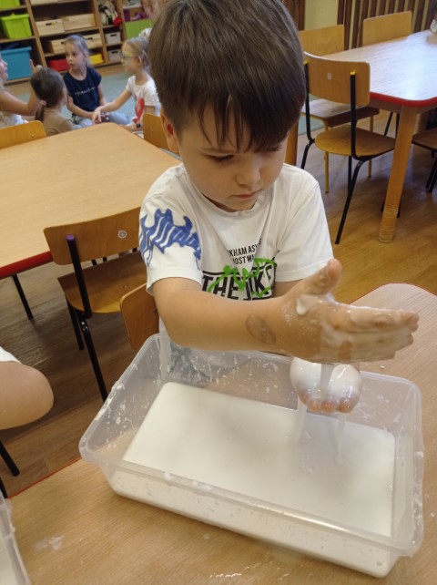 Zabawy cieczą nienewtonowską to doskonałe ćwiczenie sensoryczne dla dzieci. Zabawy tą substancją, która w zależności od użycia siły nacisku raz zachowuje się bardziej jak substancja płynna a innym razem jak ciało stałe daje dzieciom dużo radości.