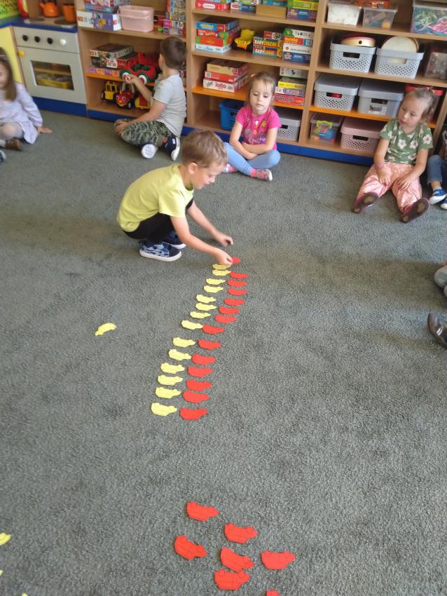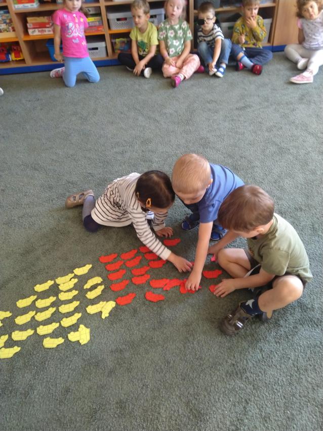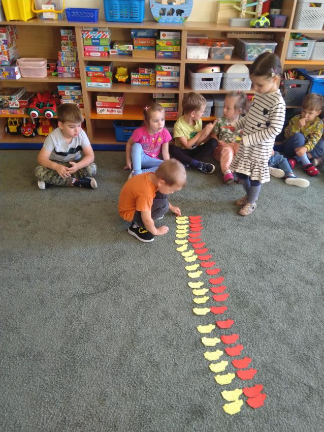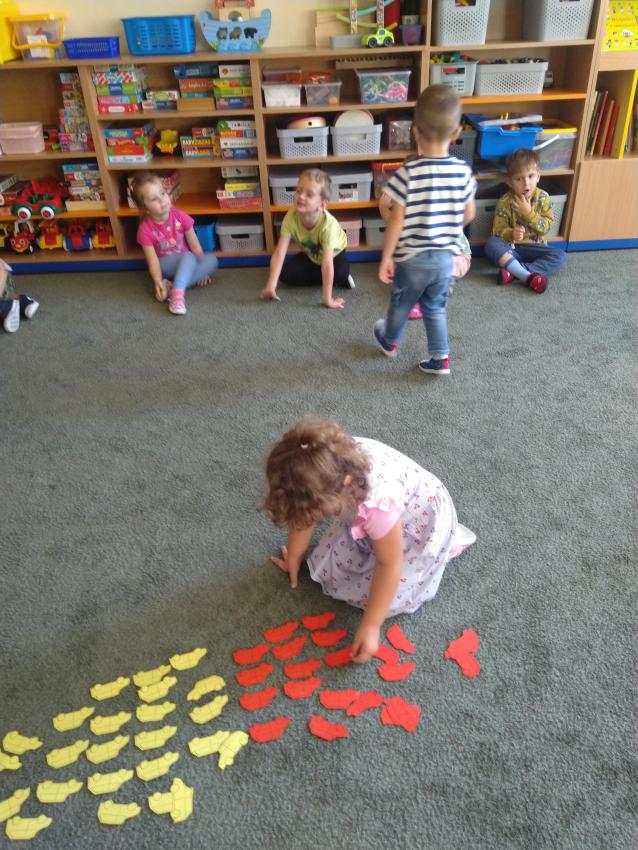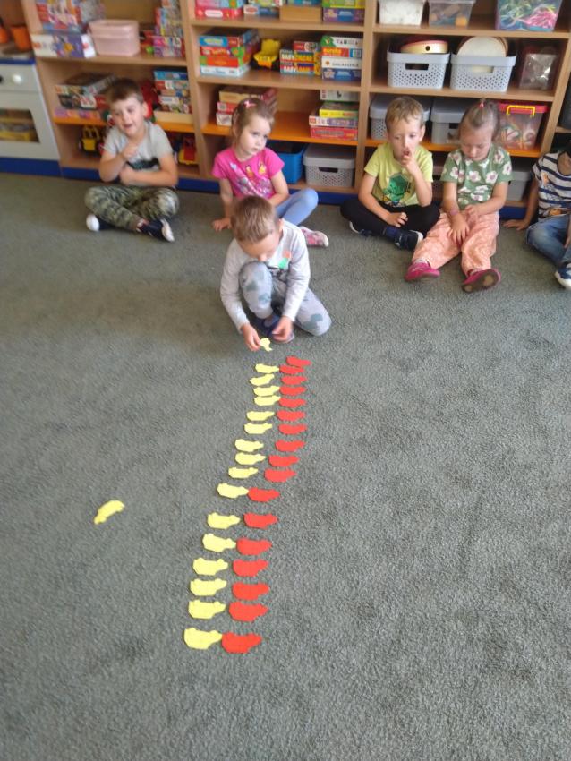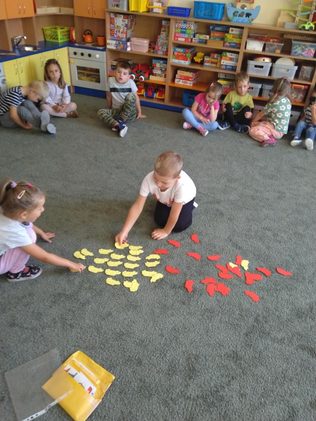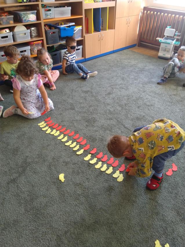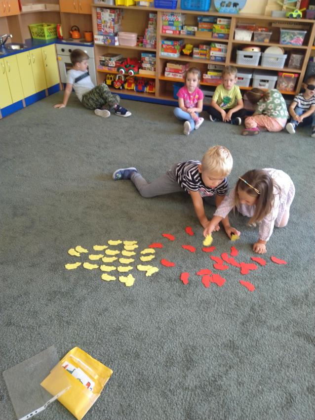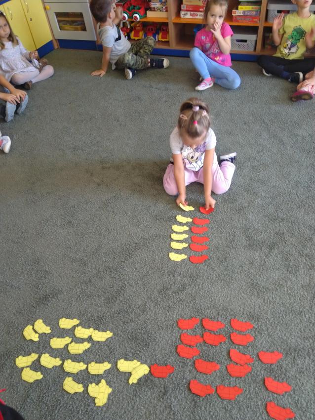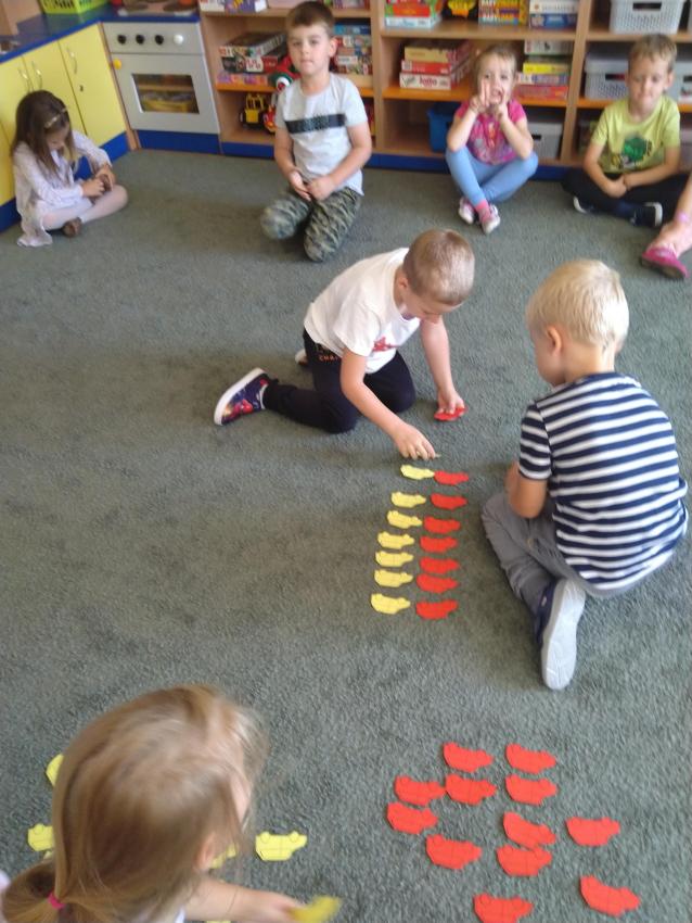 Dzieci z grupy Pingwinków podczas zabaw matematycznych uczyły się klasyfikowania zbioru na podzbiory wg ustalonej cechy  - koloru, następnie porównywały liczebność zbiorów poprzez ustawianie elementów w pary.