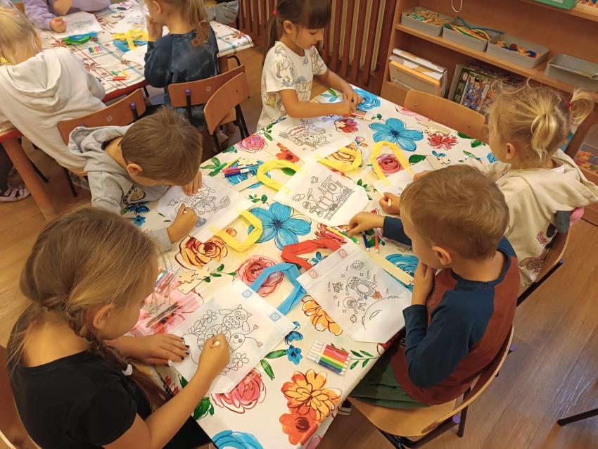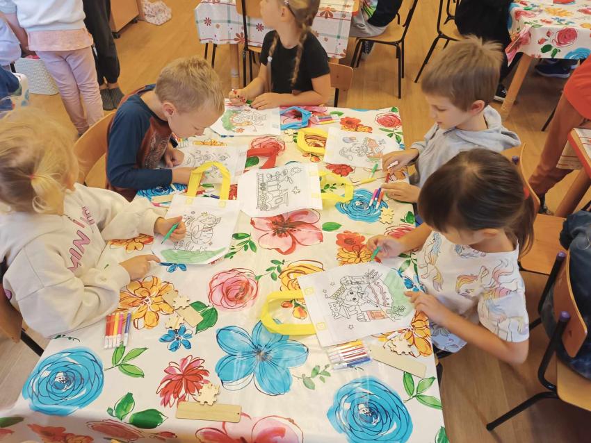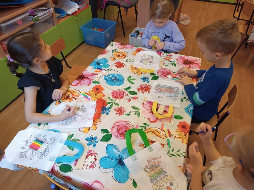 Dziękujemy Mamie Kajtusia za przeprowadzenie warsztatów plastycznych, na których dzieci ozdabiały swoje piękne torebki na ?drobne rzeczy? oraz tworzyły zakładki do książek. Było kolorowo i błyszcząco! :)