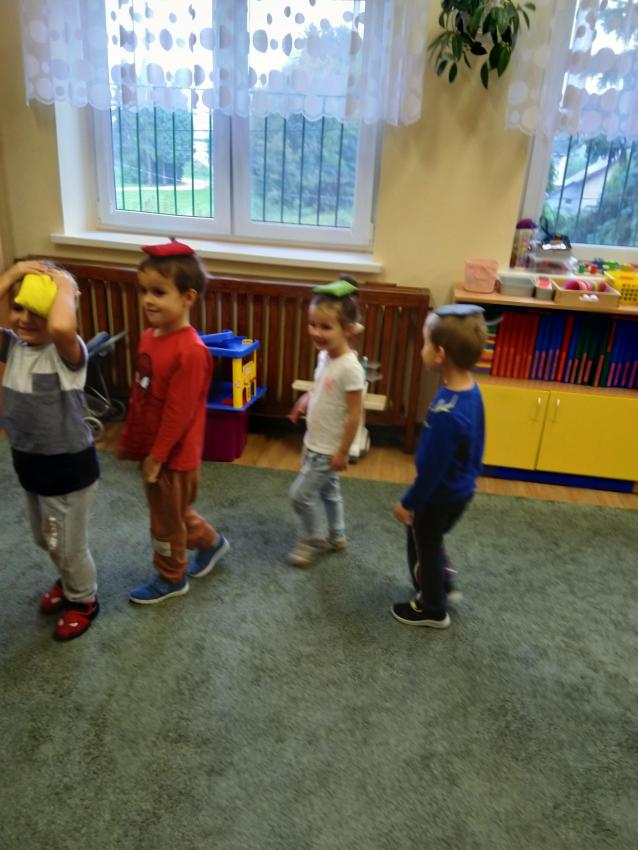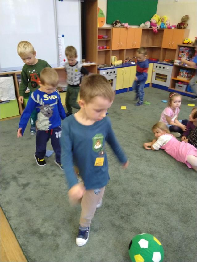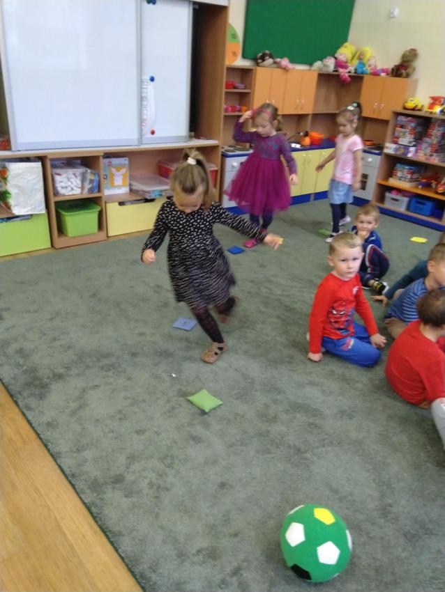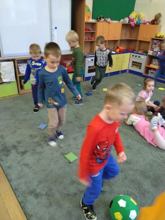 Pingwinki podczas ćwiczeń gimnastycznych. Były m.in. ćwiczenia równoważne, skoczne, ćw. koordynacji ruchowej, ćw. korekcyjne, ćw. bieżne, ćw. zręcznościowe.