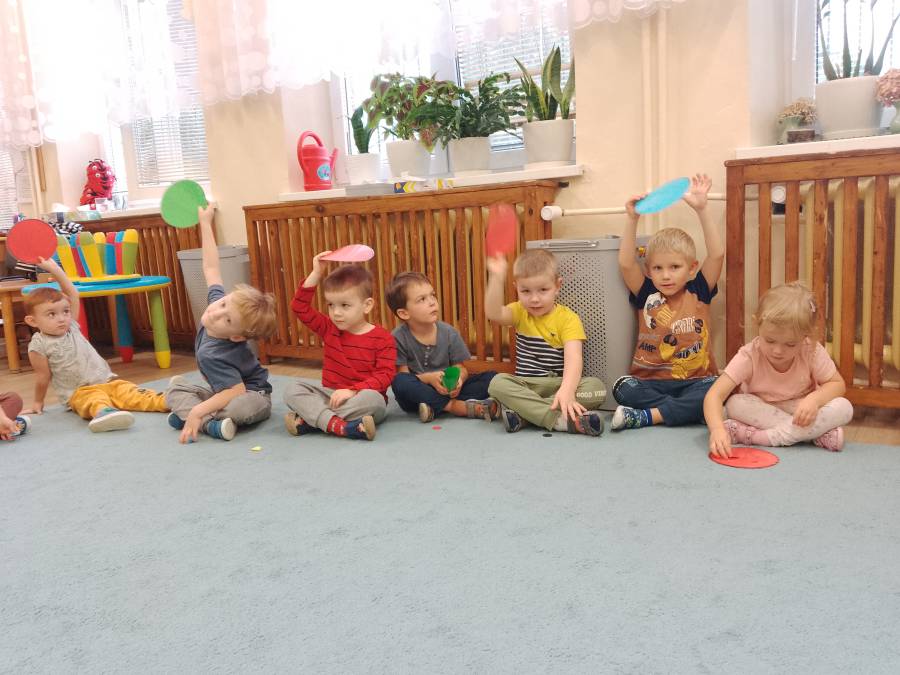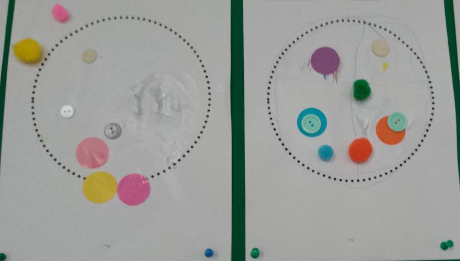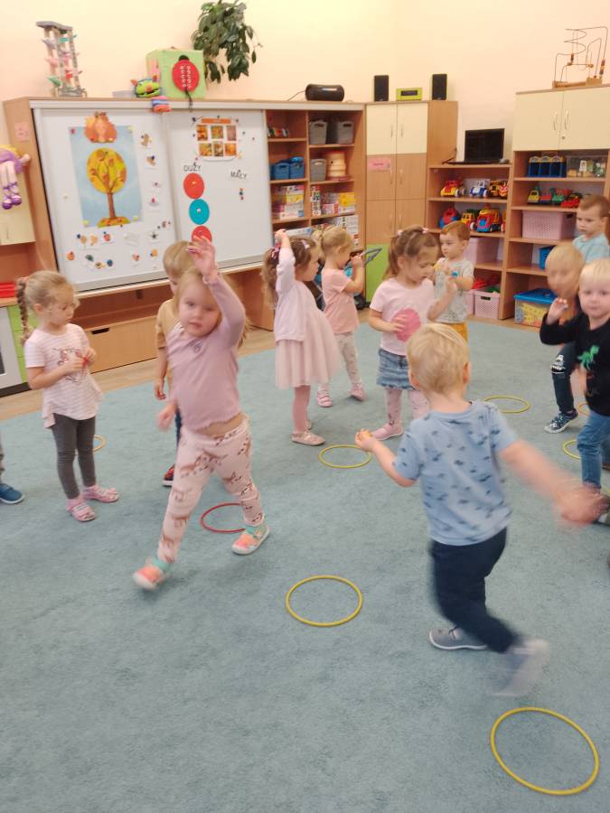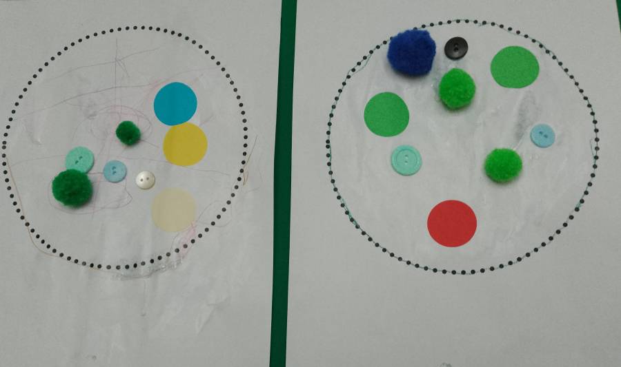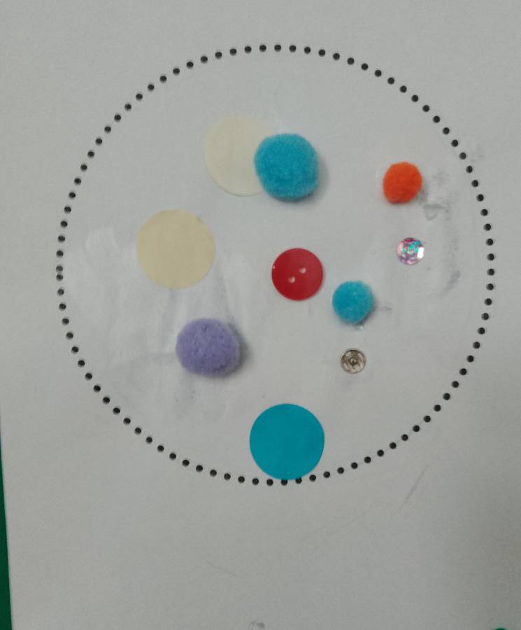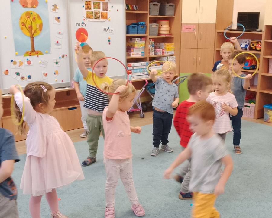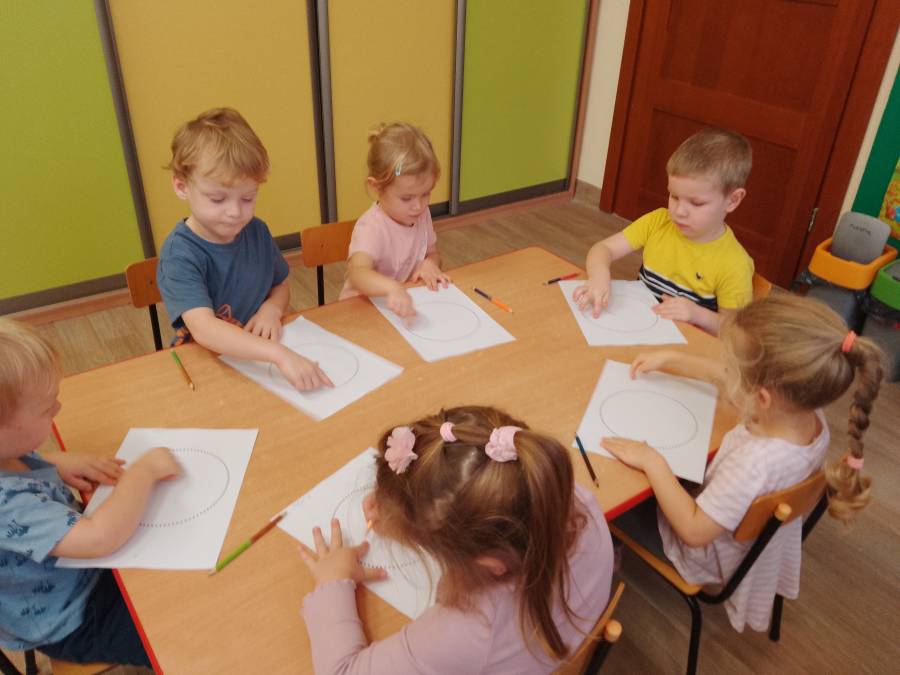 Na dzisiejszych zajęciach Biedroneczki zapoznały się z figurą geometryczną - kołem. Rysowały kształt koła palcem po dywanie, w powietrzu, na kartce. Kształtowały umiejętność klasyfikowania obrazków według 1 cechy (wielkość) oraz ćwiczyły orientację w schemacie własnego ciała. Na koniec ozdobiły koło różnorodnymi materiałami.