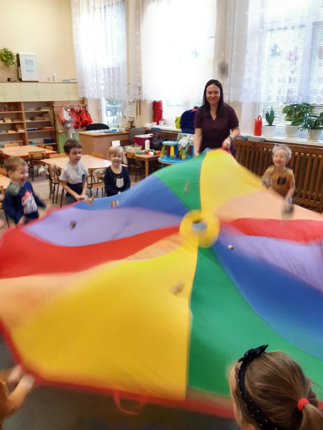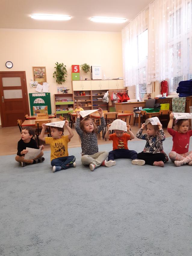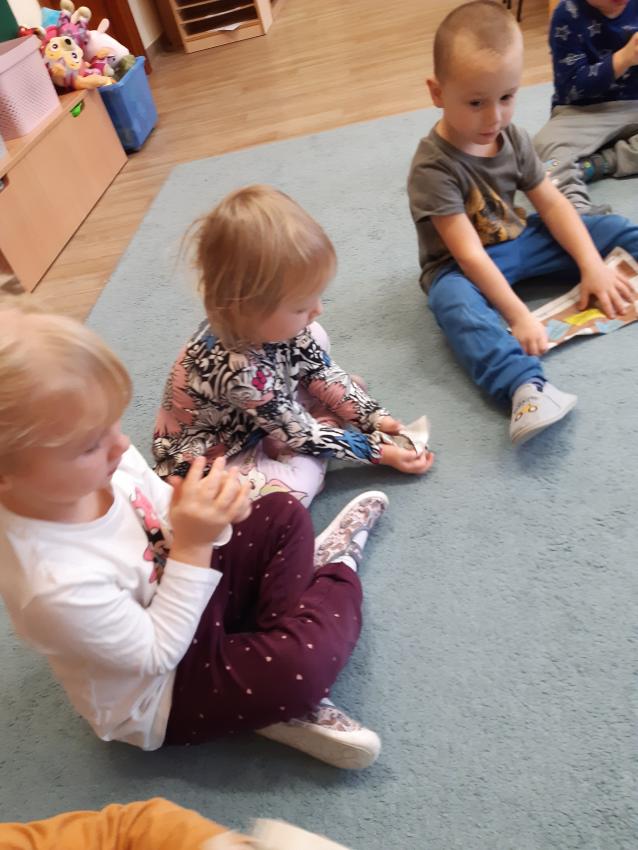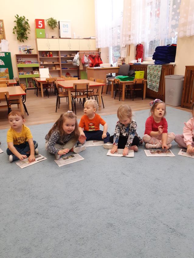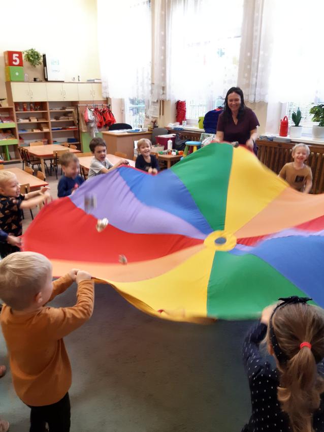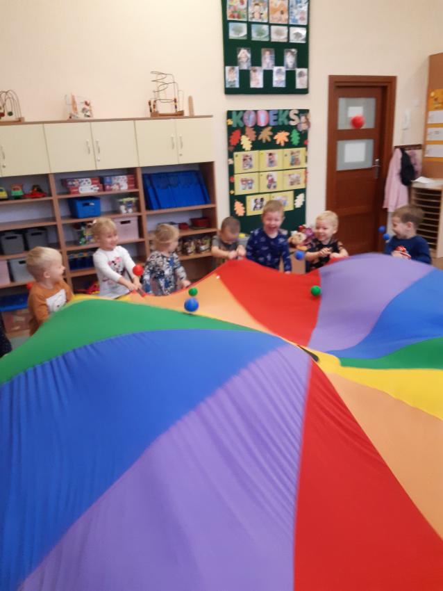 Podczas zajęć dzieci poznały sposoby radzenia sobie z "jesienną nudą" .W zabawach wykorzystaliśmy kawałki gazet, kolorowe piłeczki i chustę animacyjną .Było bardzo radośnie, ale również poprzez zabawę dzieci rozwijały umiejętności koordynacji ruchowej, percepcji słuchowej , rozpoznawania kolorów. Rozwijały i doskonaliły umiejętności integracji ,współdziałania z grupą ,radzenia sobie w różnych sytuacjach.