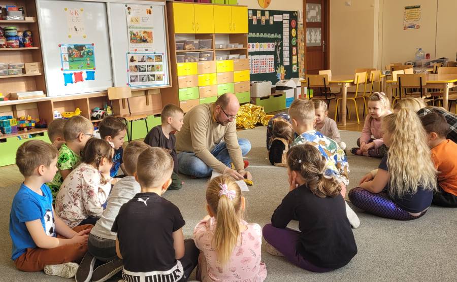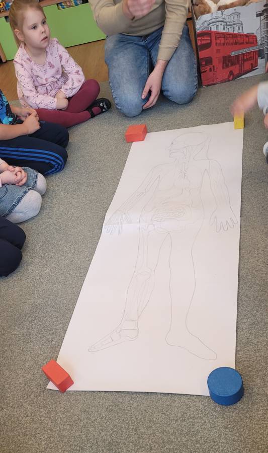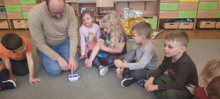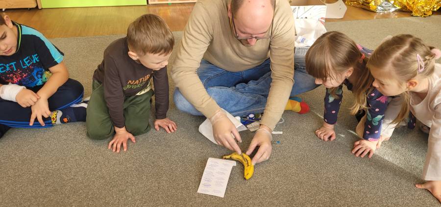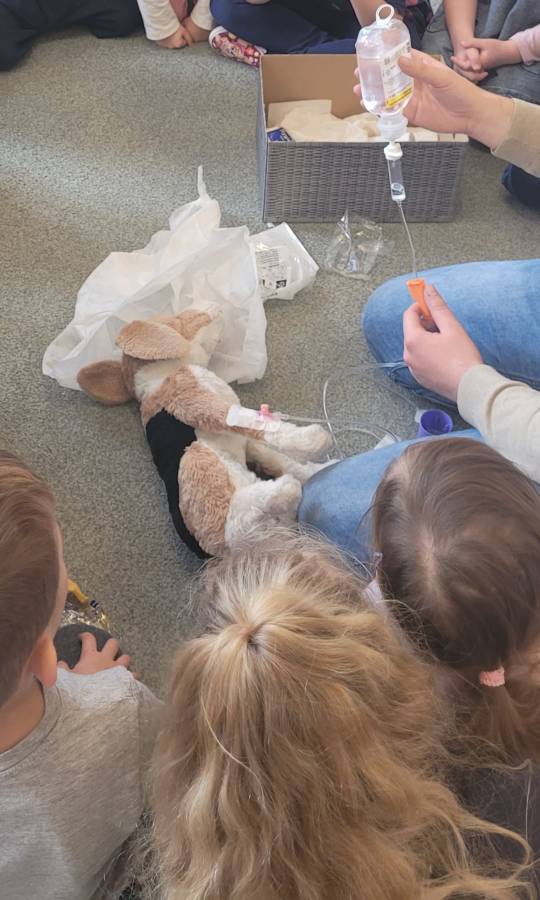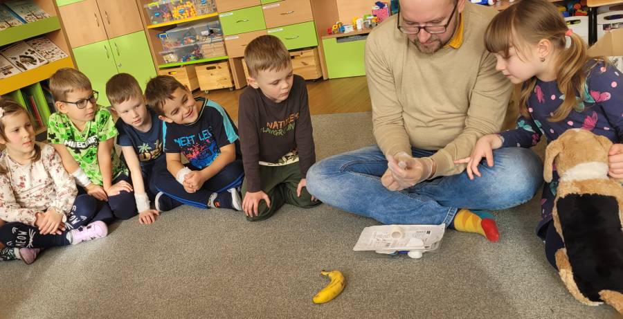 W dniu dzisiejszym naszą grupę odwiedził tata Alicji - Pan Michał, który pracuje jako chirurg. Przedszkolaki wspólnie układały puzzle będące narządami ciała człowieka. Wykazały się ogromną wiedzą na ten temat. Następnie każde dziecko losowało przedmiot o którym Pan Michał opowiadał do czego służą. Znalazły się tam między innymi wenflon, bandaż czy koc ratunkowy. Pluszowy piesek okazał się dzielnym pacjentem, dzięki któremu dzięki zobaczyły jak zakłada się kroplówkę oraz w jakich przypadkach się ją stosuje. Chętni mogli zmierzyć ciśnienie i, owijać się bandażem a także przybić prawdziwą pieczątkę lekarza na recepcie. Największą atrakcją był pokaz zszywania rany na bananie. Wymaga to wielkiej precyzji i skupienia. Każdy z przedszkolaków otrzymał naklejkę dzielnego pacjenta.