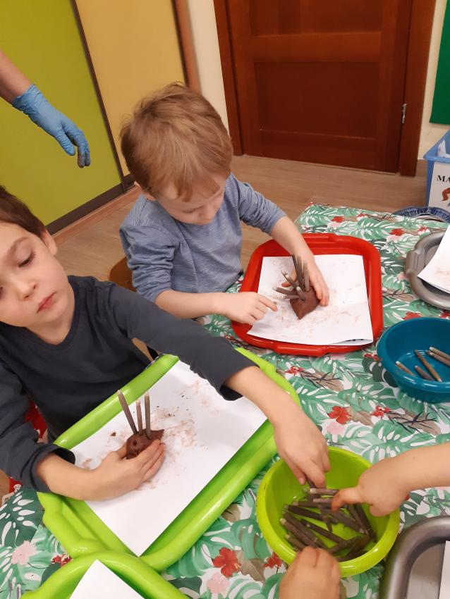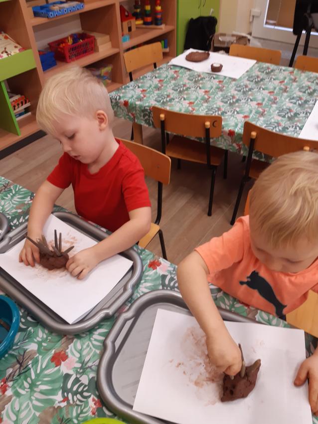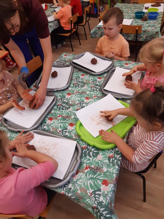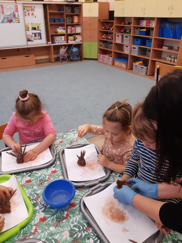 Podczas warsztatów dzieci poznały właściwości gliny,oraz nową technikę plastyczną z jej wykorzystaniem . Lepiły z gliny figurki i ozdoby ? prace płaskie i przestrzenne. Doskonaliły sprawność małej motoryki. Eksperymentowały z dostosowaniem nacisku na glinę do spodziewanego rezultatu. Odkrywały radości tworzenia .