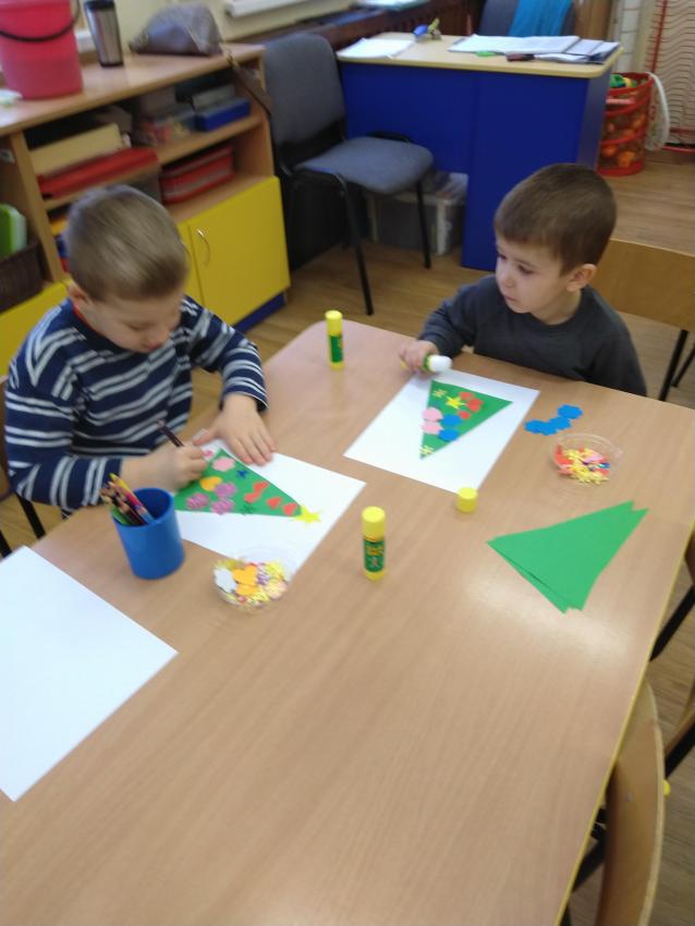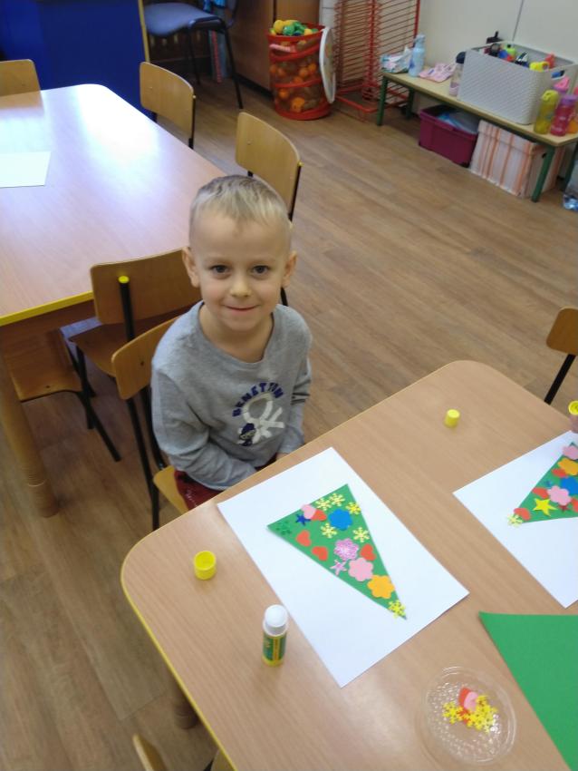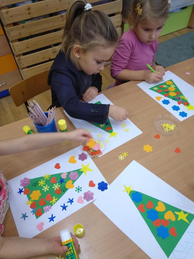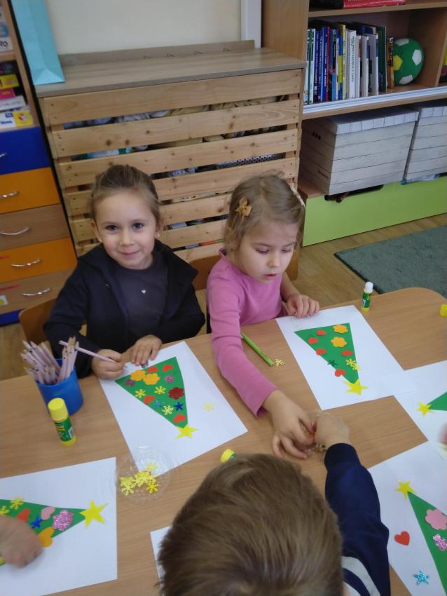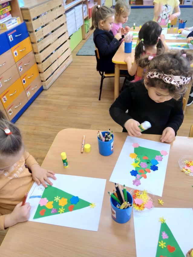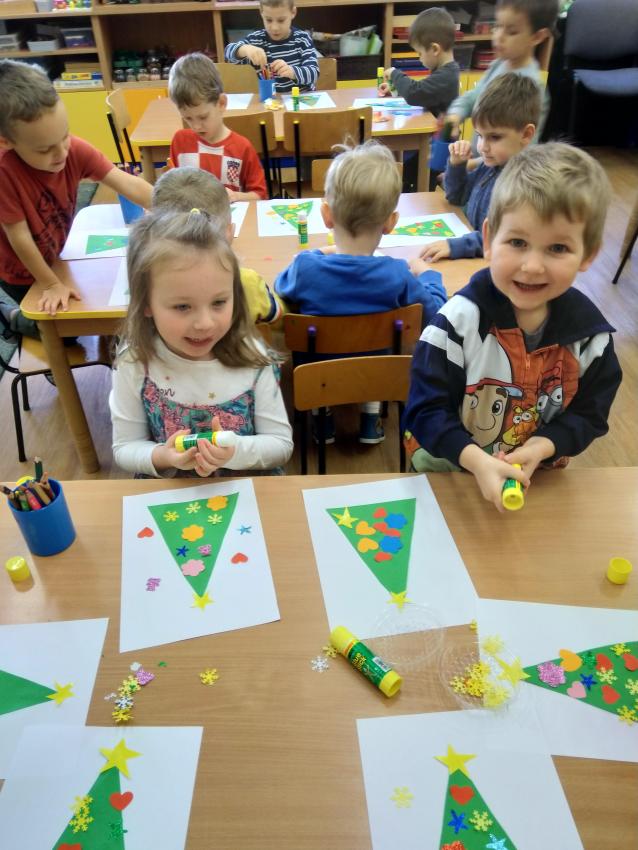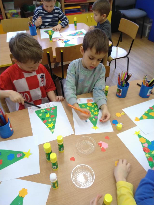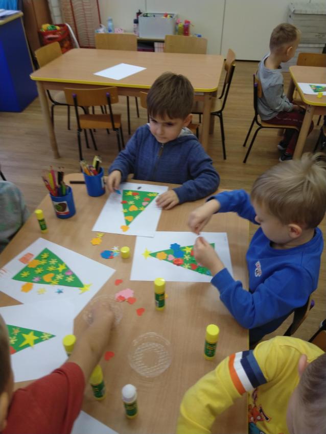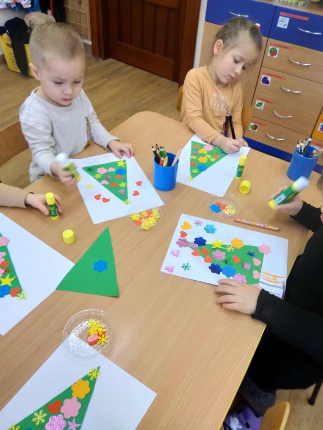 Dzisiaj wykonywaliśmy pracę plastyczną, podczas której ozdabialiśmy sylwetę choinki. Uczymy się posługiwać klejem, doskonalimy koordynację wzrokowo-ruchową oraz rozwijamy poczucie estetyki.  Nasze prace są ładne i kolorowe!