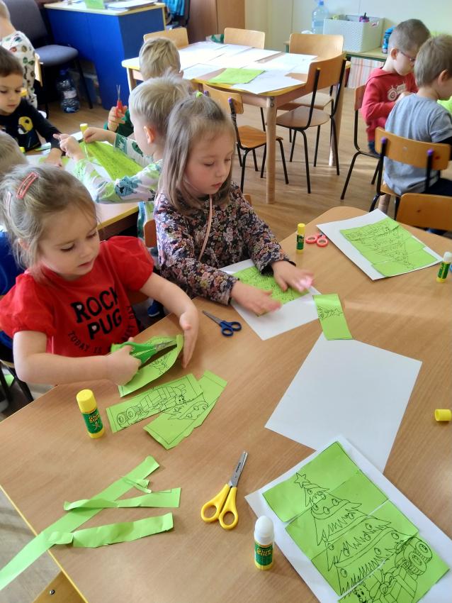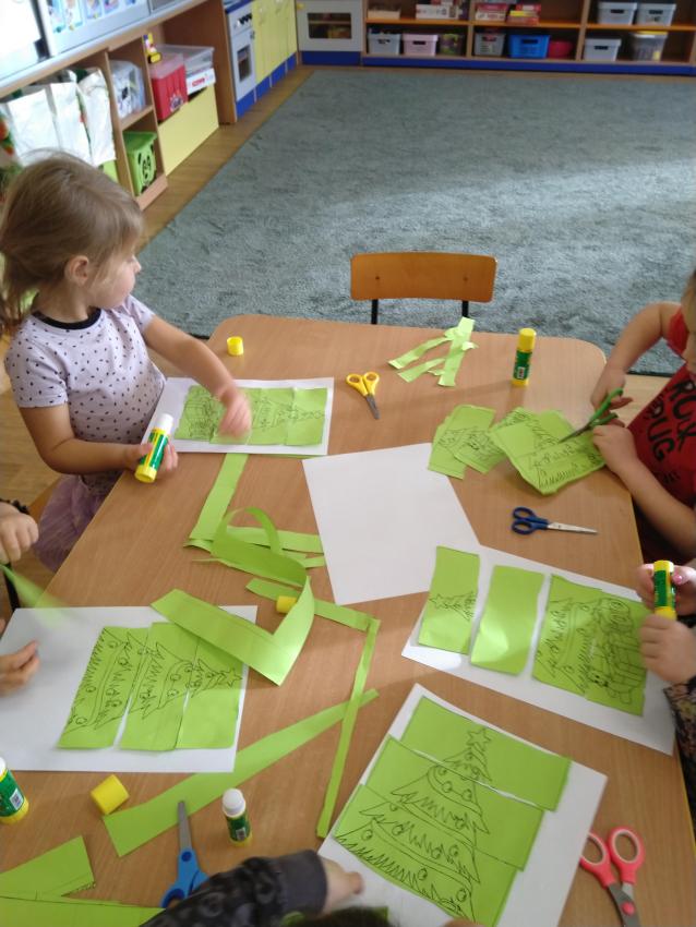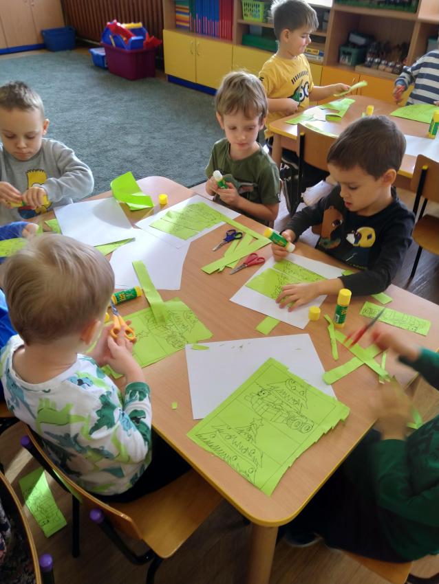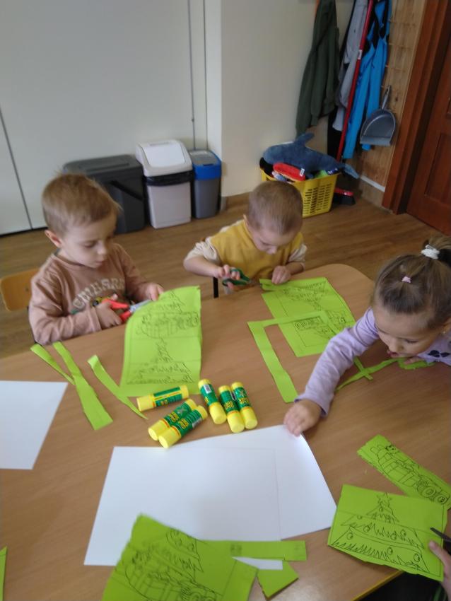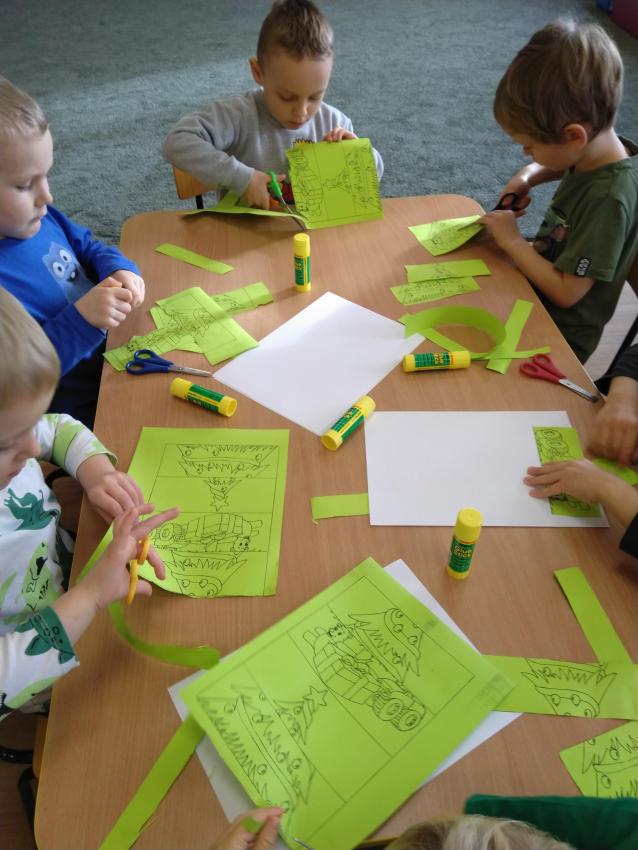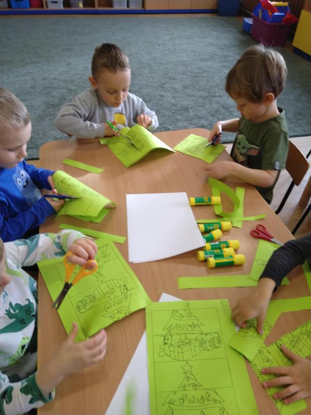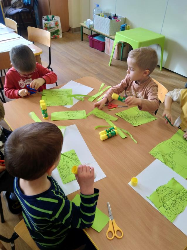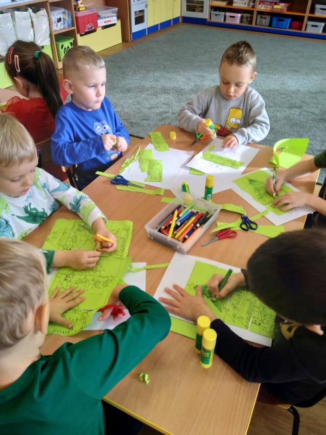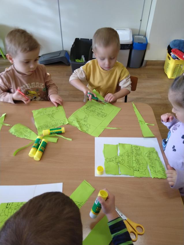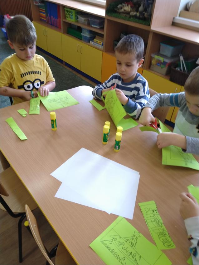 Dzisiaj rozcinaliśmy kartę pracy, składaliśmy w całość i sklejaliśmy. Doskonalimy umiejętność posługiwania się nożyczkami, percepcję wzrokową oraz poczucie sprawstwa.