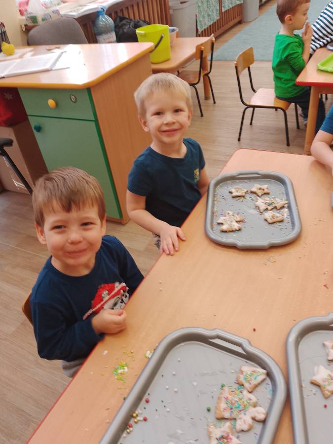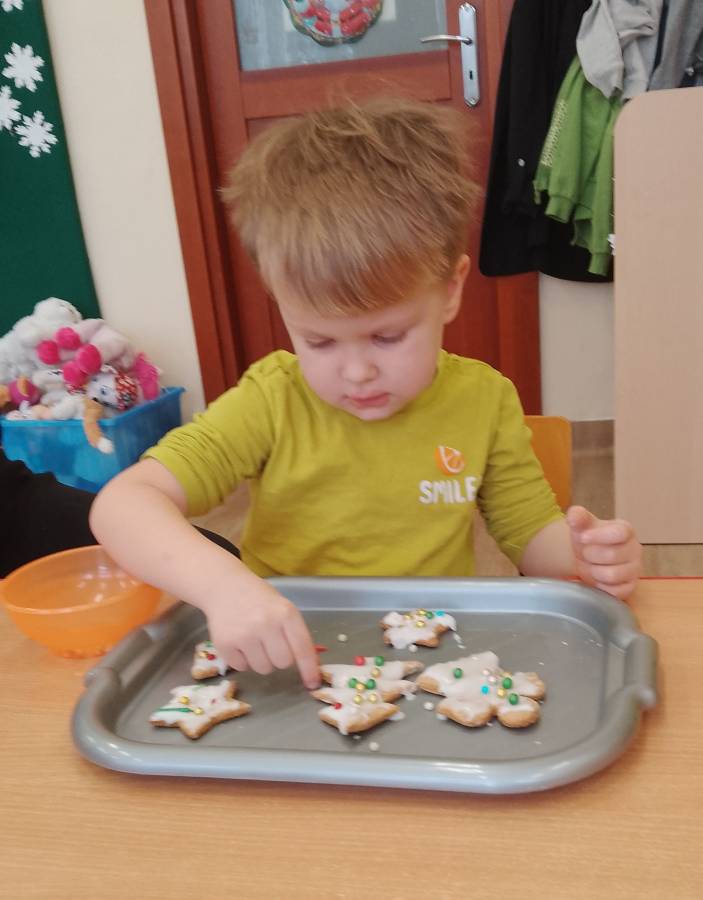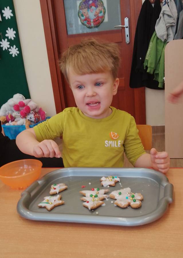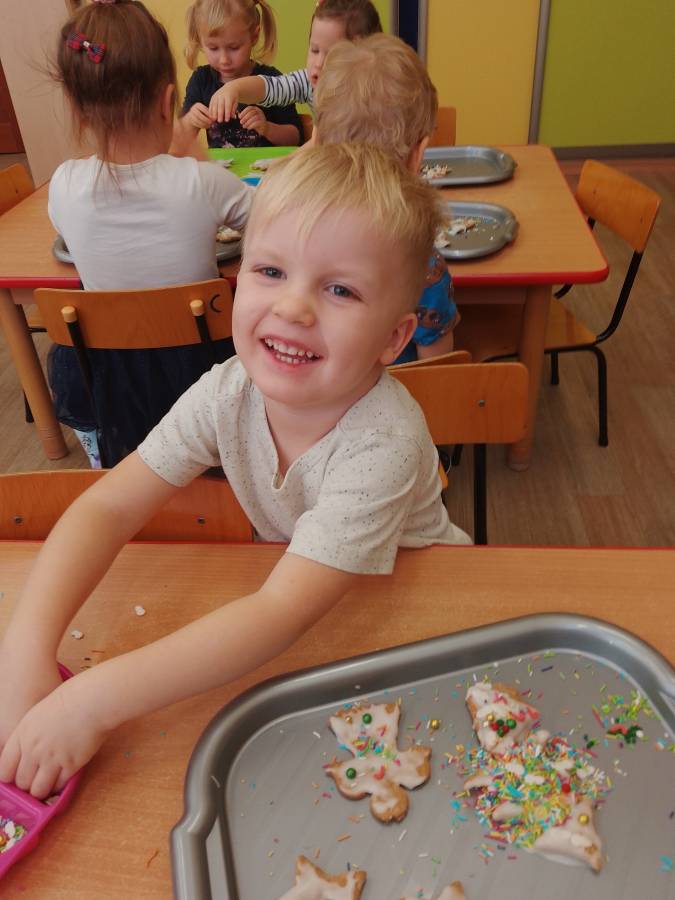 Dzisiaj Biedroneczki zapoznały się z kolejnym zwyczajem świąt Bożego Narodzenia oraz kształtowały motorykę małą podczas ozdabiania pierniczków. Bardzo dziękujemy mamie Basi za przygotowanie słodkości na ten dzień!
