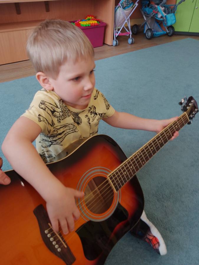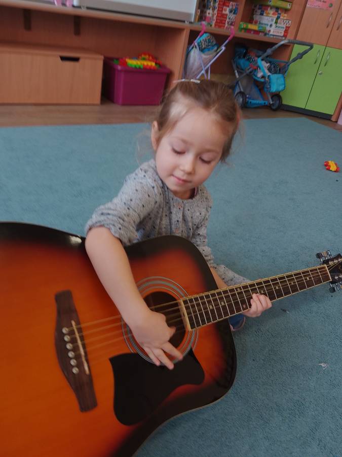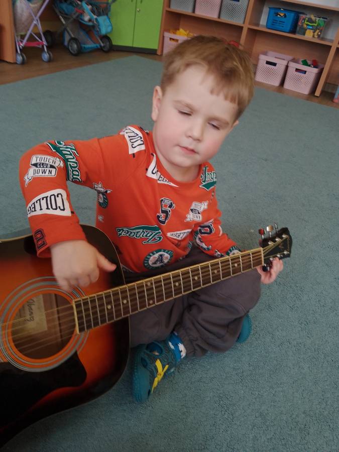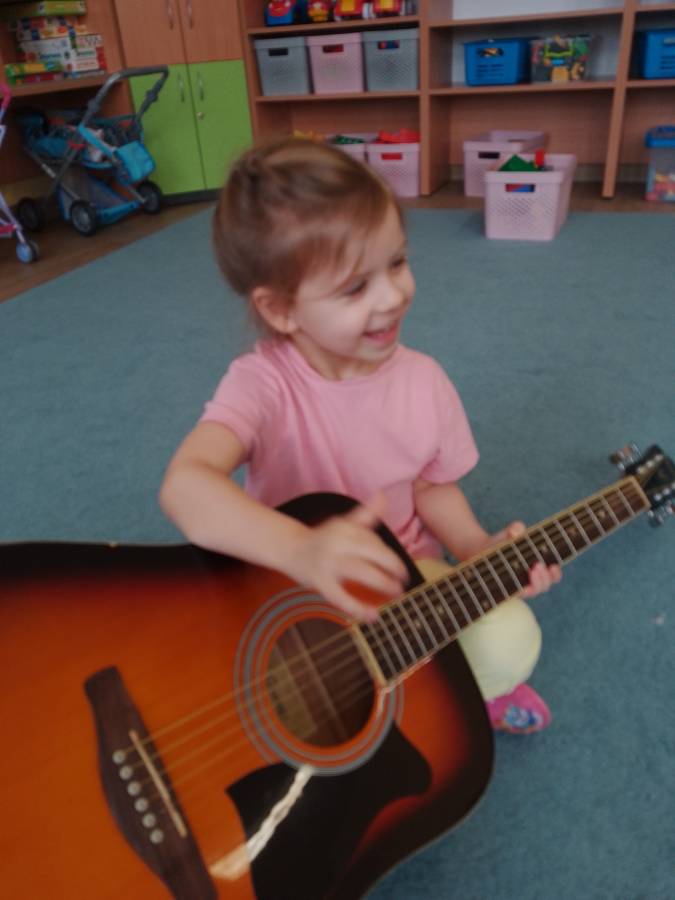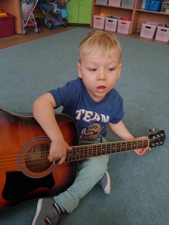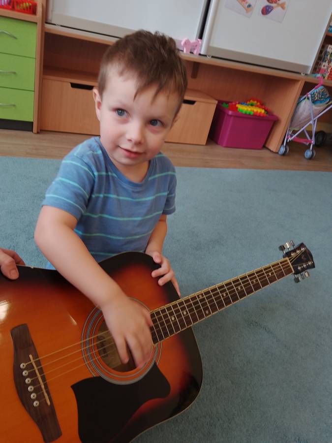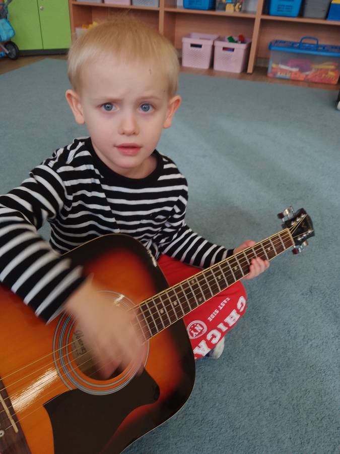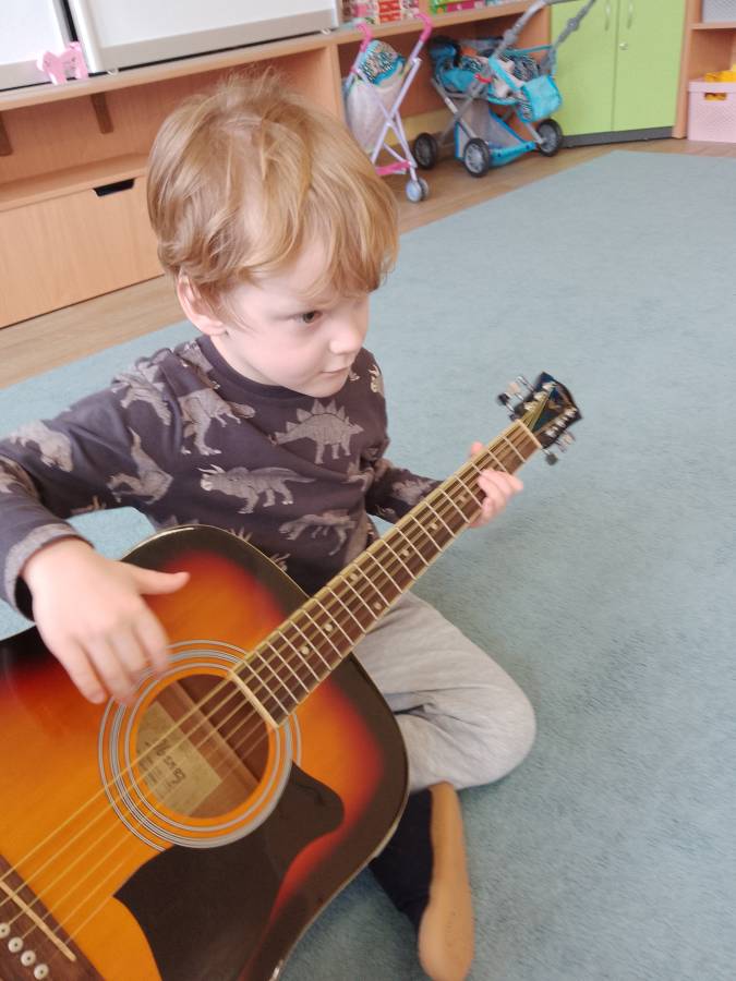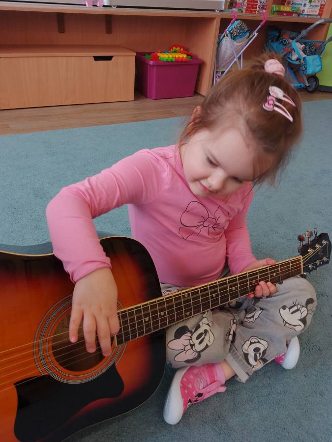 W tym tygodniu nie tylko zapoznaliśmy się z różnymi instrumentami muzycznymi, ale również mieliśmy okazję rozwijać poczucie rytmu, wyobraźnię  i  koncentrację podczas prób gry na gitarze.