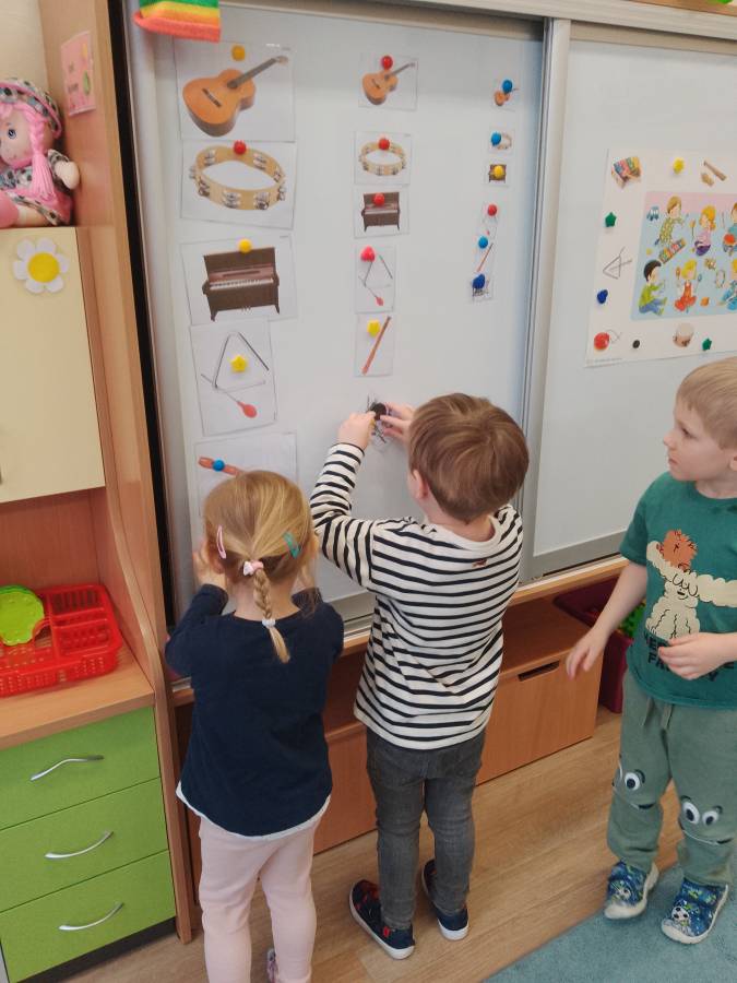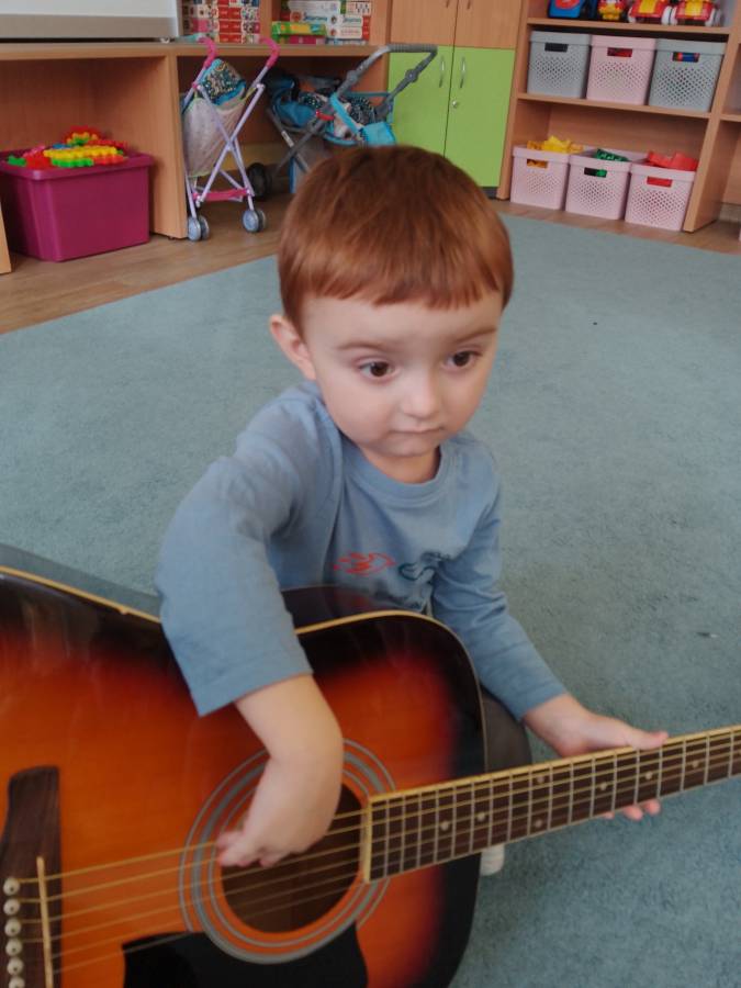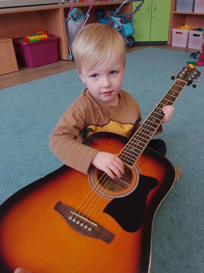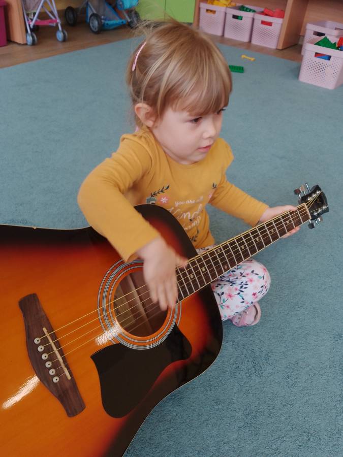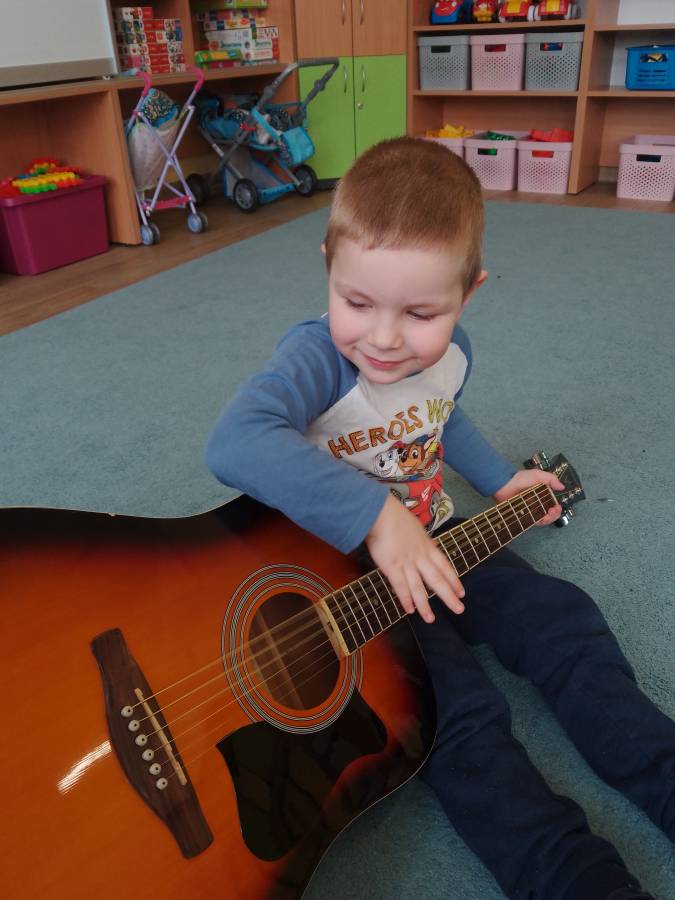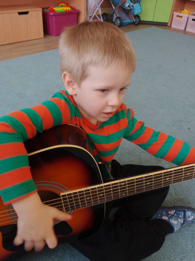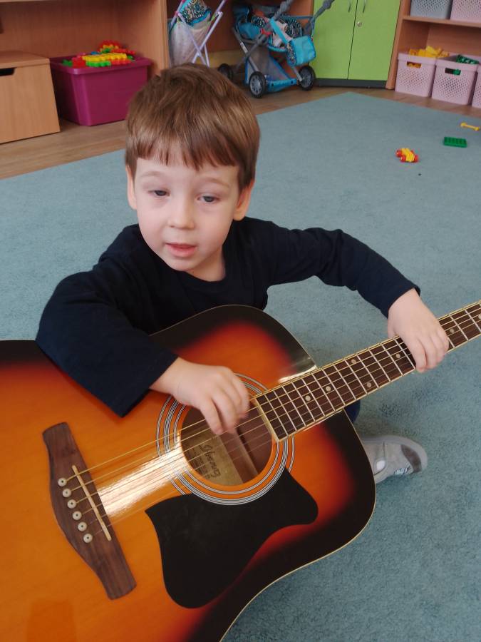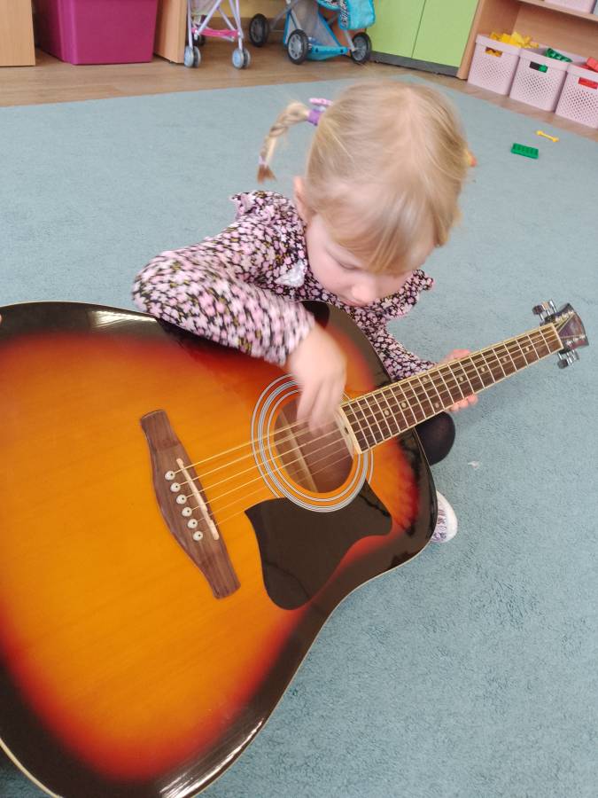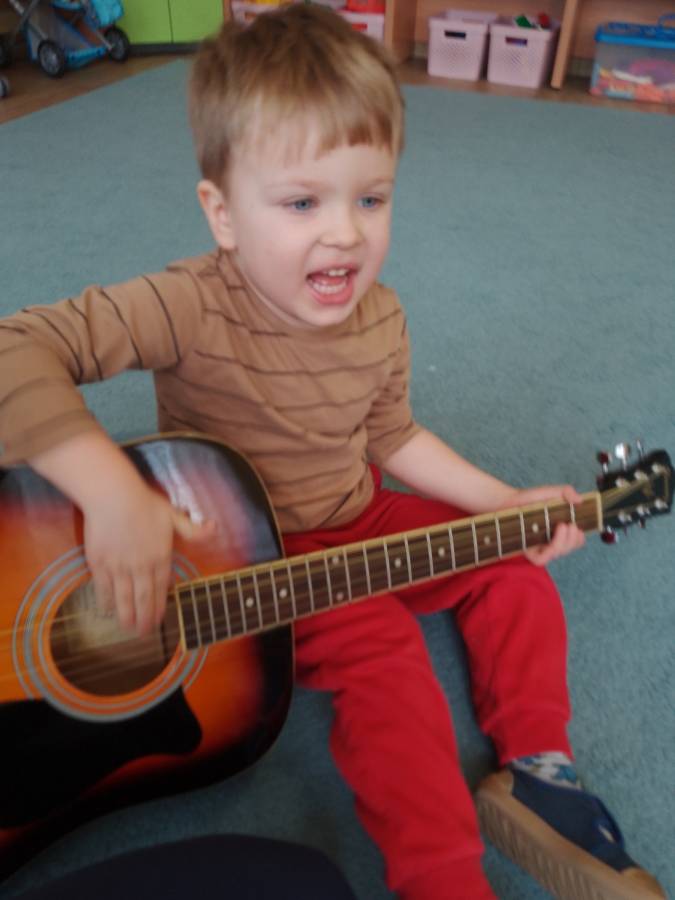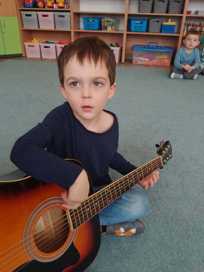 W tym tygodniu nie tylko zapoznaliśmy się z różnymi instrumentami muzycznymi, ale również mieliśmy okazję rozwijać poczucie rytmu, wyobraźnię  i  koncentrację podczas prób gry na gitarze.