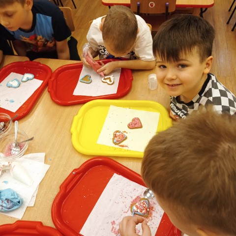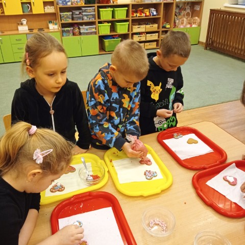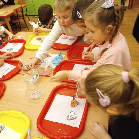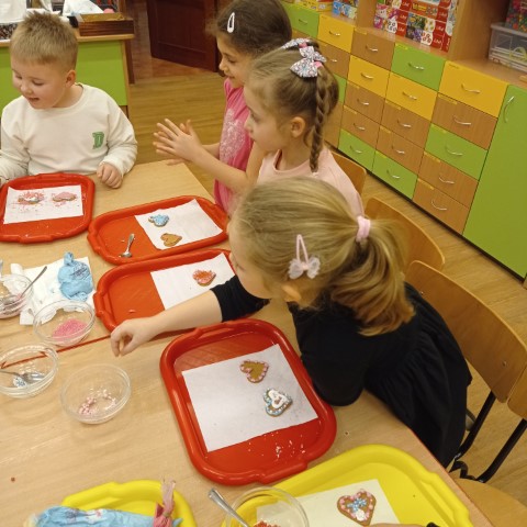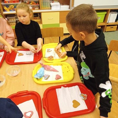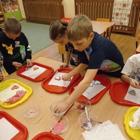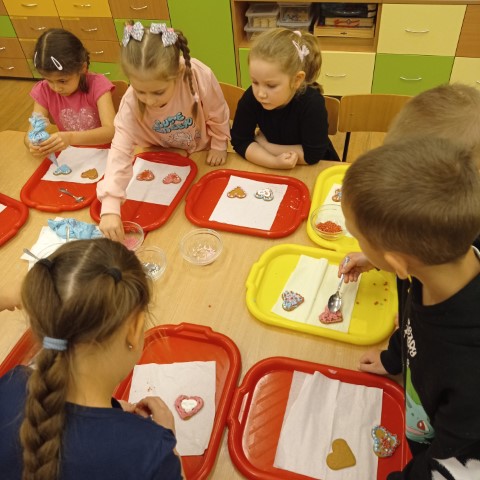 14 lutego w naszej grupie zorganizowaliśmy zabawy z okazji ,,Walentynek?. Dzieci z wielkim zaangażowaniem wykonywały różne zadania a na koniec z radością ozdabiały kolorowym lukrem i posypkami piernikowe serduszka przygotowane przez mamusię Kajtusia. Było bardzo wesoło i słodko. Bardzo dziękujemy.