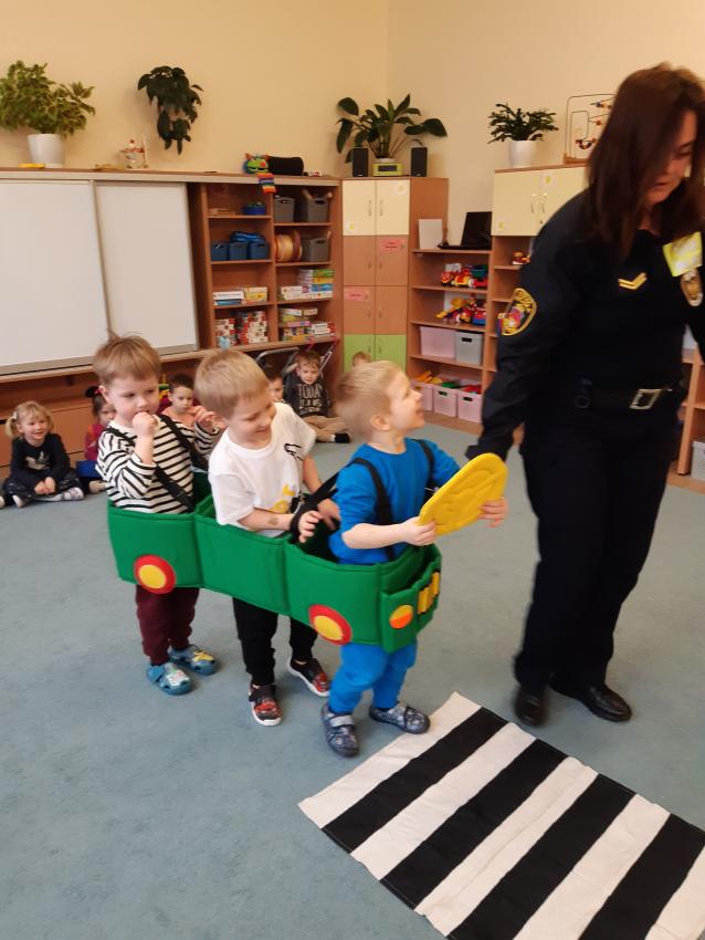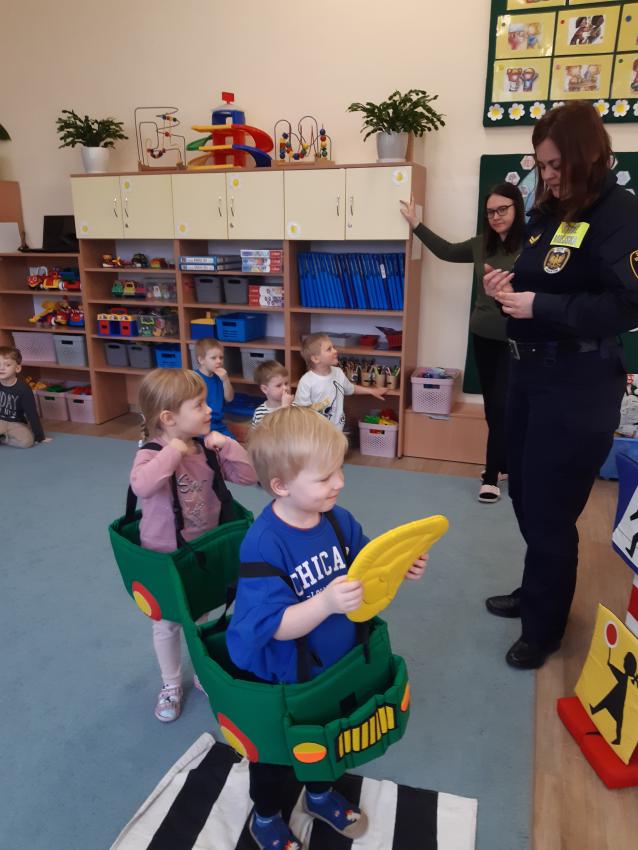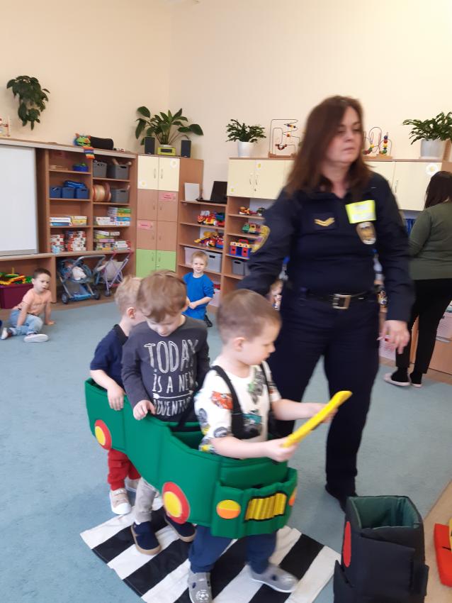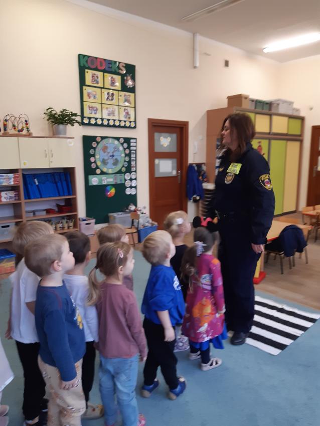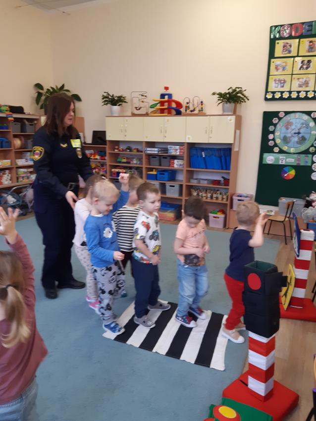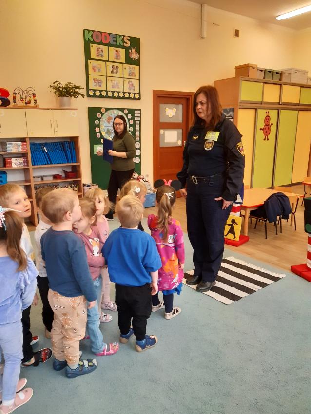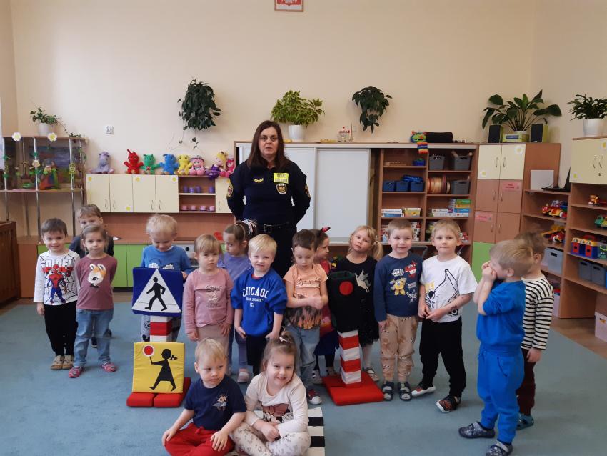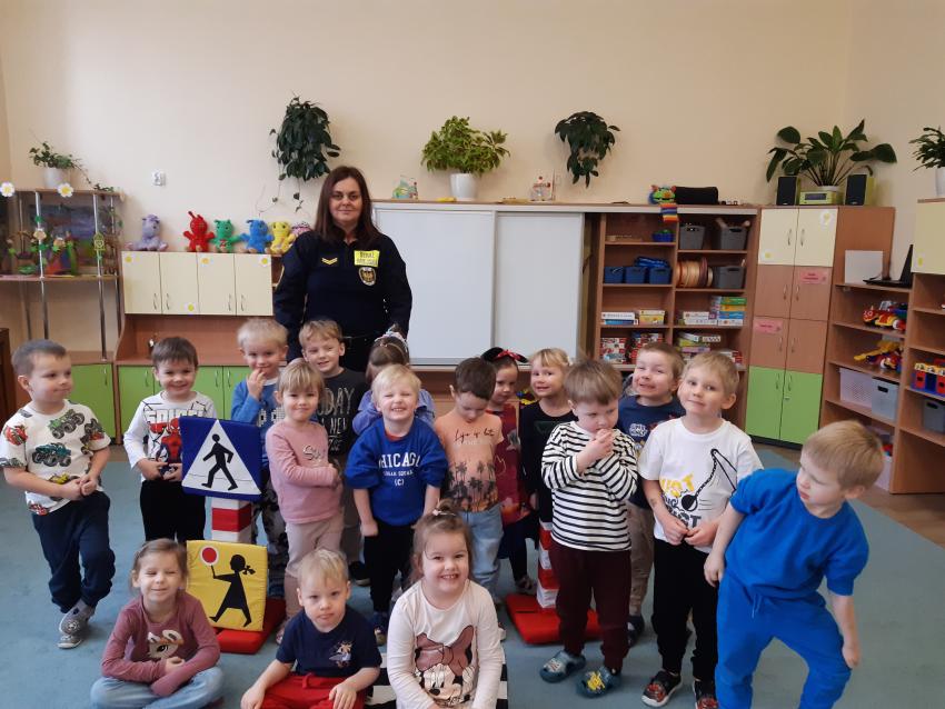 Podczas spotkania ze Strażą Miejską dzieci utrwaliły znajomość podstawowych znaków drogowych, oraz zasady zachowania bezpieczeństwa w ruchu drogowym.