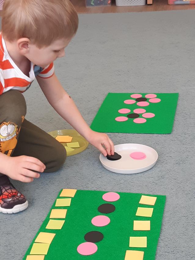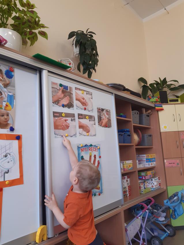 Układamy obrazkową kolejność czynności mycia rąk .Układamy i kontynuujemy matematyczne rytmy- wzorki na ręczniku. Odtwarzamy muzyczne rytmy na wybranych instrumentach . Rozumiemy konieczność częstego mycia rąk .