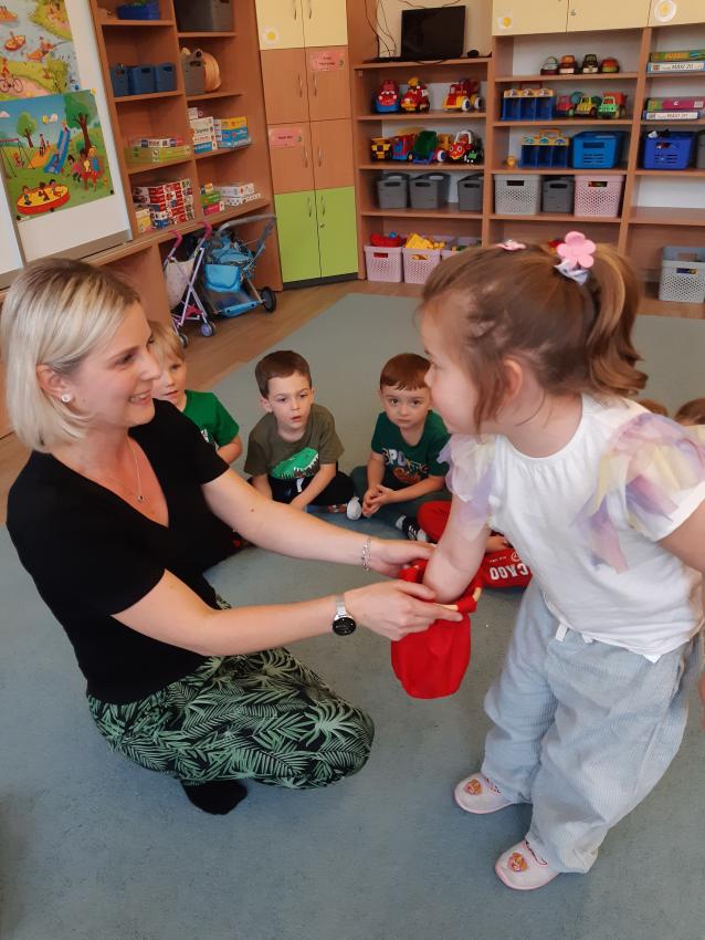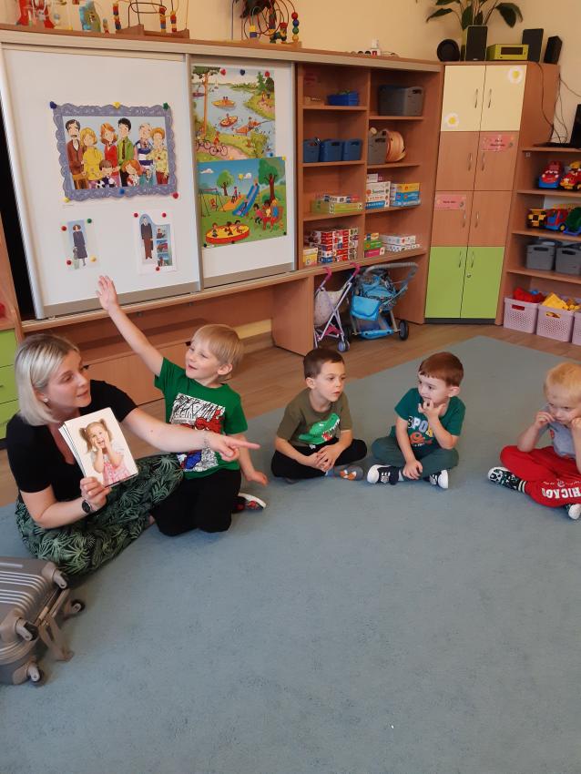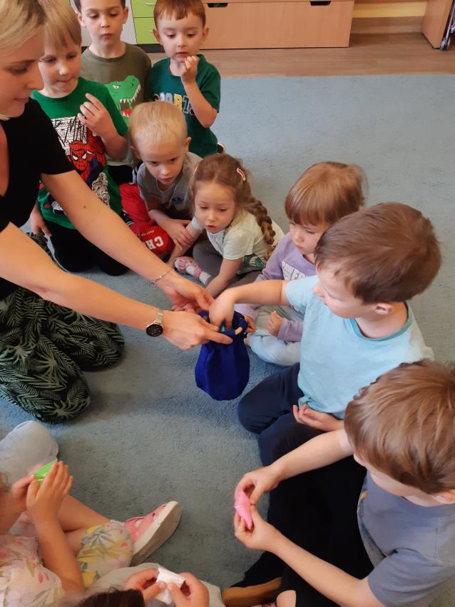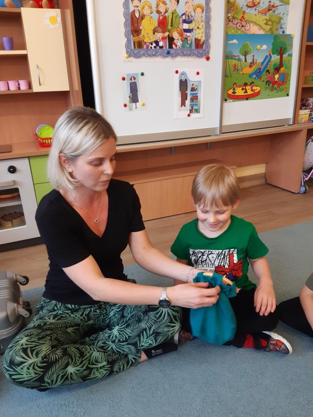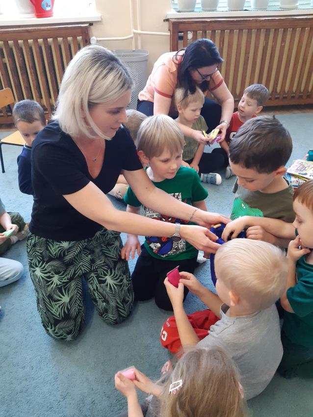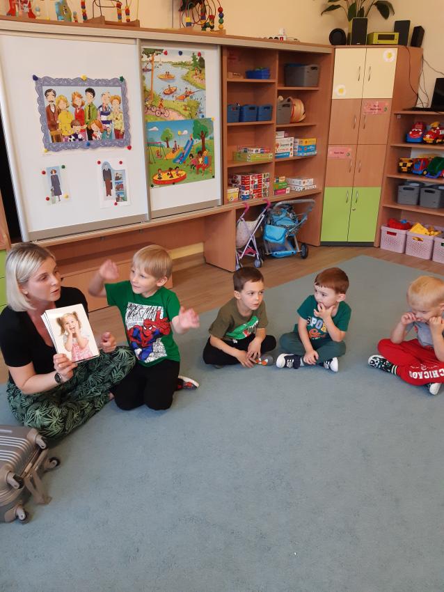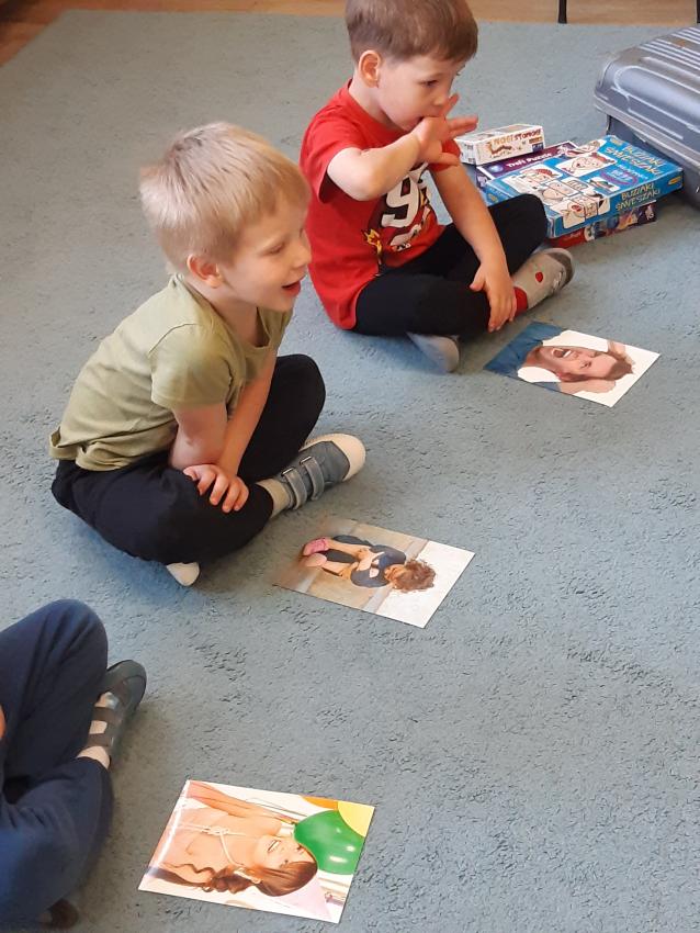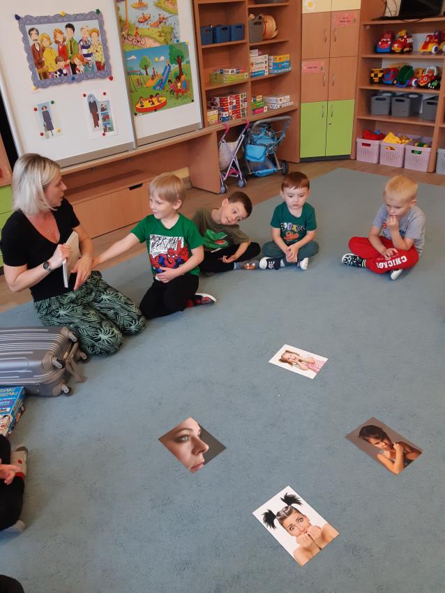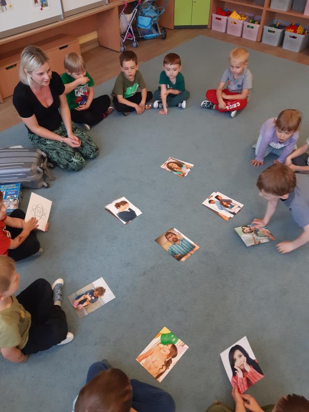 Grupę Biedronek odwiedziła mamusia Filipa która jest psychologiem . Opowiedziała o swojej , zaprezentowała pomoce którymi posługuje się w pracy, wspólnie odgadywaliśmy ich nazwy poprzez zabawę sensoryczną "co to może być?". Mamusia Filipa opowiadała o różnych emocjach które towarzyszą nam na co dzień, wspólnie zastawialiśmy się jak sobie radzić z emocjami. Rozpoznawaliśmy i nazywaliśmy emocje przedstawione na obrazkach. Był też czas na wspólną wesołą zabawę ruchową podczas której dzieci wcielały się w postać przedstawioną na obrazku. Spotkanie było wspaniałą "lekcją" utrwalającą rozpoznawanie stanów emocjonalnych i możliwości radzenia sobie z różnymi stanami emocjonalnymi. Na zakończenie spotkania mamusia Filipa przeczytała dzieciom książeczkę interaktywną pt "Emocje". Spotkanie odbyło się w serdecznej atmosferze , a na twarzach dzieci dominowało zaciekawienie i radość .Serdecznie dziękujemy za spotkanie i poświęcony czas. DZIĘKUJEMY.