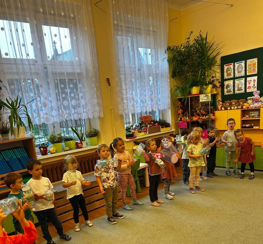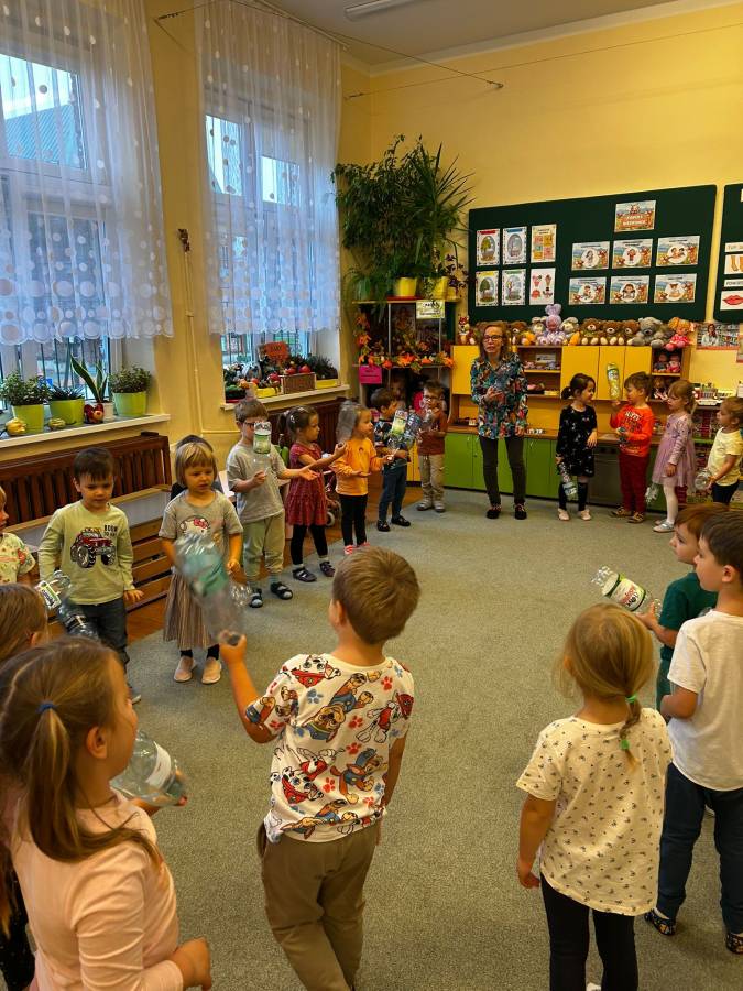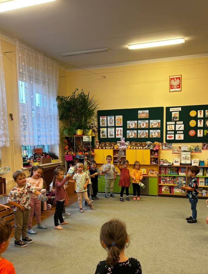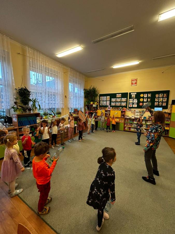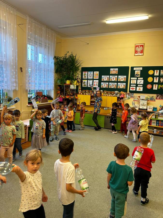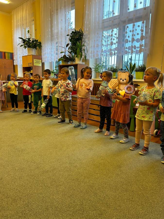 Dzisiaj Biedroneczki miały okazję wykorzystać zużyte, plastikowe butelki do zabawy rytmicznej. Dzięki czemu nie tylko rozwijały swoją wrażliwość muzyczną i ekspresję ruchową, ale również kształtowały postawy ekologiczne i świetnie się bawiły.