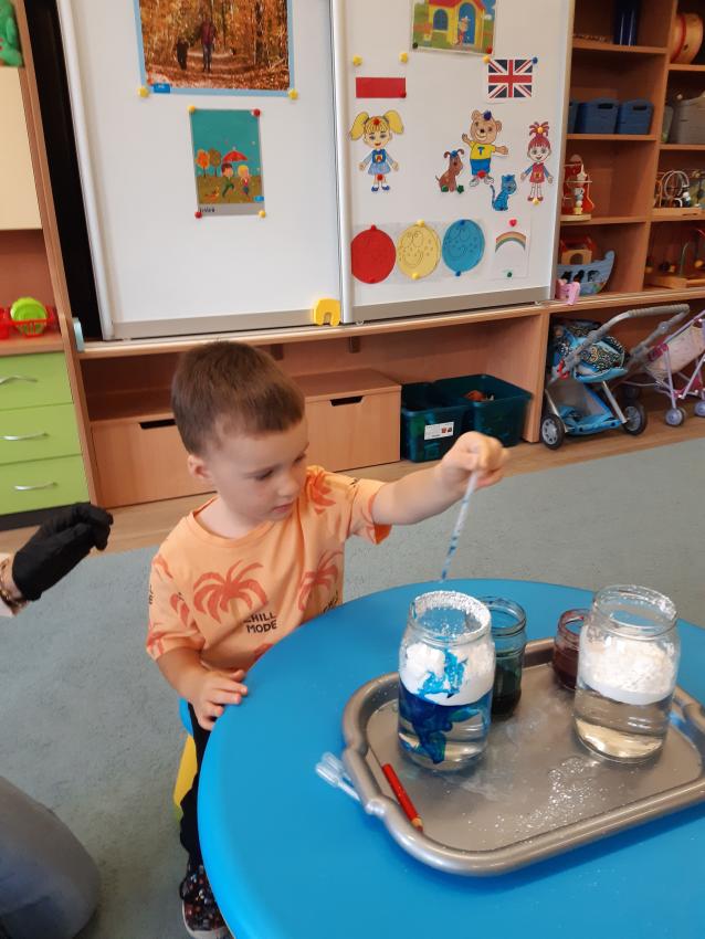 Kiedy z chmury pada deszcz? szukaliśmy odpowiedzi na tak zadane pytanie.Obserwacja i samodzielne działania dzieci podczas prowadzonego eksperymentu pozwoliły na wyjaśnienie ,a równocześnie doskonaliły umiejętności koncentracji i uwagi .