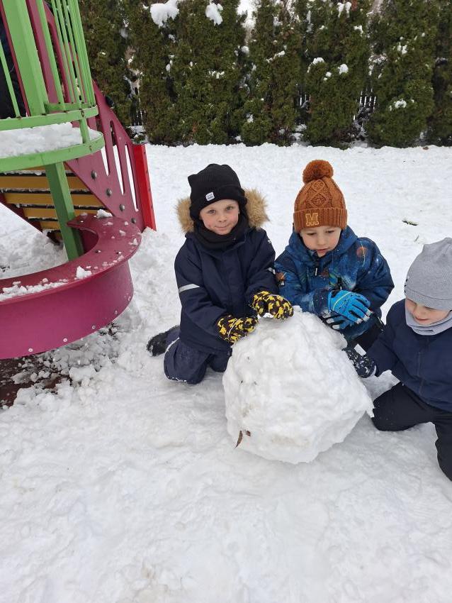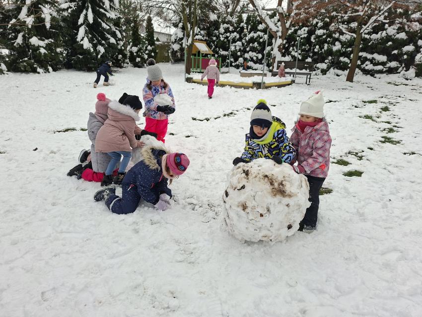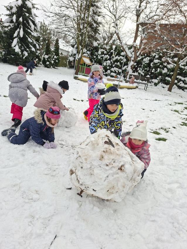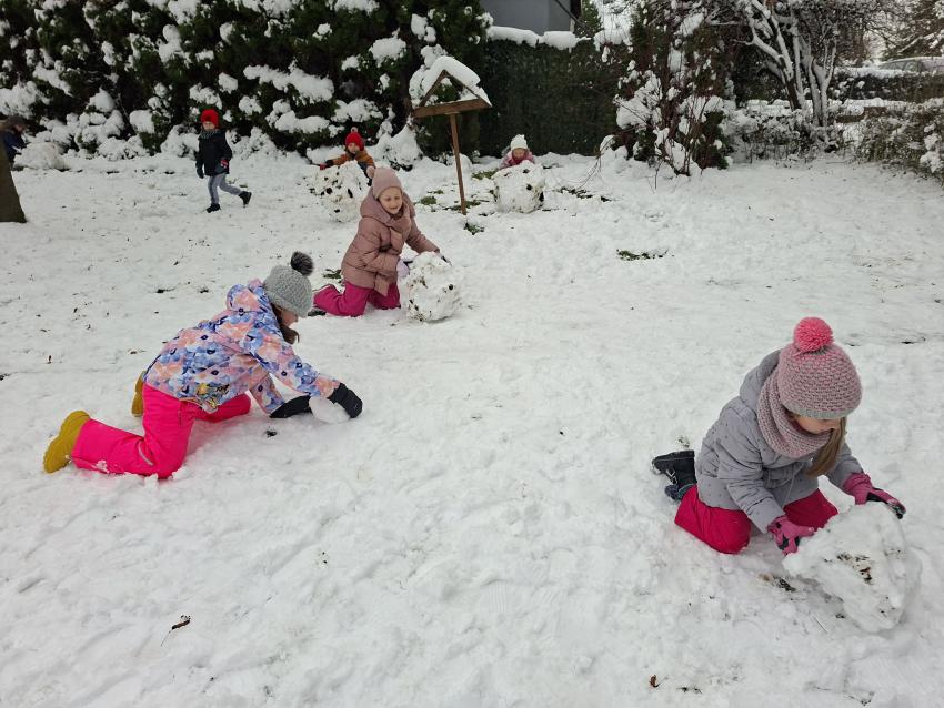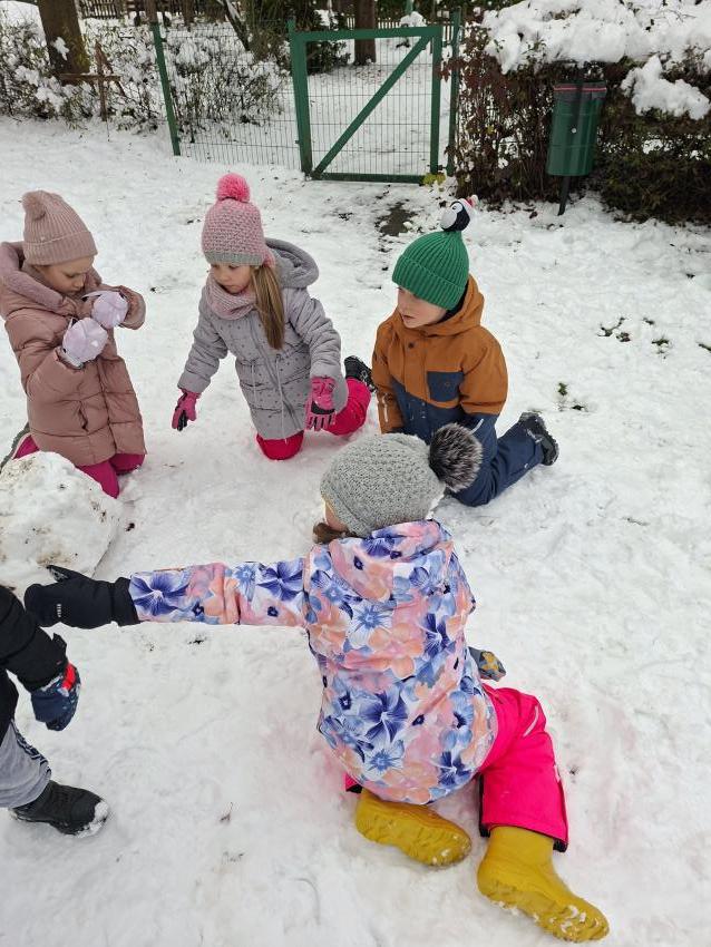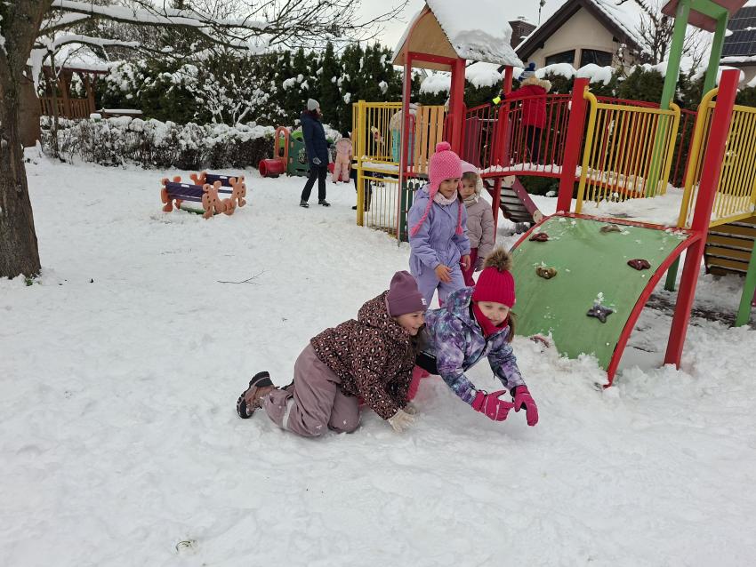Przedszkolaki ogromnie cieszyły się z pojawienia pierwszego śniegu. Szkoda, że tak szybko topnieje. Z entuzjazmem toczyły kule śniegowe, robiły aniołki, wydeptywały ślady i biegały po ogrodzie przedszkolnym, a uśmiechy nie schodziły ze szczęśliwych buzi. Mamy nadzieję, że biała zima wkrótce powróci.