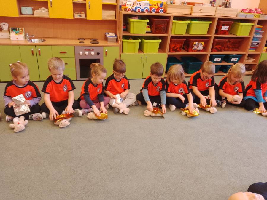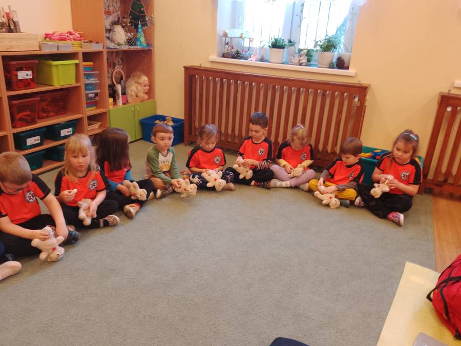 Biedroneczki zapoznały się z zasadami pierwszej pomocy podczas warsztatów z panią ratownik. Z uwagą słuchały opowieści i z zaangażowaniem brały udział we wszystkich ćwiczeniach.