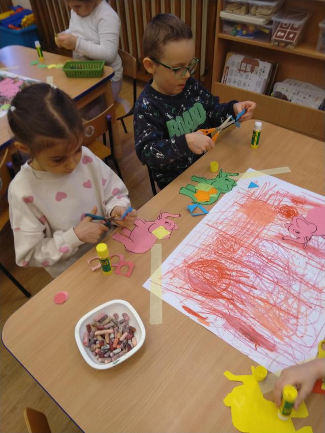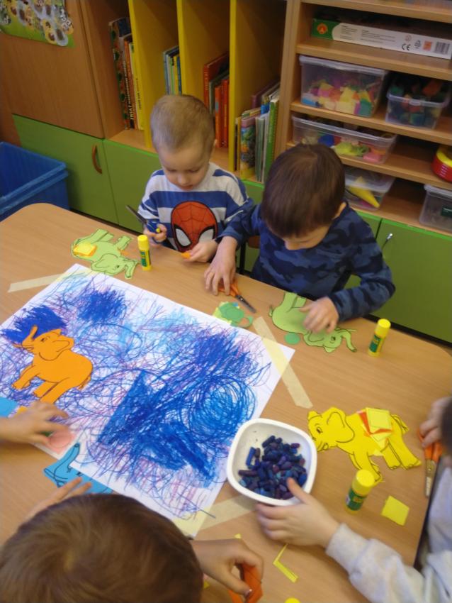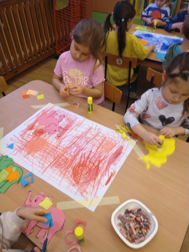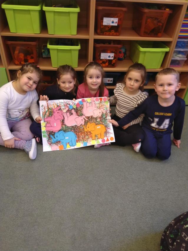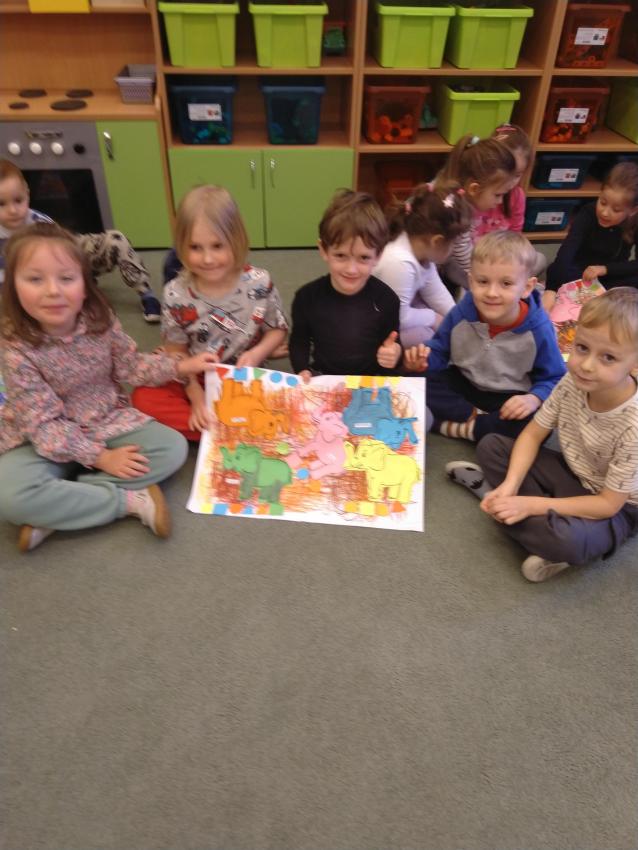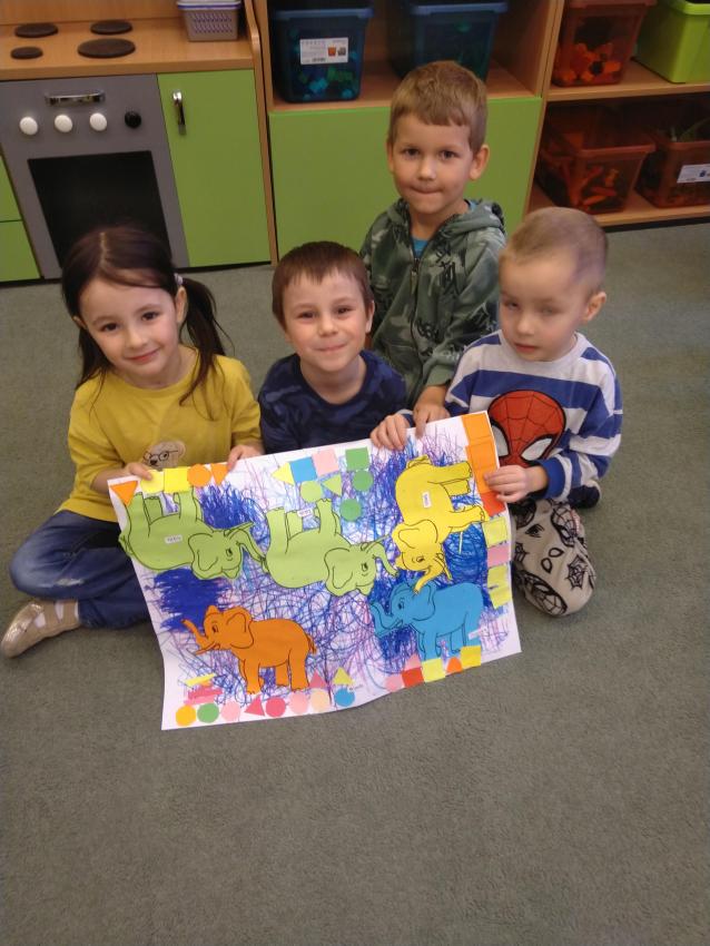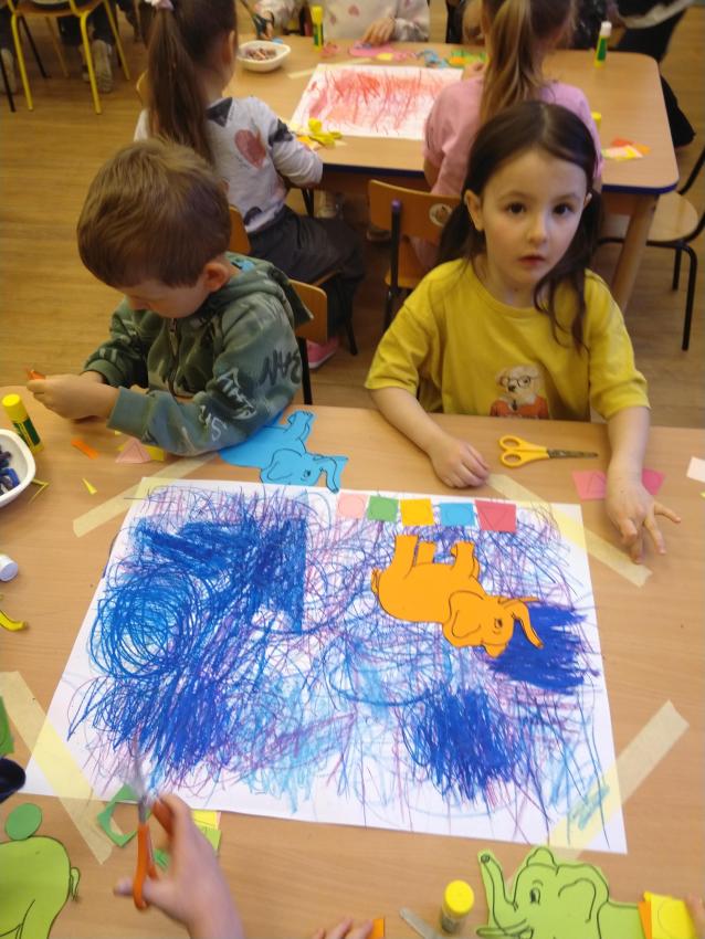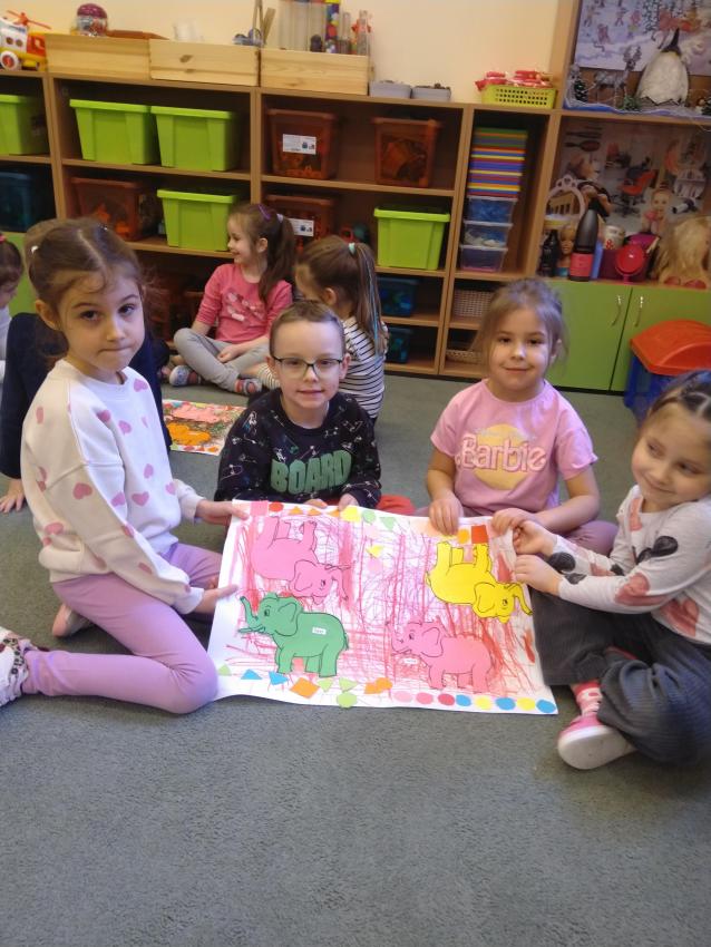 Dzisiaj dzieci brały udział w zajęciach z wykorzystaniem elementów metody D. Dziamskiej. Oglądały teatrzyk ?Słoń Trąbalski?. Podczas zabaw i zadań przekładały obraz graficzny na ruch, rysowały obiema rękami równocześnie pobudzając obie półkule mózgowe, bawiły się przy piosence ?Cztery słonie?. Podczas pracy przy stolikach wykonały zespołowe prace plastyczne pt.: ?Zadania dla słonia?. Doskonaliły technikę wycinania, swobodny wybór, poczucie estetyki, umiejętność współpracy.