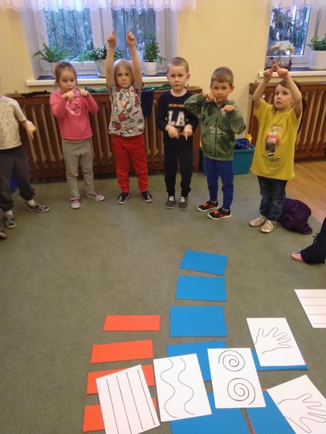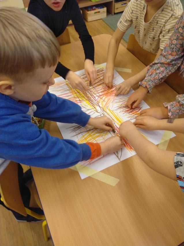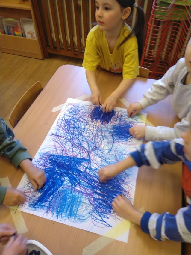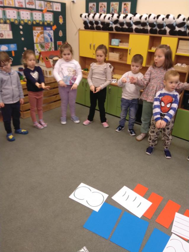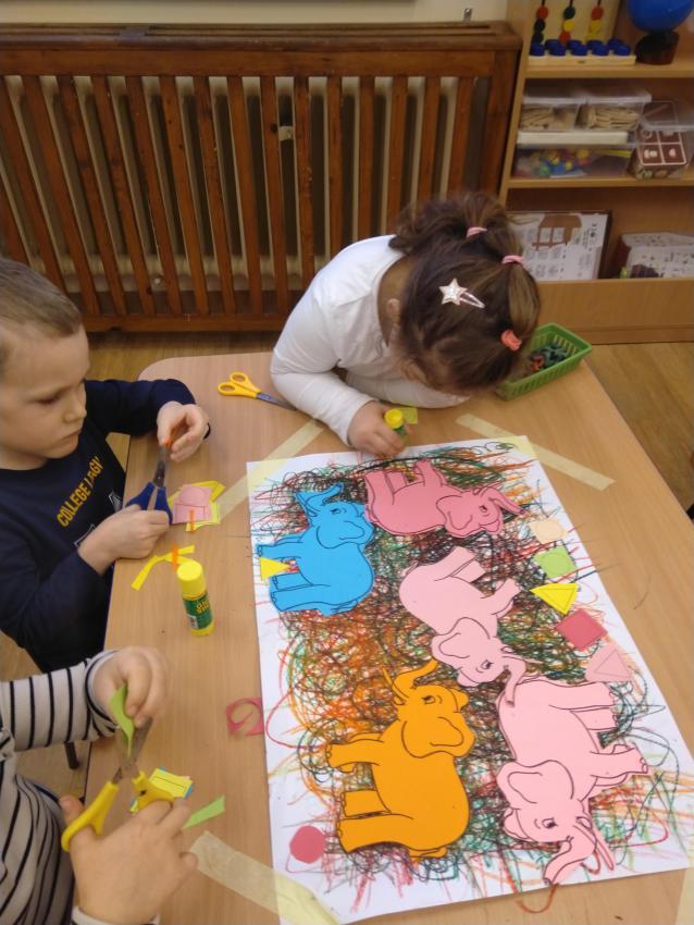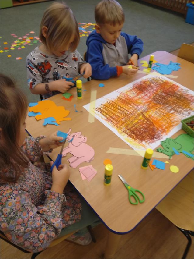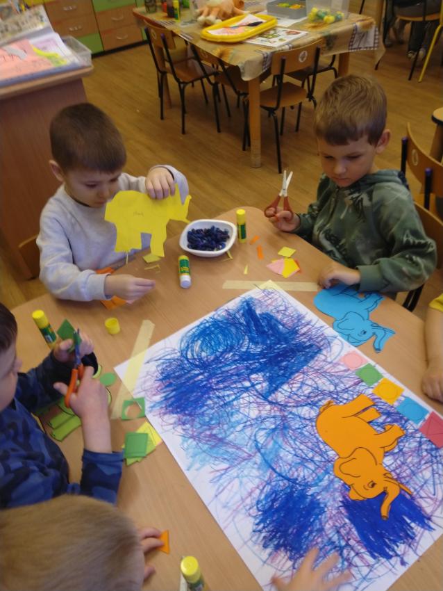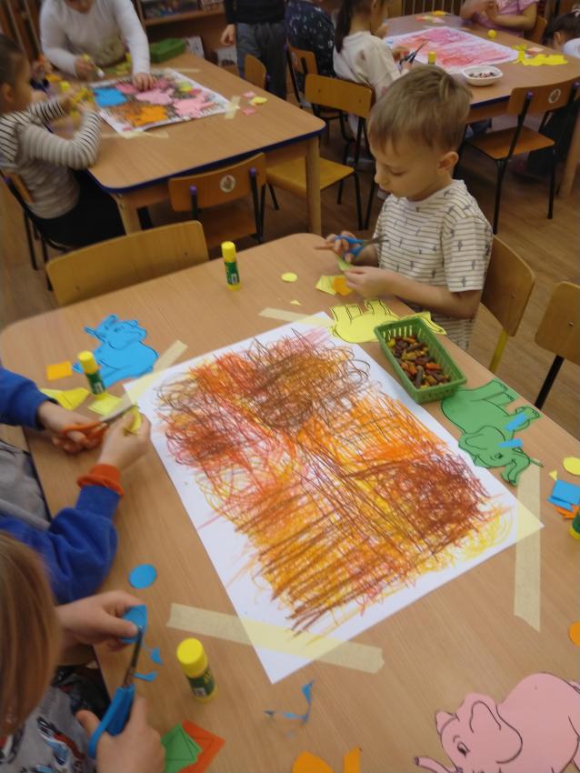 Dzisiaj dzieci brały udział w zajęciach z wykorzystaniem elementów metody D. Dziamskiej. Oglądały teatrzyk ?Słoń Trąbalski?. Podczas zabaw i zadań przekładały obraz graficzny na ruch, rysowały obiema rękami równocześnie pobudzając obie półkule mózgowe, bawiły się przy piosence ?Cztery słonie?. Podczas pracy przy stolikach wykonały zespołowe prace plastyczne pt.: ?Zadania dla słonia?. Doskonaliły technikę wycinania, swobodny wybór, poczucie estetyki, umiejętność współpracy.