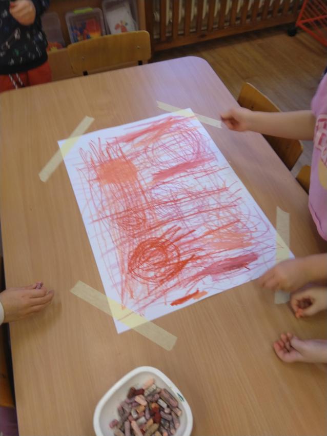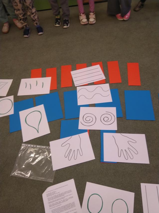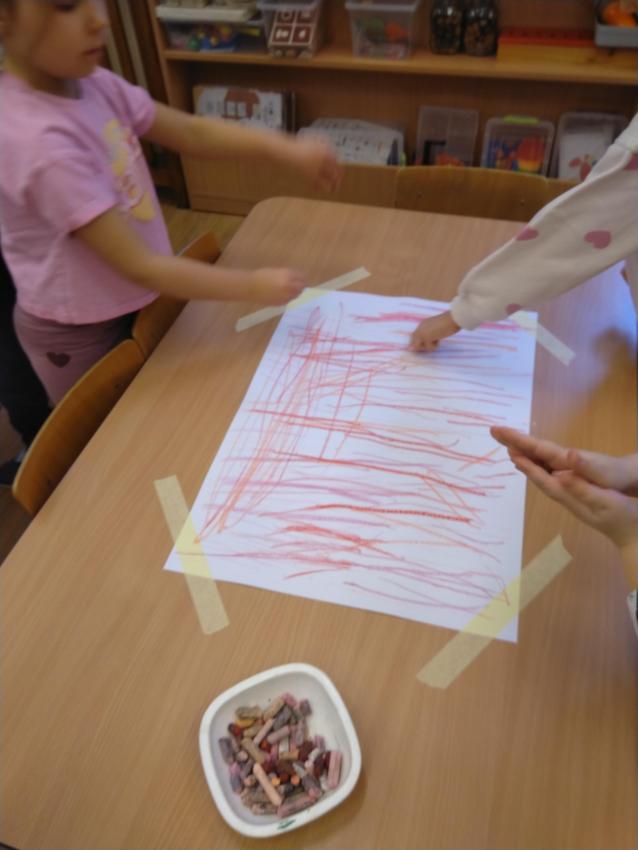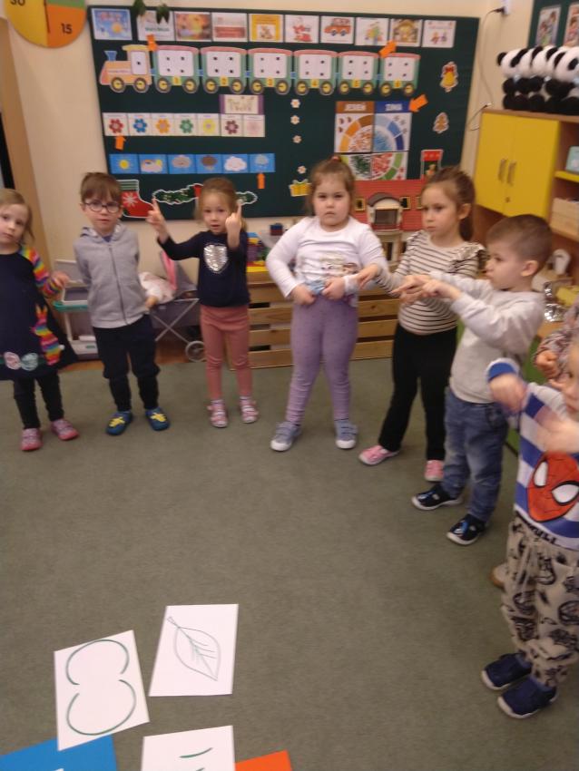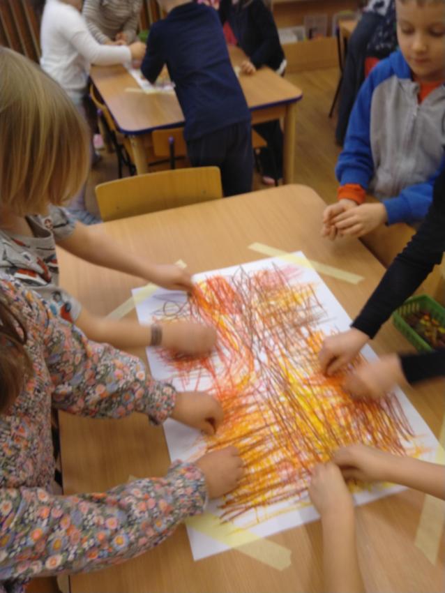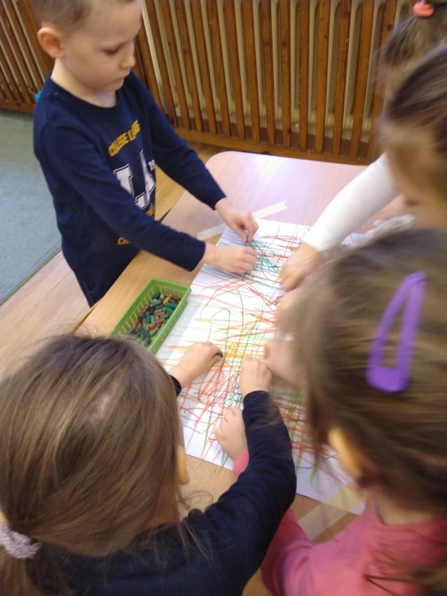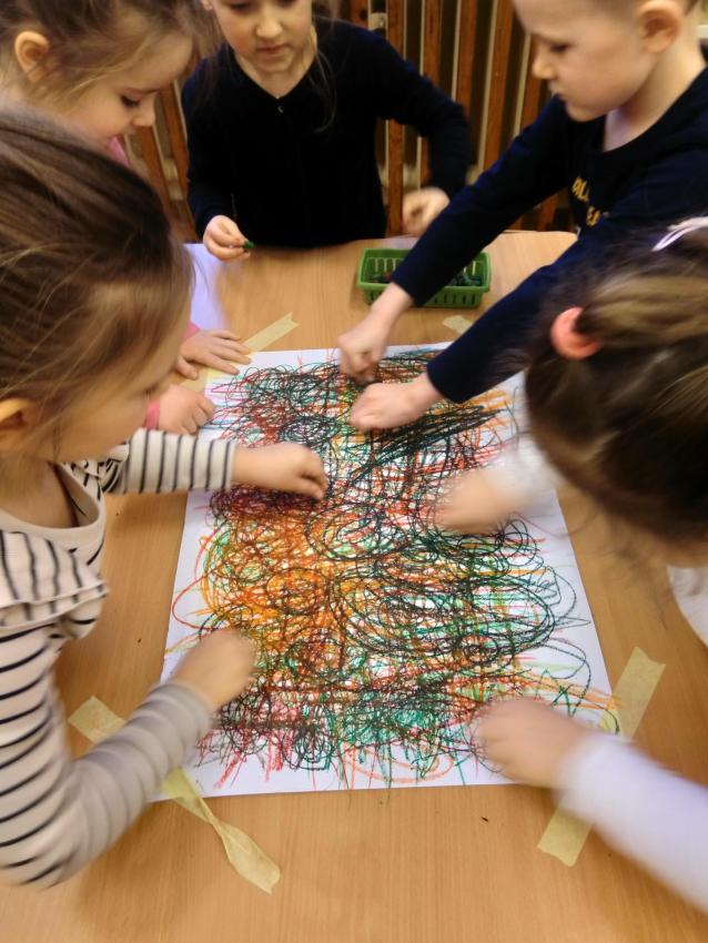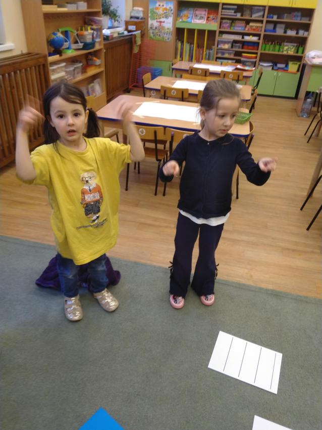 Dzisiaj dzieci brały udział w zajęciach z wykorzystaniem elementów metody D. Dziamskiej. Oglądały teatrzyk ?Słoń Trąbalski?. Podczas zabaw i zadań przekładały obraz graficzny na ruch, rysowały obiema rękami równocześnie pobudzając obie półkule mózgowe, bawiły się przy piosence ?Cztery słonie?. Podczas pracy przy stolikach wykonały zespołowe prace plastyczne pt.: ?Zadania dla słonia?. Doskonaliły technikę wycinania, swobodny wybór, poczucie estetyki, umiejętność współpracy.
