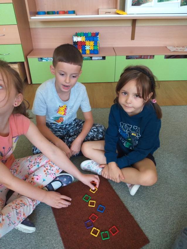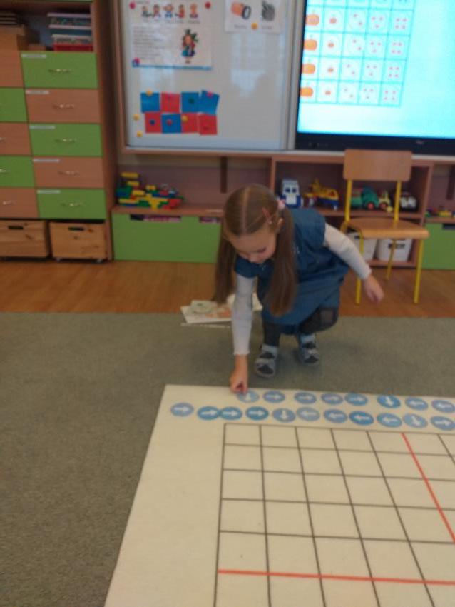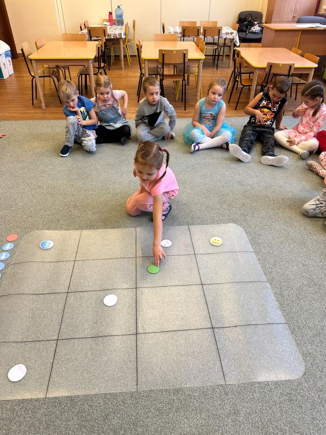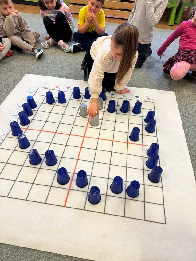 Dzisiaj na zajęciach przedszkolaki rozwijały umiejetność analitycznego myślenia, rozumowania i wnioskowania. Podczas zabaw w kodowanie dzieci układały kolorowe kubki na macie na podstawie podanych współrzędnych. Podczas quizu wykazały sie wiedzą na temat Polski, a właściwe odpowiedzi tworzyły wieżę. W grze zespołowej świetnie współpracowały ze sobą i z zaangażowaniem walczyły o punkty dla swojej drużyny. Kodowanie wzbudziło wiele pozytywnych emocji i stworzyło okazję do dokonywania wyborów.
