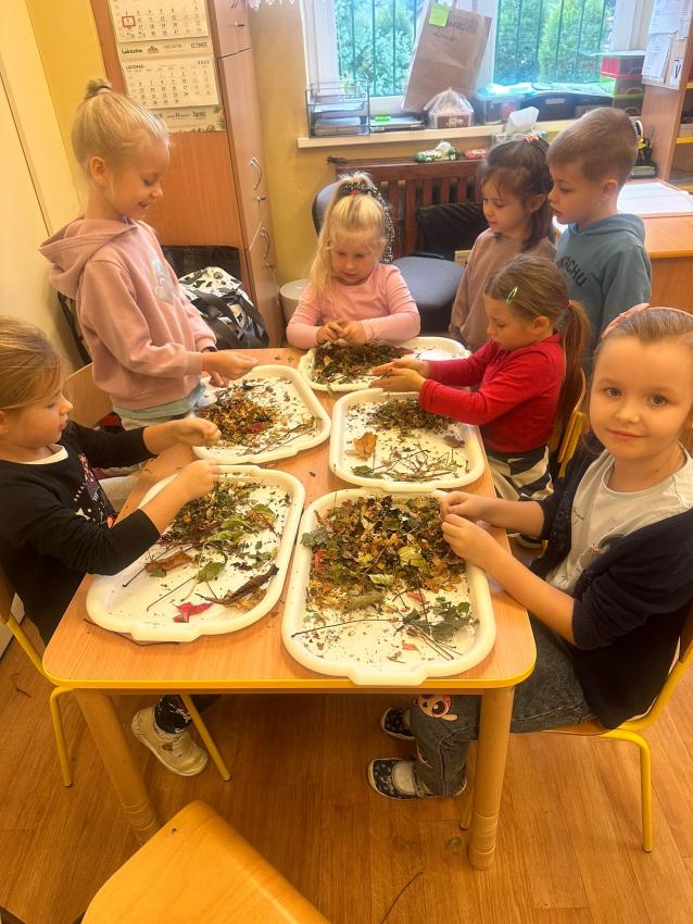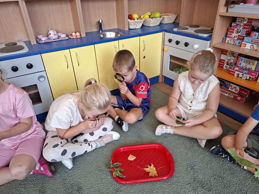 Dzisiaj w czasie zajęć dydaktycznych dzieci przeprowdziły ćwiczenia badawcze. Oglądały przez lupę liście w pierwszych barwach jesieni. Poznały i nazywały poszczególne części liścia: blaszkę z żyłkami i ogonek liściowy oraz ich funkcje. Rozpoznawały też gatunki drzew na podstawie badanych liści. Przedszkolaki poszerzały swoją wiedzę na postawie własnych obserwacji.