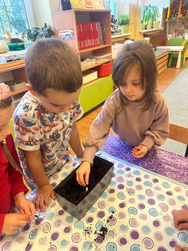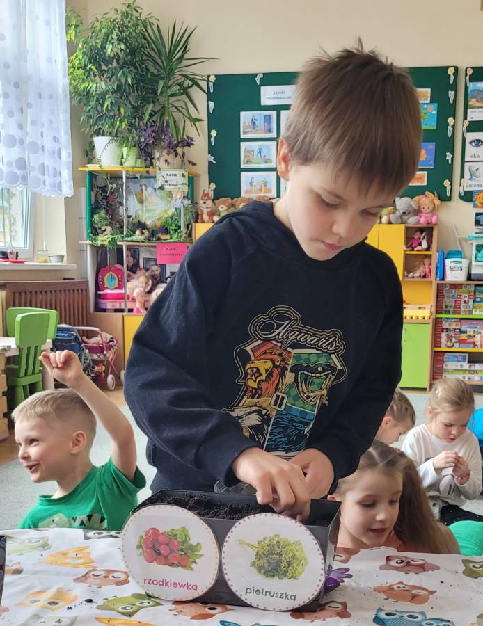 Przedszkolaki w małych zespołach posadziły nasiona fasoli, cebulki kwiatów ozdobnych oraz posiały zioła i mikrolistki warzyw. Donice zostały umieszczone na parapecie okiennym. Mali ogrodnicy poprzez bezpośrednią obserwację będą miały możliwość poznania cyklu rozwojowego roślin, pamiętając o systematycznej pielęgnacji.