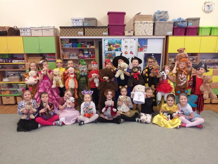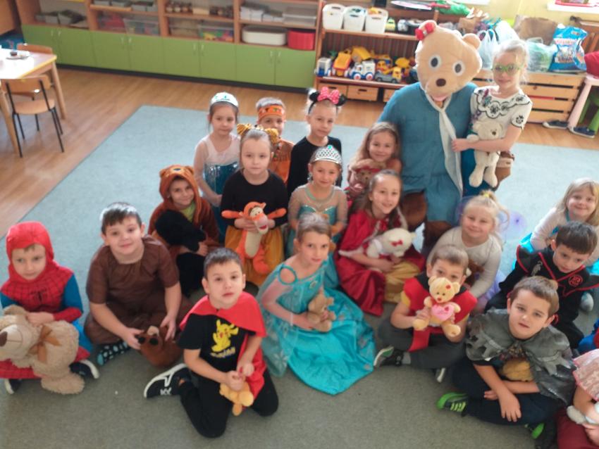 W piątek w naszej grupie zorganizowaliśmy Dzień Pluszowego Misia. Dzieci przebrały się w wybrane przez siebie stroje i wzięły udział w przedstawieniu z podziałem na role?i z niespodzianką. Przybył do nas Miś, a właściwie to Pani Misiowa, która wzbudziła wiele pozytywnych emocji i niesamowitej radości. Potem była wspólna zabawa taneczna i przytulanki?