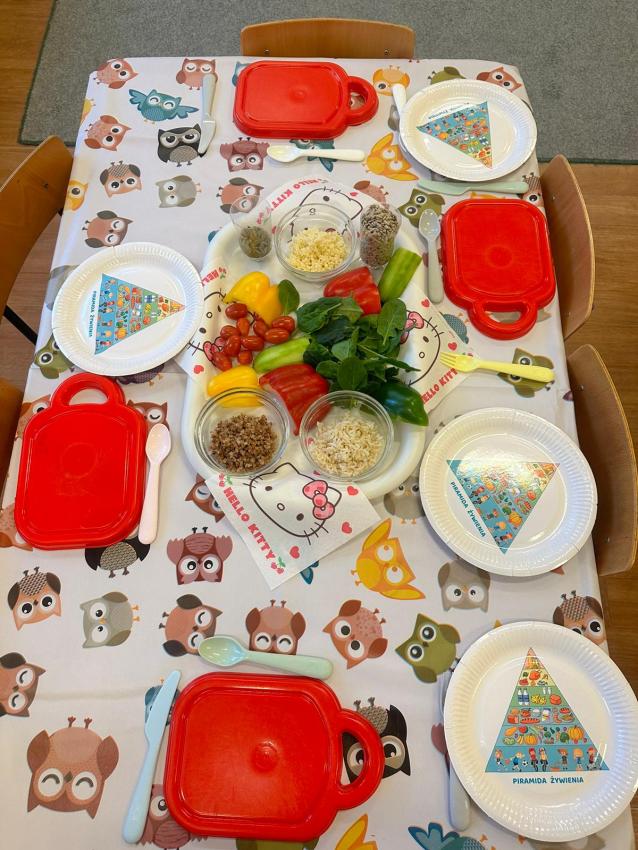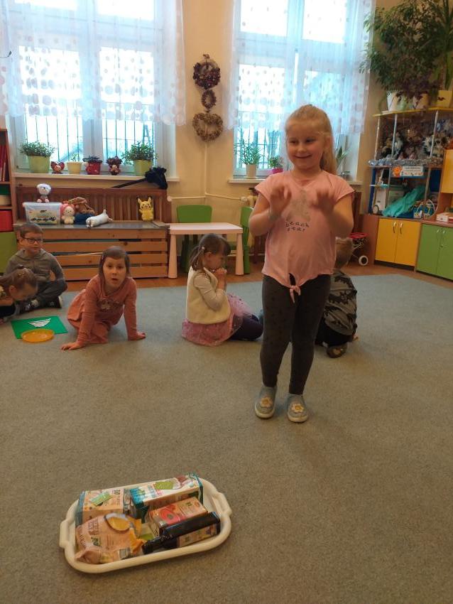 W tym tygodniu przedszkolaki z grupy Mróweczki uczestniczyły w realizacji projektu SKĄD SIĘ BIORĄ PRODUKTY EKOLOGICZNE. Po obejrzeniu filmiku edukacyjnego i zapoznaniem z zakupionymi produktami ze znaczkiem EKO dzieci dowiedziały się o pochodzeniu produktów ekologicznych jako naturalnego pokarmu bez sztucznych i niezdrowych dodatków. Przedszkolaki zapoznały się z piramidą zdrowego stylu życia i racjonalnego odżywiania. W małych zespołach układały piramidę żywienia, analizowały jej zawartość poprzez odwoływanie się do wielkości paska piramidy. Następnie każda grupa wskazywała ruchem dyscyplinę sportową według własnego pomysłu na rozwijanie koordynacji ruchowej.