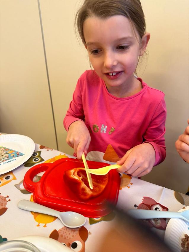 W ramach projektu Zdrowe Dzieci komponowaliśmy zdrową sałatkę z kolorowych warzyw: papryki, pomidorków koktailowych, ogórka, szpinaku z dodatkiem kaszy pełnoziarnistej oraz słonecznika i pestek dyni. Nasze sałatki wyglądały smakowicie i ku zaskoczeniu wszyscy zajadali ze smakiem i uśmiechami na twarzy . Brawo.
