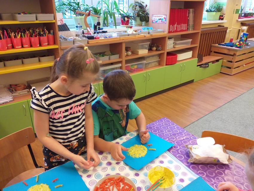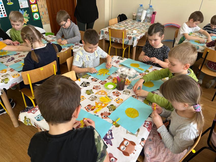 Dzisiaj na zajęciach wykonywaliśmy pracę plastyczną SŁOŃCE. Zastosowaliśmy różne techniki plastyczne. Przedszkolaki z zaangażowaniem malowały farbą połączoną z kaszą manną oraz strukturą z pianki do golenia, kleju i farby, a następnie przyklejały kolorowy makaron. Dzieci były bardzo zadowolone z rezultatu wykonanej pracy.
