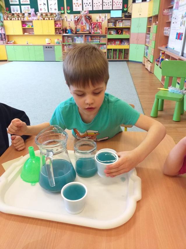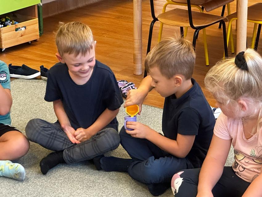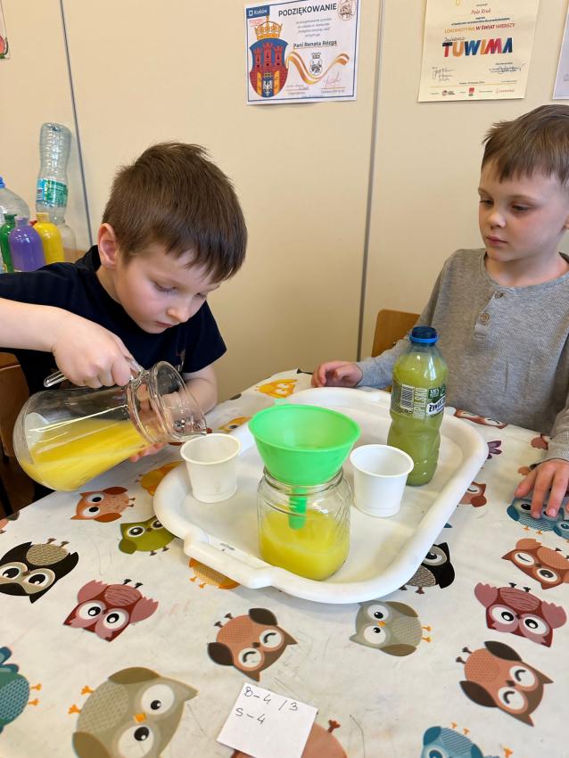 Dzieci w czasie zabawy badawczej szacowały, porównywały i mierzyły objętość wody. Zgodnie współpracowały w małych zespołach, najpierw szacowały ile kubków kolorowej wody zmieści się do słoika. Potem powtórzyły badanie i określały jaka ilość kubków wypełni platikową butelkę. Przedszkolaki z wielką ciekawością sprawdzały rezultat doświadczenia. Każda drużyna wykonała zadanie na medal.