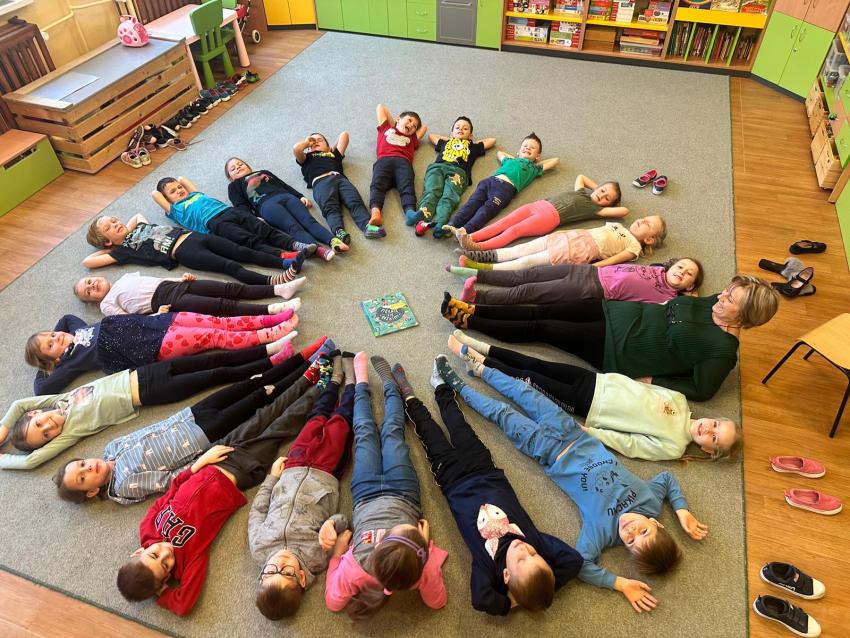 Przedszkolaki po dniu pełnym aktywności wyciszały się w kółeczku ciszy wg M. Montessori. Z zaangażowaniem i odpowiedzialnością przelewały wodę z jednego naczynia do drugiego, a następnie podawały kolejnegmu dziecku w kole. Ponieważ lekcja ciszy ma działanie relaksujące, dzieci były rozluźnione i radosne. Z ochotą dzieliły się z grupą wrażeniami, opowiadały jakie dźwięki usłuszały podczas lekcji ciszy.