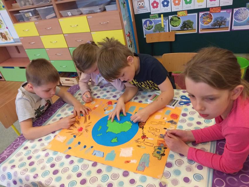 Dzisiaj w grupie Misiów wykonywaliśmy pracę plastyczną w małych zespołach. Przedszkolaki na zajęciach poznały w jaki sposób każdy z nas w codziennych czynnościach może dbać o środowisko naturalne i troszczyć się o naszą planetę. Dzieci z zapałem przenosiły swoje pomysły na wspólną pracę, dwie grupy rysowały co szkodzi naszej planecie, a dwie co sprzyja życiu na Ziemi. Wszystkie pomysły były trafne i ciekawe.