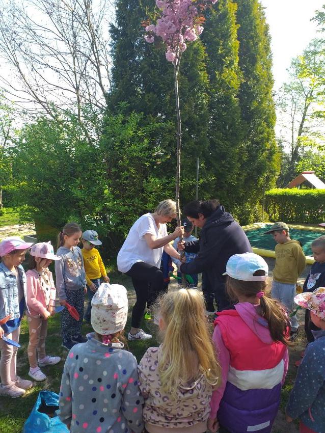 Przedszkolaki w ramach tematu kompleksowego DBAMY O NASZĄ PLANETĘ posadziły w ogrodzie przedszkolnym drzewo, pięknie kwitnącą wiśnię. Jest to nasza cegiełka w ochronę przyrody i praktyczne szerzenie świadomości ekologicznej wśród najmłodszych. Będziemy monitorować jego wzrost i systematycznie podlewać. Teraz każde wyjście do odrodu połączone będzie z obserwacją stanu posadzonego drzewa. A dzieci, które pójdą do szkoły obiecały, że będą nas odwiedzać i zaglądać na nasze MISIOWE DRZEWO.
