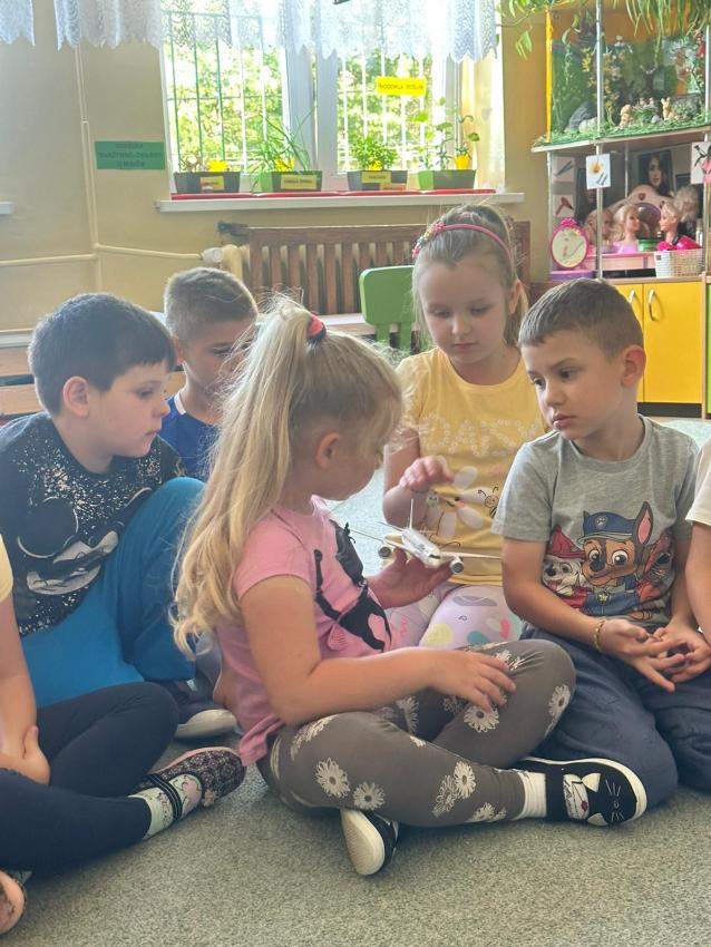 Dzisiaj na zajęciach gościliśmy tatę Emilki, który opowiadał o samolotach i podzielił się z nami ciekawostkami związanymi z lataniem. Przedszkolaki z wielkim zainteresowaniem słuchały, następnie odlądały atrapę silnika samolotu. Rodzice przygotowali również naklejki, kolorowanki oraz różne rodzaje samolotów z papieru, które dzieci ochoczo wprawiały w ruch. Na koniec był poczęstunek, mama Emilki upiekła ciasteczka w kształcie latających maszyn.