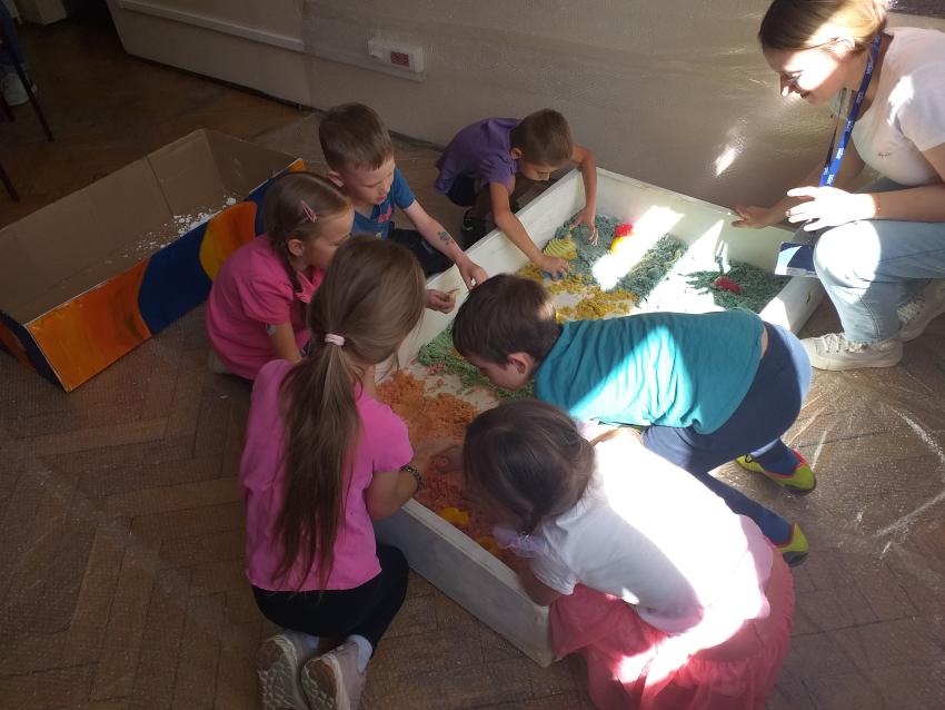 Przedszkolaki kształtują umiejetność współdziałania w małych zespołach zadaniowych. Wykonują tło do pracy plastycznej JEŻOWE KOLCE metodą edukacji przez ruch wg D. Dziamskiej.