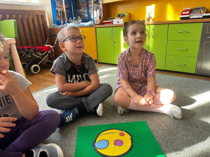 Przedszkolaki na zajęciach matematycznych rozpoznawały kształty w otoczeniu. W nawiązaniu do Dnia Kropki dzieci w parach układały obrazki pocięte na części. Pomagając sobie wzajemnie wszystkim udało się ułożyć kształt koła. Następnie każdy zespół przeliczał ilość kropek w swoim kole.