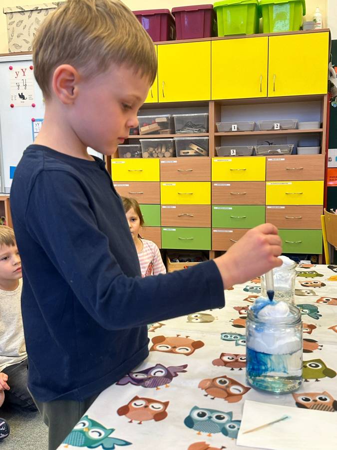 Grupa Mróweczki utrwalała zjawisko powstawiania deszcz podczas doświadczenia z barwnikiem spożywczym, pianką i wodą.