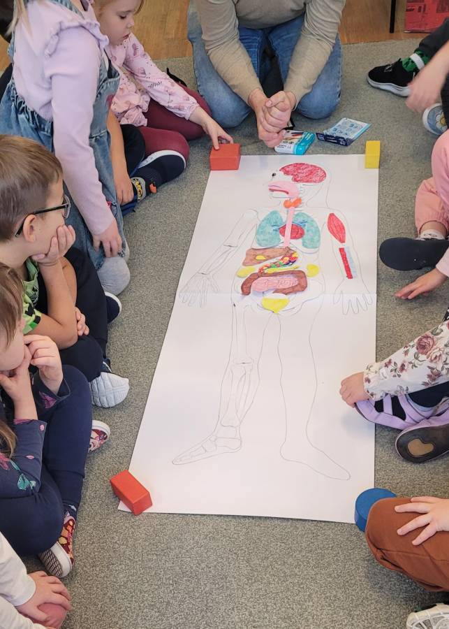 W dniu dzisiejszym naszą grupę odwiedził tata Alicji - Pan Michał, który pracuje jako chirurg. Przedszkolaki wspólnie układały puzzle będące narządami ciała człowieka. Wykazały się ogromną wiedzą na ten temat. Następnie każde dziecko losowało przedmiot o którym Pan Michał opowiadał do czego służą. Znalazły się tam między innymi wenflon, bandaż czy koc ratunkowy. Pluszowy piesek okazał się dzielnym pacjentem, dzięki któremu dzięki zobaczyły jak zakłada się kroplówkę oraz w jakich przypadkach się ją stosuje. Chętni mogli zmierzyć ciśnienie i, owijać się bandażem a także przybić prawdziwą pieczątkę lekarza na recepcie. Największą atrakcją był pokaz zszywania rany na bananie. Wymaga to wielkiej precyzji i skupienia. Każdy z przedszkolaków otrzymał naklejkę dzielnego pacjenta.